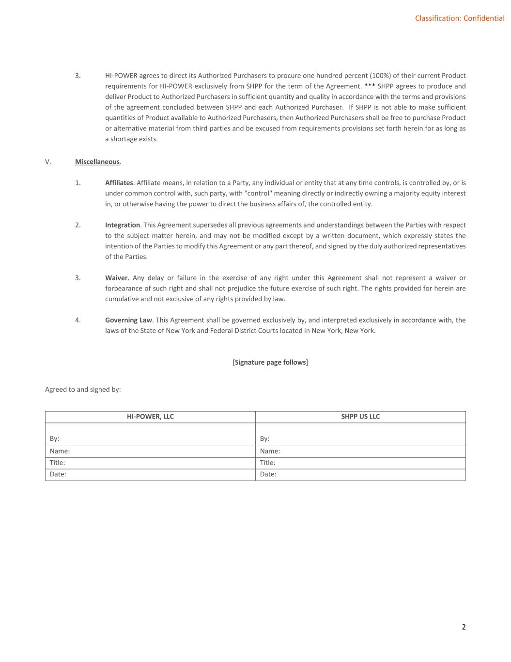 2 Classification: Confidential 3. HI-POWER agrees to direct its Authorized Purchasers to procure one hundred percent (100%) of their current Product requirements for HI-POWER exclusively from SHPP for the term of the Agreement. *** SHPP agrees to produce and deliver Product to Authorized Purchasers in sufficient quantity and quality in accordance with the terms and provisions of the agreement concluded between SHPP and each Authorized Purchaser. If SHPP is not able to make sufficient quantities of Product available to Authorized Purchasers, then Authorized Purchasers shall be free to purchase Product or alternative material from third parties and be excused from requirements provisions set forth herein for as long as a shortage exists. V. Miscellaneous. 1. Affiliates. Affiliate means, in relation to a Party, any individual or entity that at any time controls, is controlled by, or is under common control with, such party, with "control" meaning directly or indirectly owning a majority equity interest in, or otherwise having the power to direct the business affairs of, the controlled entity. 2. Integration. This Agreement supersedes all previous agreements and understandings between the Parties with respect to the subject matter herein, and may not be modified except by a written document, which expressly states the intention of the Parties to modify this Agreement or any part thereof, and signed by the duly authorized representatives of the Parties. 3. Waiver. Any delay or failure in the exercise of any right under this Agreement shall not represent a waiver or forbearance of such right and shall not prejudice the future exercise of such right. The rights provided for herein are cumulative and not exclusive of any rights provided by law. 4. Governing Law. This Agreement shall be governed exclusively by, and interpreted exclusively in accordance with, the laws of the State of New York and Federal District Courts located in New York, New York. [Signature page follows] Agreed to and signed by: HI-POWER, LLC SHPP US LLC By: By: Name: Name: Title: Title: Date: Date: