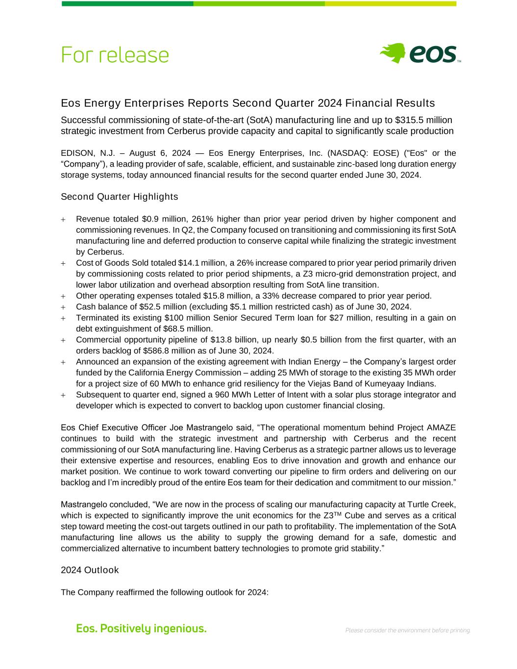 Eos Energy Enterprises Reports Second Quarter 2024 Financial Results Successful commissioning of state-of-the-art (SotA) manufacturing line and up to $315.5 million strategic investment from Cerberus provide capacity and capital to significantly scale production EDISON, N.J. – August 6, 2024 — Eos Energy Enterprises, Inc. (NASDAQ: EOSE) ("Eos" or the “Company”), a leading provider of safe, scalable, efficient, and sustainable zinc-based long duration energy storage systems, today announced financial results for the second quarter ended June 30, 2024. Second Quarter Highlights + Revenue totaled $0.9 million, 261% higher than prior year period driven by higher component and commissioning revenues. In Q2, the Company focused on transitioning and commissioning its first SotA manufacturing line and deferred production to conserve capital while finalizing the strategic investment by Cerberus. + Cost of Goods Sold totaled $14.1 million, a 26% increase compared to prior year period primarily driven by commissioning costs related to prior period shipments, a Z3 micro-grid demonstration project, and lower labor utilization and overhead absorption resulting from SotA line transition. + Other operating expenses totaled $15.8 million, a 33% decrease compared to prior year period. + Cash balance of $52.5 million (excluding $5.1 million restricted cash) as of June 30, 2024. + Terminated its existing $100 million Senior Secured Term loan for $27 million, resulting in a gain on debt extinguishment of $68.5 million. + Commercial opportunity pipeline of $13.8 billion, up nearly $0.5 billion from the first quarter, with an orders backlog of $586.8 million as of June 30, 2024. + Announced an expansion of the existing agreement with Indian Energy – the Company’s largest order funded by the California Energy Commission – adding 25 MWh of storage to the existing 35 MWh order for a project size of 60 MWh to enhance grid resiliency for the Viejas Band of Kumeyaay Indians. + Subsequent to quarter end, signed a 960 MWh Letter of Intent with a solar plus storage integrator and developer which is expected to convert to backlog upon customer financial closing. Eos Chief Executive Officer Joe Mastrangelo said, “The operational momentum behind Project AMAZE continues to build with the strategic investment and partnership with Cerberus and the recent commissioning of our SotA manufacturing line. Having Cerberus as a strategic partner allows us to leverage their extensive expertise and resources, enabling Eos to drive innovation and growth and enhance our market position. We continue to work toward converting our pipeline to firm orders and delivering on our backlog and I’m incredibly proud of the entire Eos team for their dedication and commitment to our mission.” Mastrangelo concluded, “We are now in the process of scaling our manufacturing capacity at Turtle Creek, which is expected to significantly improve the unit economics for the Z3TM Cube and serves as a critical step toward meeting the cost-out targets outlined in our path to profitability. The implementation of the SotA manufacturing line allows us the ability to supply the growing demand for a safe, domestic and commercialized alternative to incumbent battery technologies to promote grid stability.” 2024 Outlook The Company reaffirmed the following outlook for 2024:
