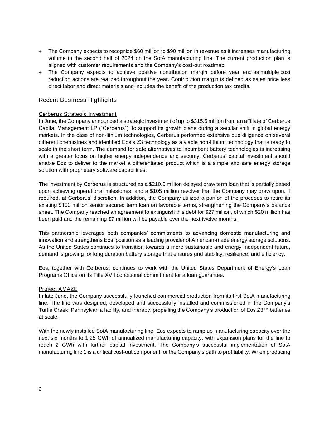 2 + The Company expects to recognize $60 million to $90 million in revenue as it increases manufacturing volume in the second half of 2024 on the SotA manufacturing line. The current production plan is aligned with customer requirements and the Company’s cost-out roadmap. + The Company expects to achieve positive contribution margin before year end as multiple cost reduction actions are realized throughout the year. Contribution margin is defined as sales price less direct labor and direct materials and includes the benefit of the production tax credits. Recent Business Highlights Cerberus Strategic Investment In June, the Company announced a strategic investment of up to $315.5 million from an affiliate of Cerberus Capital Management LP (“Cerberus”), to support its growth plans during a secular shift in global energy markets. In the case of non-lithium technologies, Cerberus performed extensive due diligence on several different chemistries and identified Eos’s Z3 technology as a viable non-lithium technology that is ready to scale in the short term. The demand for safe alternatives to incumbent battery technologies is increasing with a greater focus on higher energy independence and security. Cerberus’ capital investment should enable Eos to deliver to the market a differentiated product which is a simple and safe energy storage solution with proprietary software capabilities. The investment by Cerberus is structured as a $210.5 million delayed draw term loan that is partially based upon achieving operational milestones, and a $105 million revolver that the Company may draw upon, if required, at Cerberus’ discretion. In addition, the Company utilized a portion of the proceeds to retire its existing $100 million senior secured term loan on favorable terms, strengthening the Company’s balance sheet. The Company reached an agreement to extinguish this debt for $27 million, of which $20 million has been paid and the remaining $7 million will be payable over the next twelve months. This partnership leverages both companies’ commitments to advancing domestic manufacturing and innovation and strengthens Eos’ position as a leading provider of American-made energy storage solutions. As the United States continues to transition towards a more sustainable and energy independent future, demand is growing for long duration battery storage that ensures grid stability, resilience, and efficiency. Eos, together with Cerberus, continues to work with the United States Department of Energy’s Loan Programs Office on its Title XVII conditional commitment for a loan guarantee. Project AMAZE In late June, the Company successfully launched commercial production from its first SotA manufacturing line. The line was designed, developed and successfully installed and commissioned in the Company’s Turtle Creek, Pennsylvania facility, and thereby, propelling the Company’s production of Eos Z3TM batteries at scale. With the newly installed SotA manufacturing line, Eos expects to ramp up manufacturing capacity over the next six months to 1.25 GWh of annualized manufacturing capacity, with expansion plans for the line to reach 2 GWh with further capital investment. The Company’s successful implementation of SotA manufacturing line 1 is a critical cost-out component for the Company’s path to profitability. When producing
