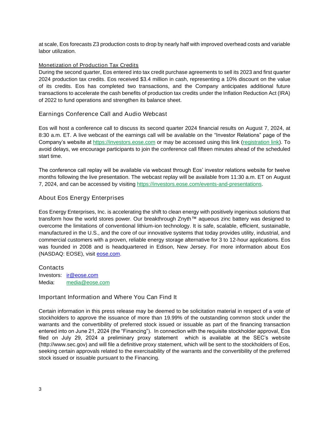 3 at scale, Eos forecasts Z3 production costs to drop by nearly half with improved overhead costs and variable labor utilization. Monetization of Production Tax Credits During the second quarter, Eos entered into tax credit purchase agreements to sell its 2023 and first quarter 2024 production tax credits. Eos received $3.4 million in cash, representing a 10% discount on the value of its credits. Eos has completed two transactions, and the Company anticipates additional future transactions to accelerate the cash benefits of production tax credits under the Inflation Reduction Act (IRA) of 2022 to fund operations and strengthen its balance sheet. Earnings Conference Call and Audio Webcast Eos will host a conference call to discuss its second quarter 2024 financial results on August 7, 2024, at 8:30 a.m. ET. A live webcast of the earnings call will be available on the “Investor Relations” page of the Company’s website at https://investors.eose.com or may be accessed using this link (registration link). To avoid delays, we encourage participants to join the conference call fifteen minutes ahead of the scheduled start time. The conference call replay will be available via webcast through Eos’ investor relations website for twelve months following the live presentation. The webcast replay will be available from 11:30 a.m. ET on August 7, 2024, and can be accessed by visiting https://investors.eose.com/events-and-presentations. About Eos Energy Enterprises Eos Energy Enterprises, Inc. is accelerating the shift to clean energy with positively ingenious solutions that transform how the world stores power. Our breakthrough Znyth™ aqueous zinc battery was designed to overcome the limitations of conventional lithium-ion technology. It is safe, scalable, efficient, sustainable, manufactured in the U.S., and the core of our innovative systems that today provides utility, industrial, and commercial customers with a proven, reliable energy storage alternative for 3 to 12-hour applications. Eos was founded in 2008 and is headquartered in Edison, New Jersey. For more information about Eos (NASDAQ: EOSE), visit eose.com. Contacts Investors: ir@eose.com Media: media@eose.com Important Information and Where You Can Find It Certain information in this press release may be deemed to be solicitation material in respect of a vote of stockholders to approve the issuance of more than 19.99% of the outstanding common stock under the warrants and the convertibility of preferred stock issued or issuable as part of the financing transaction entered into on June 21, 2024 (the “Financing”). In connection with the requisite stockholder approval, Eos filed on July 29, 2024 a preliminary proxy statement which is available at the SEC’s website (http://www.sec.gov) and will file a definitive proxy statement, which will be sent to the stockholders of Eos, seeking certain approvals related to the exercisability of the warrants and the convertibility of the preferred stock issued or issuable pursuant to the Financing.