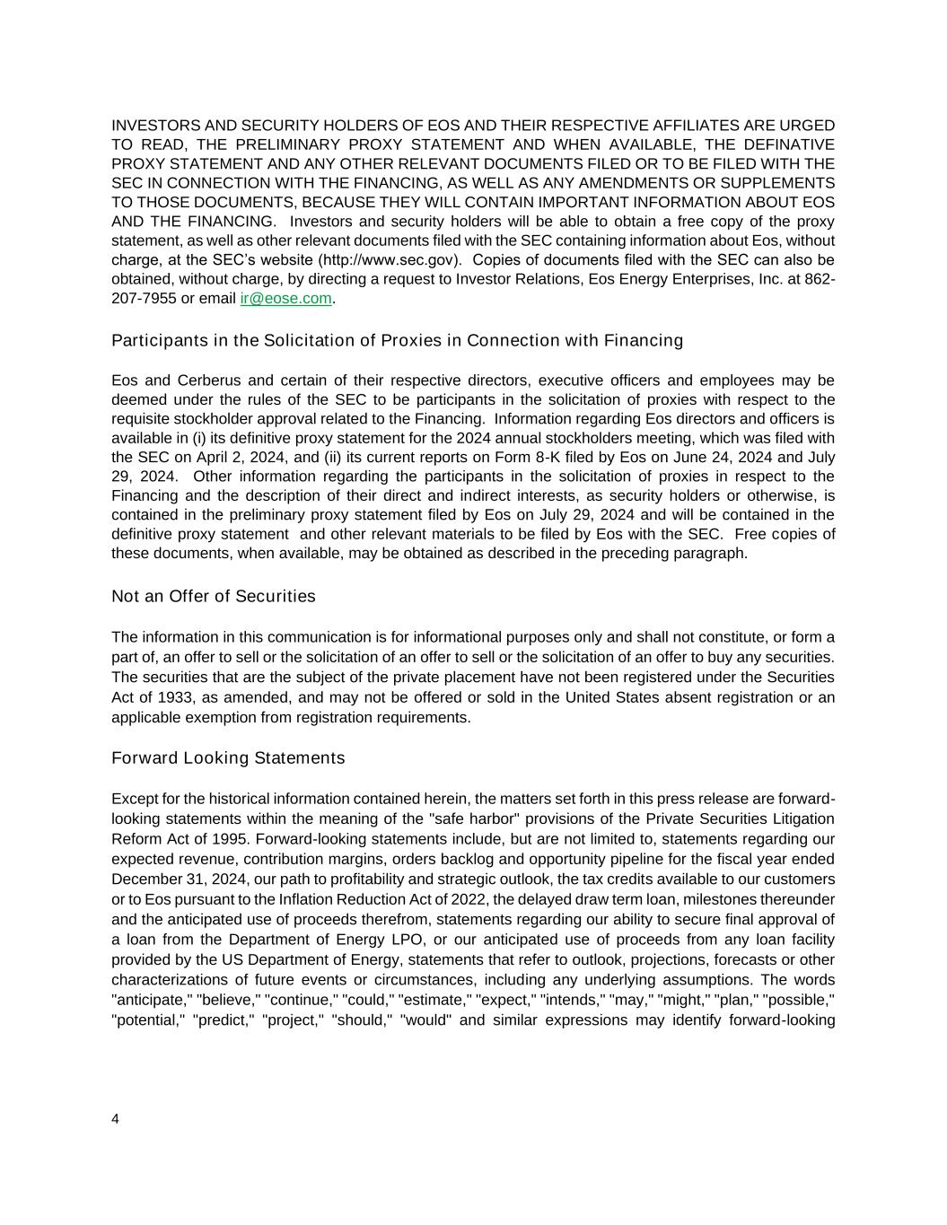 4 INVESTORS AND SECURITY HOLDERS OF EOS AND THEIR RESPECTIVE AFFILIATES ARE URGED TO READ, THE PRELIMINARY PROXY STATEMENT AND WHEN AVAILABLE, THE DEFINATIVE PROXY STATEMENT AND ANY OTHER RELEVANT DOCUMENTS FILED OR TO BE FILED WITH THE SEC IN CONNECTION WITH THE FINANCING, AS WELL AS ANY AMENDMENTS OR SUPPLEMENTS TO THOSE DOCUMENTS, BECAUSE THEY WILL CONTAIN IMPORTANT INFORMATION ABOUT EOS AND THE FINANCING. Investors and security holders will be able to obtain a free copy of the proxy statement, as well as other relevant documents filed with the SEC containing information about Eos, without charge, at the SEC’s website (http://www.sec.gov). Copies of documents filed with the SEC can also be obtained, without charge, by directing a request to Investor Relations, Eos Energy Enterprises, Inc. at 862- 207-7955 or email ir@eose.com. Participants in the Solicitation of Proxies in Connection with Financing Eos and Cerberus and certain of their respective directors, executive officers and employees may be deemed under the rules of the SEC to be participants in the solicitation of proxies with respect to the requisite stockholder approval related to the Financing. Information regarding Eos directors and officers is available in (i) its definitive proxy statement for the 2024 annual stockholders meeting, which was filed with the SEC on April 2, 2024, and (ii) its current reports on Form 8-K filed by Eos on June 24, 2024 and July 29, 2024. Other information regarding the participants in the solicitation of proxies in respect to the Financing and the description of their direct and indirect interests, as security holders or otherwise, is contained in the preliminary proxy statement filed by Eos on July 29, 2024 and will be contained in the definitive proxy statement and other relevant materials to be filed by Eos with the SEC. Free copies of these documents, when available, may be obtained as described in the preceding paragraph. Not an Offer of Securities The information in this communication is for informational purposes only and shall not constitute, or form a part of, an offer to sell or the solicitation of an offer to sell or the solicitation of an offer to buy any securities. The securities that are the subject of the private placement have not been registered under the Securities Act of 1933, as amended, and may not be offered or sold in the United States absent registration or an applicable exemption from registration requirements. Forward Looking Statements Except for the historical information contained herein, the matters set forth in this press release are forward- looking statements within the meaning of the "safe harbor" provisions of the Private Securities Litigation Reform Act of 1995. Forward-looking statements include, but are not limited to, statements regarding our expected revenue, contribution margins, orders backlog and opportunity pipeline for the fiscal year ended December 31, 2024, our path to profitability and strategic outlook, the tax credits available to our customers or to Eos pursuant to the Inflation Reduction Act of 2022, the delayed draw term loan, milestones thereunder and the anticipated use of proceeds therefrom, statements regarding our ability to secure final approval of a loan from the Department of Energy LPO, or our anticipated use of proceeds from any loan facility provided by the US Department of Energy, statements that refer to outlook, projections, forecasts or other characterizations of future events or circumstances, including any underlying assumptions. The words "anticipate," "believe," "continue," "could," "estimate," "expect," "intends," "may," "might," "plan," "possible," "potential," "predict," "project," "should," "would" and similar expressions may identify forward-looking