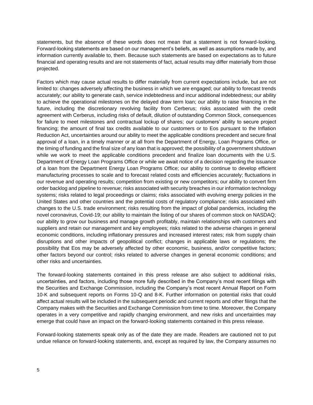 5 statements, but the absence of these words does not mean that a statement is not forward-looking. Forward-looking statements are based on our management’s beliefs, as well as assumptions made by, and information currently available to, them. Because such statements are based on expectations as to future financial and operating results and are not statements of fact, actual results may differ materially from those projected. Factors which may cause actual results to differ materially from current expectations include, but are not limited to: changes adversely affecting the business in which we are engaged; our ability to forecast trends accurately; our ability to generate cash, service indebtedness and incur additional indebtedness; our ability to achieve the operational milestones on the delayed draw term loan; our ability to raise financing in the future, including the discretionary revolving facility from Cerberus; risks associated with the credit agreement with Cerberus, including risks of default, dilution of outstanding Common Stock, consequences for failure to meet milestones and contractual lockup of shares; our customers’ ability to secure project financing; the amount of final tax credits available to our customers or to Eos pursuant to the Inflation Reduction Act, uncertainties around our ability to meet the applicable conditions precedent and secure final approval of a loan, in a timely manner or at all from the Department of Energy, Loan Programs Office, or the timing of funding and the final size of any loan that is approved; the possibility of a government shutdown while we work to meet the applicable conditions precedent and finalize loan documents with the U.S. Department of Energy Loan Programs Office or while we await notice of a decision regarding the issuance of a loan from the Department Energy Loan Programs Office; our ability to continue to develop efficient manufacturing processes to scale and to forecast related costs and efficiencies accurately; fluctuations in our revenue and operating results; competition from existing or new competitors; our ability to convert firm order backlog and pipeline to revenue; risks associated with security breaches in our information technology systems; risks related to legal proceedings or claims; risks associated with evolving energy policies in the United States and other countries and the potential costs of regulatory compliance; risks associated with changes to the U.S. trade environment; risks resulting from the impact of global pandemics, including the novel coronavirus, Covid-19; our ability to maintain the listing of our shares of common stock on NASDAQ; our ability to grow our business and manage growth profitably, maintain relationships with customers and suppliers and retain our management and key employees; risks related to the adverse changes in general economic conditions, including inflationary pressures and increased interest rates; risk from supply chain disruptions and other impacts of geopolitical conflict; changes in applicable laws or regulations; the possibility that Eos may be adversely affected by other economic, business, and/or competitive factors; other factors beyond our control; risks related to adverse changes in general economic conditions; and other risks and uncertainties. The forward-looking statements contained in this press release are also subject to additional risks, uncertainties, and factors, including those more fully described in the Company’s most recent filings with the Securities and Exchange Commission, including the Company’s most recent Annual Report on Form 10-K and subsequent reports on Forms 10-Q and 8-K. Further information on potential risks that could affect actual results will be included in the subsequent periodic and current reports and other filings that the Company makes with the Securities and Exchange Commission from time to time. Moreover, the Company operates in a very competitive and rapidly changing environment, and new risks and uncertainties may emerge that could have an impact on the forward-looking statements contained in this press release. Forward-looking statements speak only as of the date they are made. Readers are cautioned not to put undue reliance on forward-looking statements, and, except as required by law, the Company assumes no