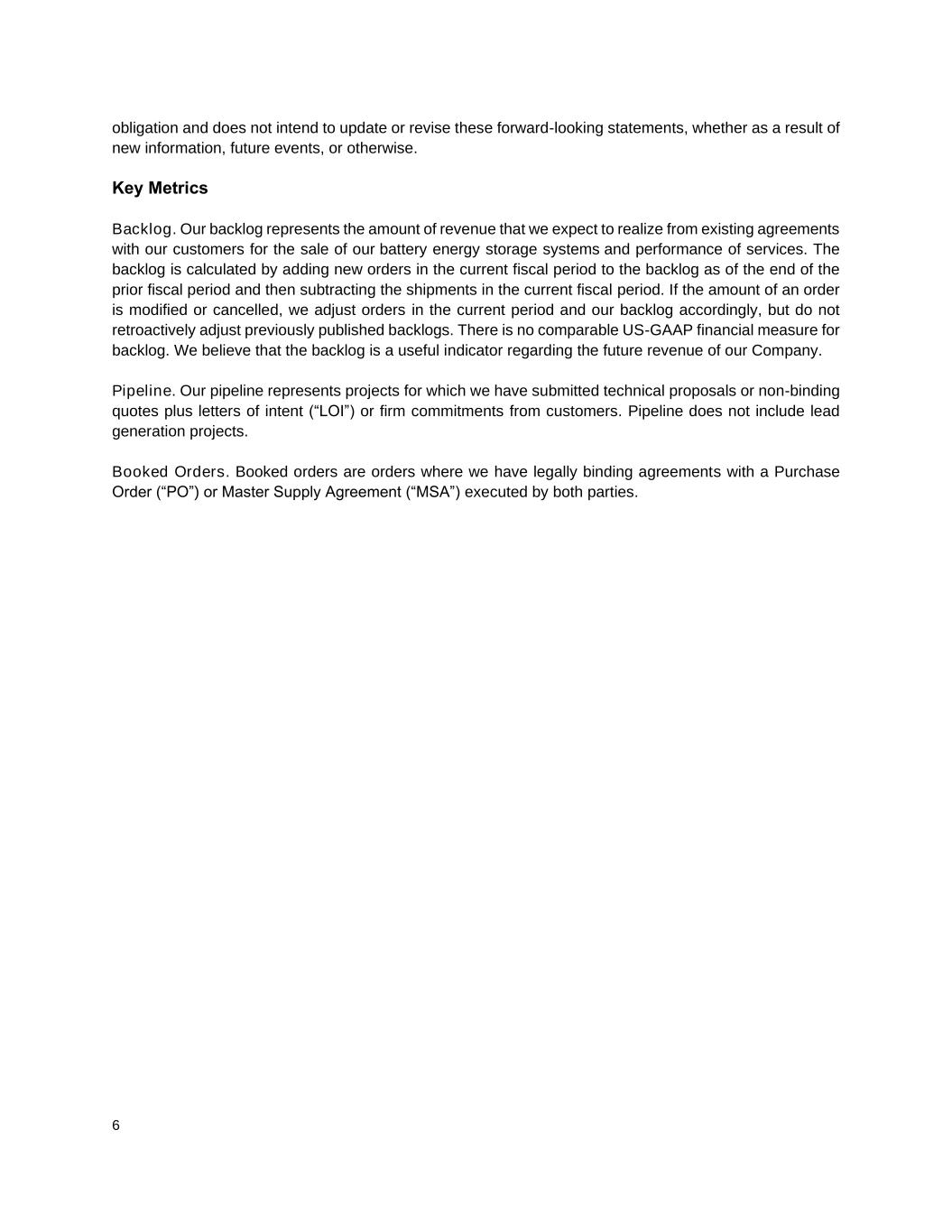 6 obligation and does not intend to update or revise these forward-looking statements, whether as a result of new information, future events, or otherwise. Key Metrics Backlog. Our backlog represents the amount of revenue that we expect to realize from existing agreements with our customers for the sale of our battery energy storage systems and performance of services. The backlog is calculated by adding new orders in the current fiscal period to the backlog as of the end of the prior fiscal period and then subtracting the shipments in the current fiscal period. If the amount of an order is modified or cancelled, we adjust orders in the current period and our backlog accordingly, but do not retroactively adjust previously published backlogs. There is no comparable US-GAAP financial measure for backlog. We believe that the backlog is a useful indicator regarding the future revenue of our Company. Pipeline. Our pipeline represents projects for which we have submitted technical proposals or non-binding quotes plus letters of intent (“LOI”) or firm commitments from customers. Pipeline does not include lead generation projects. Booked Orders. Booked orders are orders where we have legally binding agreements with a Purchase Order (“PO”) or Master Supply Agreement (“MSA”) executed by both parties.