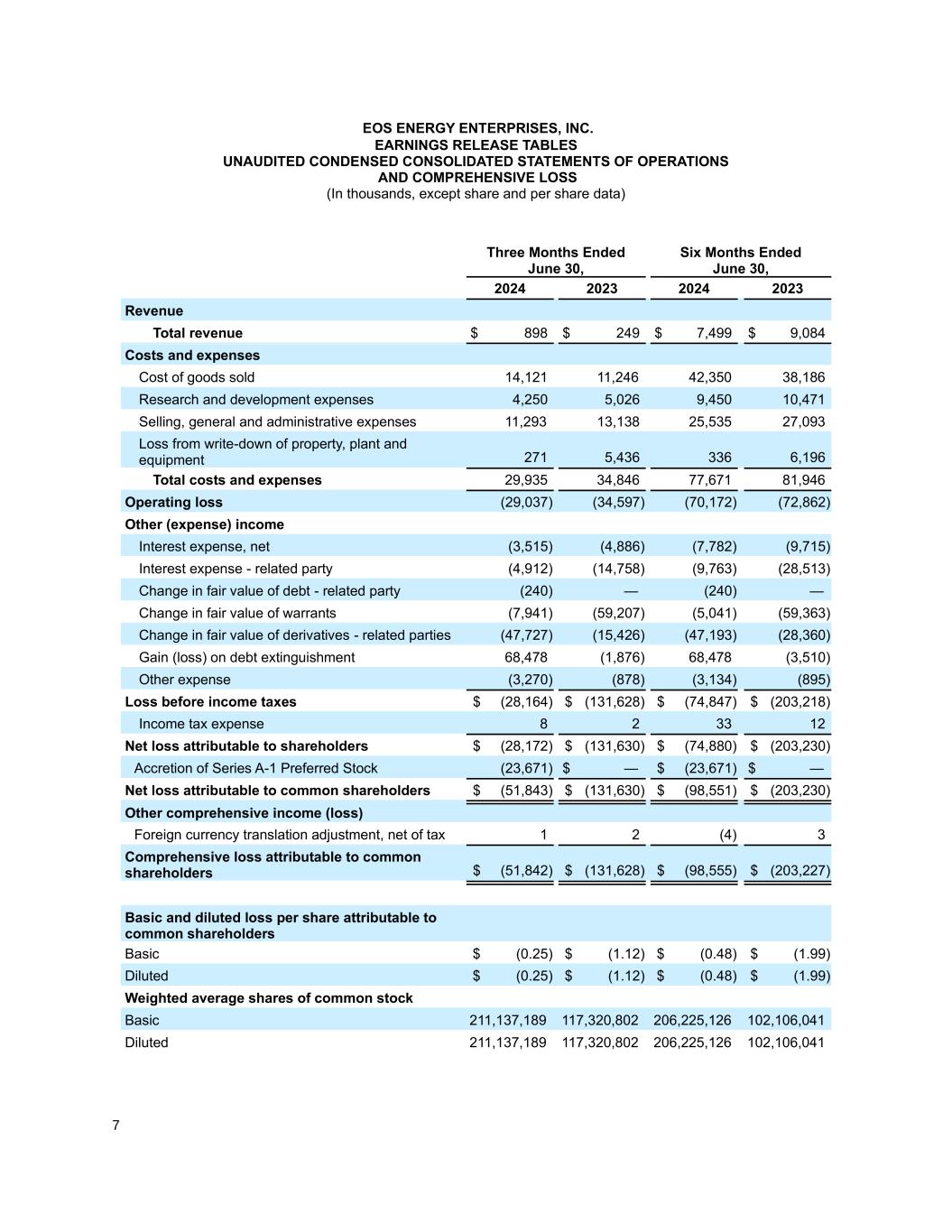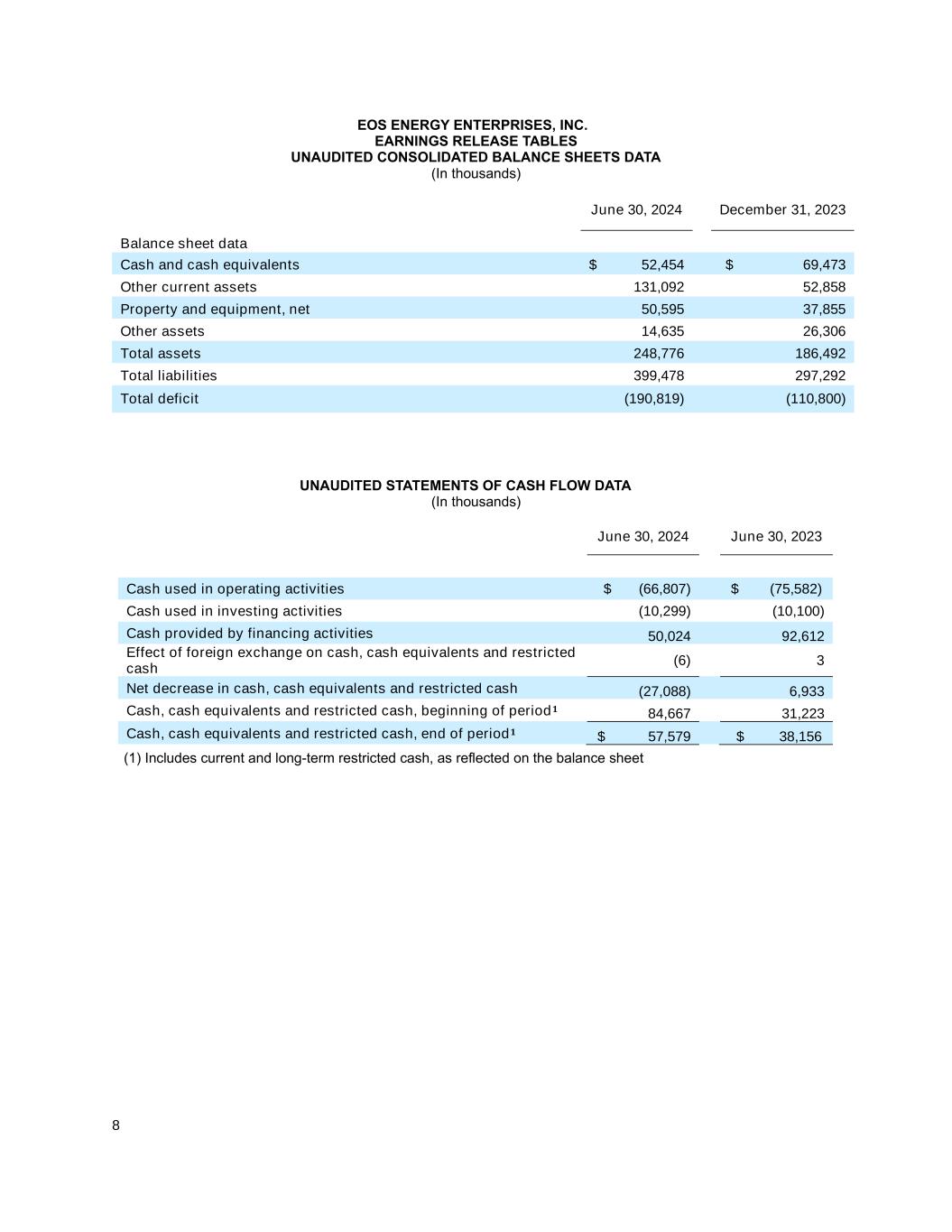 7 EOS ENERGY ENTERPRISES, INC. EARNINGS RELEASE TABLES UNAUDITED CONDENSED CONSOLIDATED STATEMENTS OF OPERATIONS AND COMPREHENSIVE LOSS (In thousands, except share and per share data) Three Months Ended June 30, Six Months Ended June 30, 2024 2023 2024 2023 Revenue Total revenue $ 898 $ 249 $ 7,499 $ 9,084 Costs and expenses Cost of goods sold 14,121 11,246 42,350 38,186 Research and development expenses 4,250 5,026 9,450 10,471 Selling, general and administrative expenses 11,293 13,138 25,535 27,093 Loss from write-down of property, plant and equipment 271 5,436 336 6,196 Total costs and expenses 29,935 34,846 77,671 81,946 Operating loss (29,037) (34,597) (70,172) (72,862) Other (expense) income Interest expense, net (3,515) (4,886) (7,782) (9,715) Interest expense - related party (4,912) (14,758) (9,763) (28,513) Change in fair value of debt - related party (240) — (240) — Change in fair value of warrants (7,941) (59,207) (5,041) (59,363) Change in fair value of derivatives - related parties (47,727) (15,426) (47,193) (28,360) Gain (loss) on debt extinguishment 68,478 (1,876) 68,478 (3,510) Other expense (3,270) (878) (3,134) (895) Loss before income taxes $ (28,164) $ (131,628) $ (74,847) $ (203,218) Income tax expense 8 2 33 12 Net loss attributable to shareholders $ (28,172) $ (131,630) $ (74,880) $ (203,230) Accretion of Series A-1 Preferred Stock (23,671) $ — $ (23,671) $ — Net loss attributable to common shareholders $ (51,843) $ (131,630) $ (98,551) $ (203,230) Other comprehensive income (loss) Foreign currency translation adjustment, net of tax 1 2 (4) 3 Comprehensive loss attributable to common shareholders $ (51,842) $ (131,628) $ (98,555) $ (203,227) Basic and diluted loss per share attributable to common shareholders Basic $ (0.25) $ (1.12) $ (0.48) $ (1.99) Diluted $ (0.25) $ (1.12) $ (0.48) $ (1.99) Weighted average shares of common stock Basic 211,137,189 117,320,802 206,225,126 102,106,041 Diluted 211,137,189 117,320,802 206,225,126 102,106,041