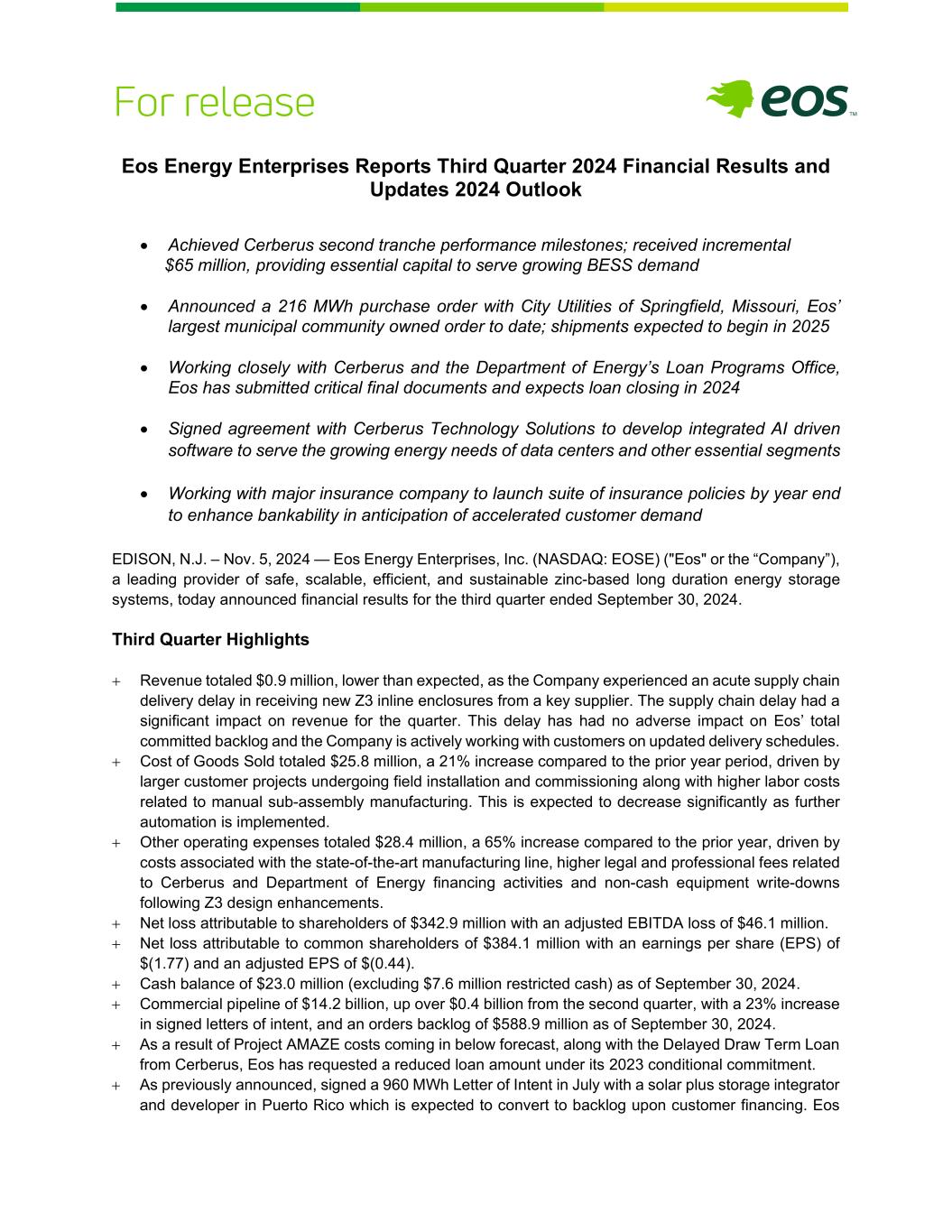 Eos Energy Enterprises Reports Third Quarter 2024 Financial Results and Updates 2024 Outlook • Achieved Cerberus second tranche performance milestones; received incremental $65 million, providing essential capital to serve growing BESS demand • Announced a 216 MWh purchase order with City Utilities of Springfield, Missouri, Eos’ largest municipal community owned order to date; shipments expected to begin in 2025 • Working closely with Cerberus and the Department of Energy’s Loan Programs Office, Eos has submitted critical final documents and expects loan closing in 2024 • Signed agreement with Cerberus Technology Solutions to develop integrated AI driven software to serve the growing energy needs of data centers and other essential segments • Working with major insurance company to launch suite of insurance policies by year end to enhance bankability in anticipation of accelerated customer demand EDISON, N.J. – Nov. 5, 2024 — Eos Energy Enterprises, Inc. (NASDAQ: EOSE) ("Eos" or the “Company”), a leading provider of safe, scalable, efficient, and sustainable zinc-based long duration energy storage systems, today announced financial results for the third quarter ended September 30, 2024. Third Quarter Highlights + Revenue totaled $0.9 million, lower than expected, as the Company experienced an acute supply chain delivery delay in receiving new Z3 inline enclosures from a key supplier. The supply chain delay had a significant impact on revenue for the quarter. This delay has had no adverse impact on Eos’ total committed backlog and the Company is actively working with customers on updated delivery schedules. + Cost of Goods Sold totaled $25.8 million, a 21% increase compared to the prior year period, driven by larger customer projects undergoing field installation and commissioning along with higher labor costs related to manual sub-assembly manufacturing. This is expected to decrease significantly as further automation is implemented. + Other operating expenses totaled $28.4 million, a 65% increase compared to the prior year, driven by costs associated with the state-of-the-art manufacturing line, higher legal and professional fees related to Cerberus and Department of Energy financing activities and non-cash equipment write-downs following Z3 design enhancements. + Net loss attributable to shareholders of $342.9 million with an adjusted EBITDA loss of $46.1 million. + Net loss attributable to common shareholders of $384.1 million with an earnings per share (EPS) of $(1.77) and an adjusted EPS of $(0.44). + Cash balance of $23.0 million (excluding $7.6 million restricted cash) as of September 30, 2024. + Commercial pipeline of $14.2 billion, up over $0.4 billion from the second quarter, with a 23% increase in signed letters of intent, and an orders backlog of $588.9 million as of September 30, 2024. + As a result of Project AMAZE costs coming in below forecast, along with the Delayed Draw Term Loan from Cerberus, Eos has requested a reduced loan amount under its 2023 conditional commitment. + As previously announced, signed a 960 MWh Letter of Intent in July with a solar plus storage integrator and developer in Puerto Rico which is expected to convert to backlog upon customer financing. Eos