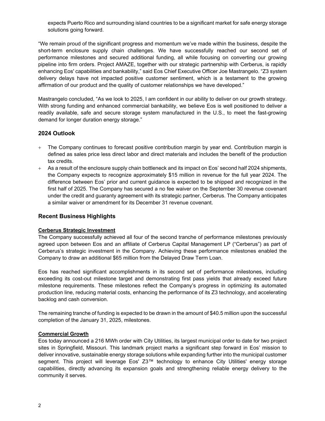 2 expects Puerto Rico and surrounding island countries to be a significant market for safe energy storage solutions going forward. “We remain proud of the significant progress and momentum we’ve made within the business, despite the short-term enclosure supply chain challenges. We have successfully reached our second set of performance milestones and secured additional funding, all while focusing on converting our growing pipeline into firm orders. Project AMAZE, together with our strategic partnership with Cerberus, is rapidly enhancing Eos' capabilities and bankability,” said Eos Chief Executive Officer Joe Mastrangelo. “Z3 system delivery delays have not impacted positive customer sentiment, which is a testament to the growing affirmation of our product and the quality of customer relationships we have developed.” Mastrangelo concluded, “As we look to 2025, I am confident in our ability to deliver on our growth strategy. With strong funding and enhanced commercial bankability, we believe Eos is well positioned to deliver a readily available, safe and secure storage system manufactured in the U.S., to meet the fast-growing demand for longer duration energy storage.” 2024 Outlook + The Company continues to forecast positive contribution margin by year end. Contribution margin is defined as sales price less direct labor and direct materials and includes the benefit of the production tax credits. + As a result of the enclosure supply chain bottleneck and its impact on Eos’ second half 2024 shipments, the Company expects to recognize approximately $15 million in revenue for the full year 2024. The difference between Eos’ prior and current guidance is expected to be shipped and recognized in the first half of 2025. The Company has secured a no fee waiver on the September 30 revenue covenant under the credit and guaranty agreement with its strategic partner, Cerberus. The Company anticipates a similar waiver or amendment for its December 31 revenue covenant. Recent Business Highlights Cerberus Strategic Investment The Company successfully achieved all four of the second tranche of performance milestones previously agreed upon between Eos and an affiliate of Cerberus Capital Management LP (“Cerberus”) as part of Cerberus’s strategic investment in the Company. Achieving these performance milestones enabled the Company to draw an additional $65 million from the Delayed Draw Term Loan. Eos has reached significant accomplishments in its second set of performance milestones, including exceeding its cost-out milestone target and demonstrating first pass yields that already exceed future milestone requirements. These milestones reflect the Company’s progress in optimizing its automated production line, reducing material costs, enhancing the performance of its Z3 technology, and accelerating backlog and cash conversion. The remaining tranche of funding is expected to be drawn in the amount of $40.5 million upon the successful completion of the January 31, 2025, milestones. Commercial Growth Eos today announced a 216 MWh order with City Utilities, its largest municipal order to date for two project sites in Springfield, Missouri. This landmark project marks a significant step forward in Eos’ mission to deliver innovative, sustainable energy storage solutions while expanding further into the municipal customer segment. This project will leverage Eos' Z3™ technology to enhance City Utilities' energy storage capabilities, directly advancing its expansion goals and strengthening reliable energy delivery to the community it serves.