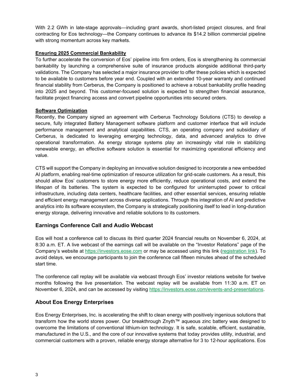 3 With 2.2 GWh in late-stage approvals—including grant awards, short-listed project closures, and final contracting for Eos technology—the Company continues to advance its $14.2 billion commercial pipeline with strong momentum across key markets. Ensuring 2025 Commercial Bankability To further accelerate the conversion of Eos’ pipeline into firm orders, Eos is strengthening its commercial bankability by launching a comprehensive suite of insurance products alongside additional third-party validations. The Company has selected a major insurance provider to offer these policies which is expected to be available to customers before year end. Coupled with an extended 10-year warranty and continued financial stability from Cerberus, the Company is positioned to achieve a robust bankability profile heading into 2025 and beyond. This customer-focused solution is expected to strengthen financial assurance, facilitate project financing access and convert pipeline opportunities into secured orders. Software Optimization Recently, the Company signed an agreement with Cerberus Technology Solutions (CTS) to develop a secure, fully integrated Battery Management software platform and customer interface that will include performance management and analytical capabilities. CTS, an operating company and subsidiary of Cerberus, is dedicated to leveraging emerging technology, data, and advanced analytics to drive operational transformation. As energy storage systems play an increasingly vital role in stabilizing renewable energy, an effective software solution is essential for maximizing operational efficiency and value. CTS will support the Company in deploying an innovative solution designed to incorporate a new embedded AI platform, enabling real-time optimization of resource utilization for grid-scale customers. As a result, this should allow Eos’ customers to store energy more efficiently, reduce operational costs, and extend the lifespan of its batteries. The system is expected to be configured for uninterrupted power to critical infrastructure, including data centers, healthcare facilities, and other essential services, ensuring reliable and efficient energy management across diverse applications. Through this integration of AI and predictive analytics into its software ecosystem, the Company is strategically positioning itself to lead in long-duration energy storage, delivering innovative and reliable solutions to its customers. Earnings Conference Call and Audio Webcast Eos will host a conference call to discuss its third quarter 2024 financial results on November 6, 2024, at 8:30 a.m. ET. A live webcast of the earnings call will be available on the “Investor Relations” page of the Company’s website at https://investors.eose.com or may be accessed using this link (registration link). To avoid delays, we encourage participants to join the conference call fifteen minutes ahead of the scheduled start time. The conference call replay will be available via webcast through Eos’ investor relations website for twelve months following the live presentation. The webcast replay will be available from 11:30 a.m. ET on November 6, 2024, and can be accessed by visiting https://investors.eose.com/events-and-presentations. About Eos Energy Enterprises Eos Energy Enterprises, Inc. is accelerating the shift to clean energy with positively ingenious solutions that transform how the world stores power. Our breakthrough Znyth™ aqueous zinc battery was designed to overcome the limitations of conventional lithium-ion technology. It is safe, scalable, efficient, sustainable, manufactured in the U.S., and the core of our innovative systems that today provides utility, industrial, and commercial customers with a proven, reliable energy storage alternative for 3 to 12-hour applications. Eos