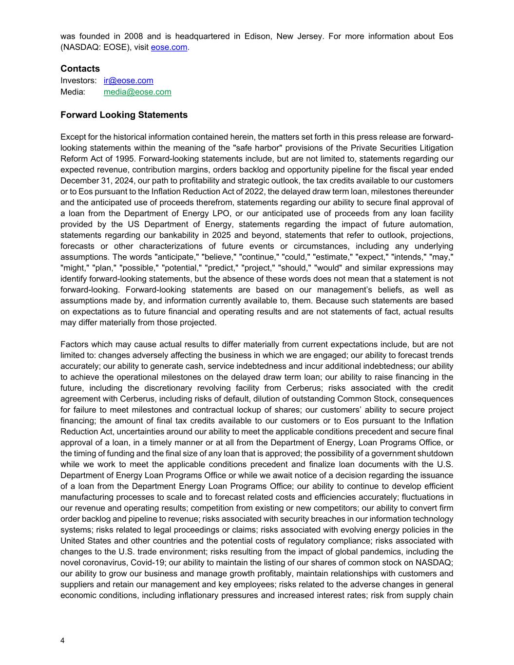 4 was founded in 2008 and is headquartered in Edison, New Jersey. For more information about Eos (NASDAQ: EOSE), visit eose.com. Contacts Investors: ir@eose.com Media: media@eose.com Forward Looking Statements Except for the historical information contained herein, the matters set forth in this press release are forward- looking statements within the meaning of the "safe harbor" provisions of the Private Securities Litigation Reform Act of 1995. Forward-looking statements include, but are not limited to, statements regarding our expected revenue, contribution margins, orders backlog and opportunity pipeline for the fiscal year ended December 31, 2024, our path to profitability and strategic outlook, the tax credits available to our customers or to Eos pursuant to the Inflation Reduction Act of 2022, the delayed draw term loan, milestones thereunder and the anticipated use of proceeds therefrom, statements regarding our ability to secure final approval of a loan from the Department of Energy LPO, or our anticipated use of proceeds from any loan facility provided by the US Department of Energy, statements regarding the impact of future automation, statements regarding our bankability in 2025 and beyond, statements that refer to outlook, projections, forecasts or other characterizations of future events or circumstances, including any underlying assumptions. The words "anticipate," "believe," "continue," "could," "estimate," "expect," "intends," "may," "might," "plan," "possible," "potential," "predict," "project," "should," "would" and similar expressions may identify forward-looking statements, but the absence of these words does not mean that a statement is not forward-looking. Forward-looking statements are based on our management’s beliefs, as well as assumptions made by, and information currently available to, them. Because such statements are based on expectations as to future financial and operating results and are not statements of fact, actual results may differ materially from those projected. Factors which may cause actual results to differ materially from current expectations include, but are not limited to: changes adversely affecting the business in which we are engaged; our ability to forecast trends accurately; our ability to generate cash, service indebtedness and incur additional indebtedness; our ability to achieve the operational milestones on the delayed draw term loan; our ability to raise financing in the future, including the discretionary revolving facility from Cerberus; risks associated with the credit agreement with Cerberus, including risks of default, dilution of outstanding Common Stock, consequences for failure to meet milestones and contractual lockup of shares; our customers’ ability to secure project financing; the amount of final tax credits available to our customers or to Eos pursuant to the Inflation Reduction Act, uncertainties around our ability to meet the applicable conditions precedent and secure final approval of a loan, in a timely manner or at all from the Department of Energy, Loan Programs Office, or the timing of funding and the final size of any loan that is approved; the possibility of a government shutdown while we work to meet the applicable conditions precedent and finalize loan documents with the U.S. Department of Energy Loan Programs Office or while we await notice of a decision regarding the issuance of a loan from the Department Energy Loan Programs Office; our ability to continue to develop efficient manufacturing processes to scale and to forecast related costs and efficiencies accurately; fluctuations in our revenue and operating results; competition from existing or new competitors; our ability to convert firm order backlog and pipeline to revenue; risks associated with security breaches in our information technology systems; risks related to legal proceedings or claims; risks associated with evolving energy policies in the United States and other countries and the potential costs of regulatory compliance; risks associated with changes to the U.S. trade environment; risks resulting from the impact of global pandemics, including the novel coronavirus, Covid-19; our ability to maintain the listing of our shares of common stock on NASDAQ; our ability to grow our business and manage growth profitably, maintain relationships with customers and suppliers and retain our management and key employees; risks related to the adverse changes in general economic conditions, including inflationary pressures and increased interest rates; risk from supply chain
