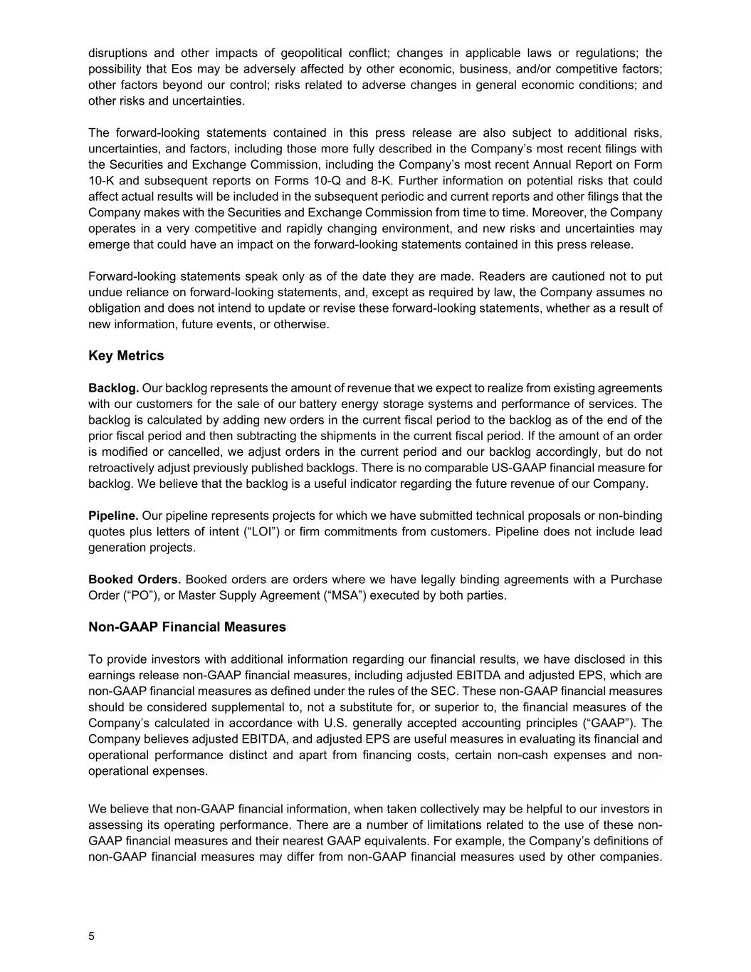 5 disruptions and other impacts of geopolitical conflict; changes in applicable laws or regulations; the possibility that Eos may be adversely affected by other economic, business, and/or competitive factors; other factors beyond our control; risks related to adverse changes in general economic conditions; and other risks and uncertainties. The forward-looking statements contained in this press release are also subject to additional risks, uncertainties, and factors, including those more fully described in the Company’s most recent filings with the Securities and Exchange Commission, including the Company’s most recent Annual Report on Form 10-K and subsequent reports on Forms 10-Q and 8-K. Further information on potential risks that could affect actual results will be included in the subsequent periodic and current reports and other filings that the Company makes with the Securities and Exchange Commission from time to time. Moreover, the Company operates in a very competitive and rapidly changing environment, and new risks and uncertainties may emerge that could have an impact on the forward-looking statements contained in this press release. Forward-looking statements speak only as of the date they are made. Readers are cautioned not to put undue reliance on forward-looking statements, and, except as required by law, the Company assumes no obligation and does not intend to update or revise these forward-looking statements, whether as a result of new information, future events, or otherwise. Key Metrics Backlog. Our backlog represents the amount of revenue that we expect to realize from existing agreements with our customers for the sale of our battery energy storage systems and performance of services. The backlog is calculated by adding new orders in the current fiscal period to the backlog as of the end of the prior fiscal period and then subtracting the shipments in the current fiscal period. If the amount of an order is modified or cancelled, we adjust orders in the current period and our backlog accordingly, but do not retroactively adjust previously published backlogs. There is no comparable US-GAAP financial measure for backlog. We believe that the backlog is a useful indicator regarding the future revenue of our Company. Pipeline. Our pipeline represents projects for which we have submitted technical proposals or non-binding quotes plus letters of intent (“LOI”) or firm commitments from customers. Pipeline does not include lead generation projects. Booked Orders. Booked orders are orders where we have legally binding agreements with a Purchase Order (“PO”), or Master Supply Agreement (“MSA”) executed by both parties. Non-GAAP Financial Measures To provide investors with additional information regarding our financial results, we have disclosed in this earnings release non-GAAP financial measures, including adjusted EBITDA and adjusted EPS, which are non-GAAP financial measures as defined under the rules of the SEC. These non-GAAP financial measures should be considered supplemental to, not a substitute for, or superior to, the financial measures of the Company’s calculated in accordance with U.S. generally accepted accounting principles (“GAAP”). The Company believes adjusted EBITDA, and adjusted EPS are useful measures in evaluating its financial and operational performance distinct and apart from financing costs, certain non-cash expenses and non- operational expenses. We believe that non-GAAP financial information, when taken collectively may be helpful to our investors in assessing its operating performance. There are a number of limitations related to the use of these non- GAAP financial measures and their nearest GAAP equivalents. For example, the Company’s definitions of non-GAAP financial measures may differ from non-GAAP financial measures used by other companies.