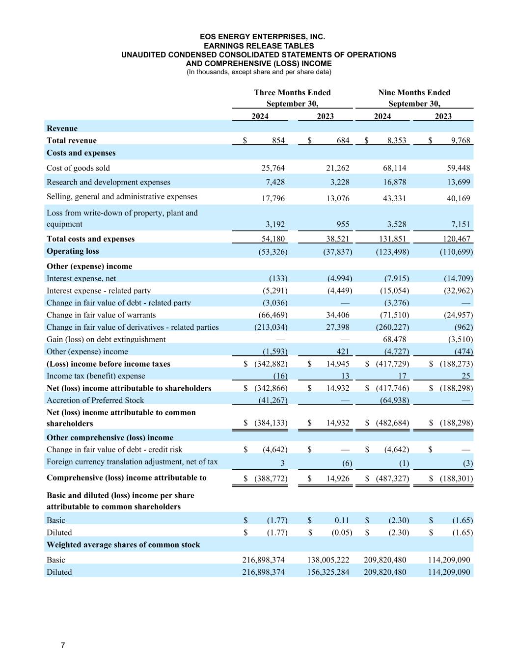 7 EOS ENERGY ENTERPRISES, INC. EARNINGS RELEASE TABLES UNAUDITED CONDENSED CONSOLIDATED STATEMENTS OF OPERATIONS AND COMPREHENSIVE (LOSS) INCOME (In thousands, except share and per share data) Three Months Ended September 30, Nine Months Ended September 30, 2024 2023 2024 2023 Revenue Total revenue $ 854 $ 684 $ 8,353 $ 9,768 Costs and expenses Cost of goods sold 25,764 21,262 68,114 59,448 Research and development expenses 7,428 3,228 16,878 13,699 Selling, general and administrative expenses 17,796 13,076 43,331 40,169 Loss from write-down of property, plant and equipment 3,192 955 3,528 7,151 Total costs and expenses 54,180 38,521 131,851 120,467 Operating loss (53,326) (37,837) (123,498) (110,699) Other (expense) income Interest expense, net (133) (4,994) (7,915) (14,709) Interest expense - related party (5,291) (4,449) (15,054) (32,962) Change in fair value of debt - related party (3,036) — (3,276) — Change in fair value of warrants (66,469) 34,406 (71,510) (24,957) Change in fair value of derivatives - related parties (213,034) 27,398 (260,227) (962) Gain (loss) on debt extinguishment — — 68,478 (3,510) Other (expense) income (1,593) 421 (4,727) (474) (Loss) income before income taxes $ (342,882) $ 14,945 $ (417,729) $ (188,273) Income tax (benefit) expense (16) 13 17 25 Net (loss) income attributable to shareholders $ (342,866) $ 14,932 $ (417,746) $ (188,298) Accretion of Preferred Stock (41,267) — (64,938) — Net (loss) income attributable to common shareholders $ (384,133) $ 14,932 $ (482,684) $ (188,298) Other comprehensive (loss) income Change in fair value of debt - credit risk $ (4,642) $ — $ (4,642) $ — Foreign currency translation adjustment, net of tax 3 (6) (1) (3) Comprehensive (loss) income attributable to $ (388,772) $ 14,926 $ (487,327) $ (188,301) Basic and diluted (loss) income per share attributable to common shareholders Basic $ (1.77) $ 0.11 $ (2.30) $ (1.65) Diluted $ (1.77) $ (0.05) $ (2.30) $ (1.65) Weighted average shares of common stock Basic 216,898,374 138,005,222 209,820,480 114,209,090 Diluted 216,898,374 156,325,284 209,820,480 114,209,090