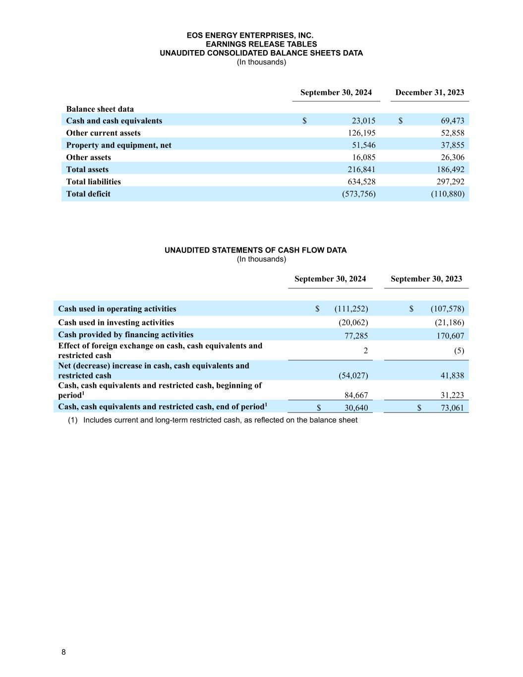 8 EOS ENERGY ENTERPRISES, INC. EARNINGS RELEASE TABLES UNAUDITED CONSOLIDATED BALANCE SHEETS DATA (In thousands) September 30, 2024 December 31, 2023 Balance sheet data Cash and cash equivalents $ 23,015 $ 69,473 Other current assets 126,195 52,858 Property and equipment, net 51,546 37,855 Other assets 16,085 26,306 Total assets 216,841 186,492 Total liabilities 634,528 297,292 Total deficit (573,756) (110,880) UNAUDITED STATEMENTS OF CASH FLOW DATA (In thousands) (1) Includes current and long-term restricted cash, as reflected on the balance sheet September 30, 2024 September 30, 2023 Cash used in operating activities $ (111,252) $ (107,578) Cash used in investing activities (20,062) (21,186) Cash provided by financing activities 77,285 170,607 Effect of foreign exchange on cash, cash equivalents and restricted cash 2 (5) Net (decrease) increase in cash, cash equivalents and restricted cash (54,027) 41,838 Cash, cash equivalents and restricted cash, beginning of period1 84,667 31,223 Cash, cash equivalents and restricted cash, end of period1 $ 30,640 $ 73,061