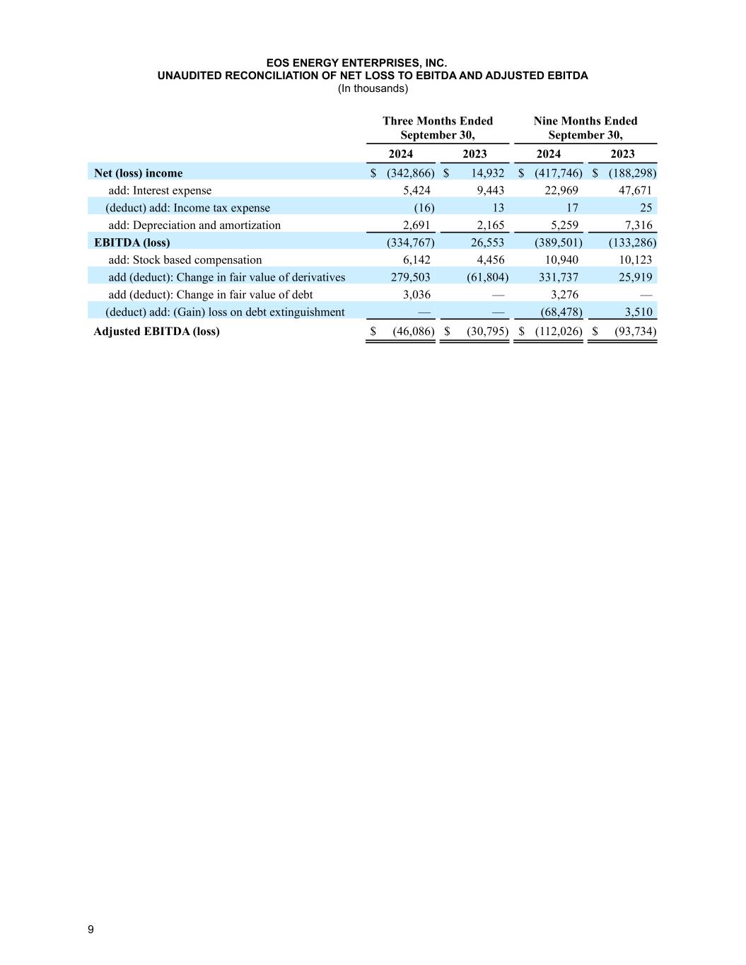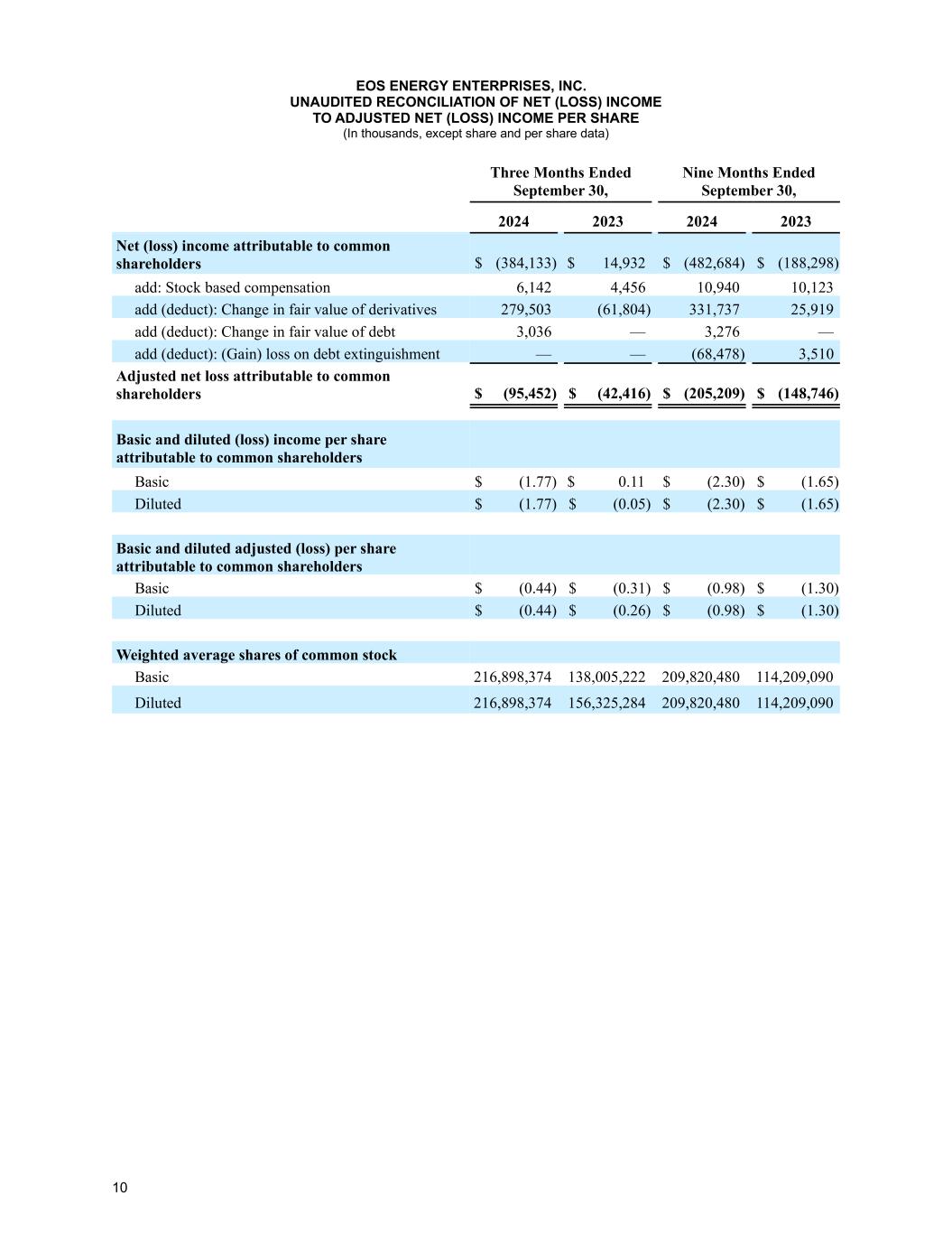 9 EOS ENERGY ENTERPRISES, INC. UNAUDITED RECONCILIATION OF NET LOSS TO EBITDA AND ADJUSTED EBITDA (In thousands) Three Months Ended September 30, Nine Months Ended September 30, 2024 2023 2024 2023 Net (loss) income $ (342,866) $ 14,932 $ (417,746) $ (188,298) add: Interest expense 5,424 9,443 22,969 47,671 (deduct) add: Income tax expense (16) 13 17 25 add: Depreciation and amortization 2,691 2,165 5,259 7,316 EBITDA (loss) (334,767) 26,553 (389,501) (133,286) add: Stock based compensation 6,142 4,456 10,940 10,123 add (deduct): Change in fair value of derivatives 279,503 (61,804) 331,737 25,919 add (deduct): Change in fair value of debt 3,036 — 3,276 — (deduct) add: (Gain) loss on debt extinguishment — — (68,478) 3,510 Adjusted EBITDA (loss) $ (46,086) $ (30,795) $ (112,026) $ (93,734)