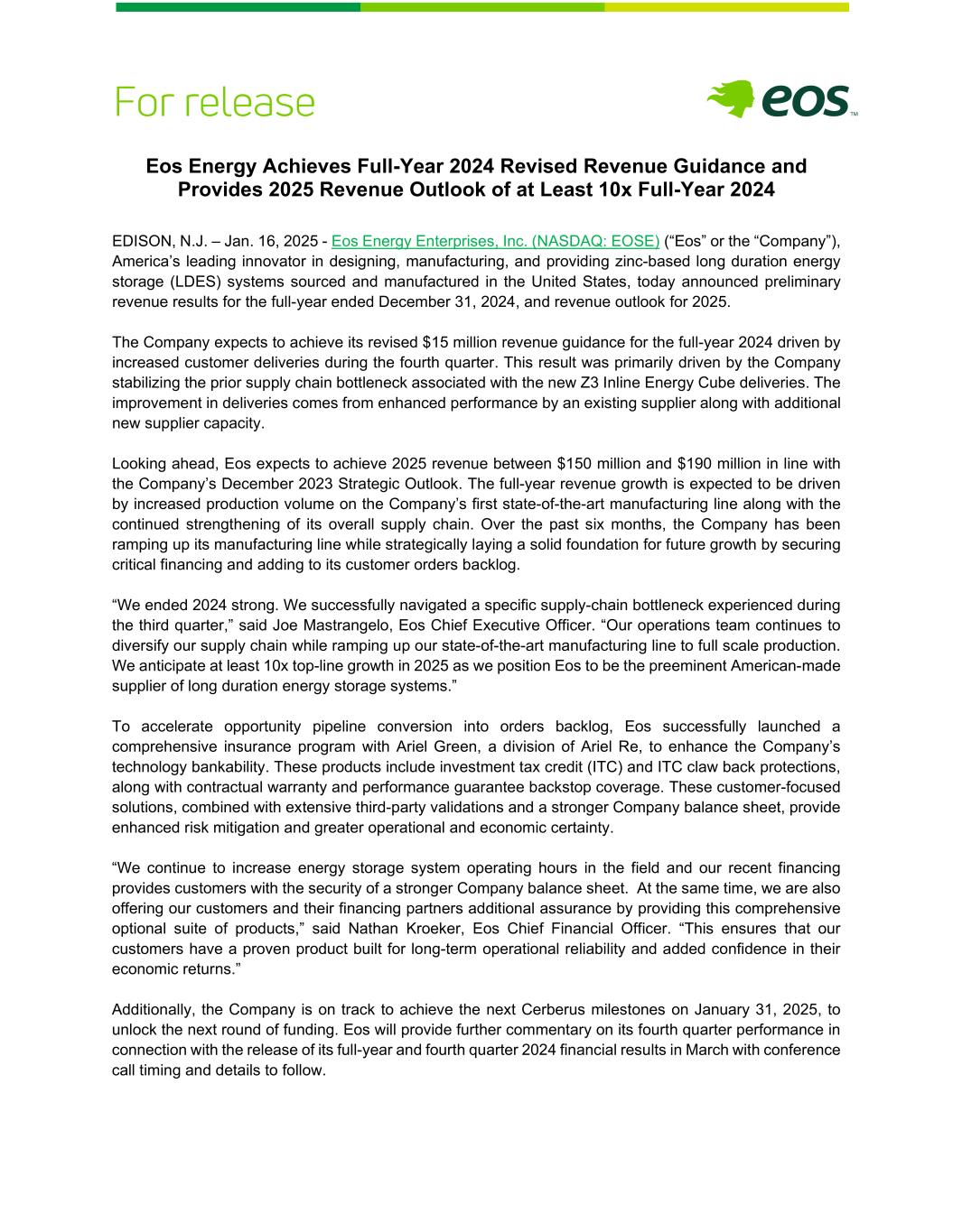 Eos Energy Achieves Full-Year 2024 Revised Revenue Guidance and Provides 2025 Revenue Outlook of at Least 10x Full-Year 2024 EDISON, N.J. – Jan. 16, 2025 - Eos Energy Enterprises, Inc. (NASDAQ: EOSE) (“Eos” or the “Company”), America’s leading innovator in designing, manufacturing, and providing zinc-based long duration energy storage (LDES) systems sourced and manufactured in the United States, today announced preliminary revenue results for the full-year ended December 31, 2024, and revenue outlook for 2025. The Company expects to achieve its revised $15 million revenue guidance for the full-year 2024 driven by increased customer deliveries during the fourth quarter. This result was primarily driven by the Company stabilizing the prior supply chain bottleneck associated with the new Z3 Inline Energy Cube deliveries. The improvement in deliveries comes from enhanced performance by an existing supplier along with additional new supplier capacity. Looking ahead, Eos expects to achieve 2025 revenue between $150 million and $190 million in line with the Company’s December 2023 Strategic Outlook. The full-year revenue growth is expected to be driven by increased production volume on the Company’s first state-of-the-art manufacturing line along with the continued strengthening of its overall supply chain. Over the past six months, the Company has been ramping up its manufacturing line while strategically laying a solid foundation for future growth by securing critical financing and adding to its customer orders backlog. “We ended 2024 strong. We successfully navigated a specific supply-chain bottleneck experienced during the third quarter,” said Joe Mastrangelo, Eos Chief Executive Officer. “Our operations team continues to diversify our supply chain while ramping up our state-of-the-art manufacturing line to full scale production. We anticipate at least 10x top-line growth in 2025 as we position Eos to be the preeminent American-made supplier of long duration energy storage systems.” To accelerate opportunity pipeline conversion into orders backlog, Eos successfully launched a comprehensive insurance program with Ariel Green, a division of Ariel Re, to enhance the Company’s technology bankability. These products include investment tax credit (ITC) and ITC claw back protections, along with contractual warranty and performance guarantee backstop coverage. These customer-focused solutions, combined with extensive third-party validations and a stronger Company balance sheet, provide enhanced risk mitigation and greater operational and economic certainty. “We continue to increase energy storage system operating hours in the field and our recent financing provides customers with the security of a stronger Company balance sheet. At the same time, we are also offering our customers and their financing partners additional assurance by providing this comprehensive optional suite of products,” said Nathan Kroeker, Eos Chief Financial Officer. “This ensures that our customers have a proven product built for long-term operational reliability and added confidence in their economic returns.” Additionally, the Company is on track to achieve the next Cerberus milestones on January 31, 2025, to unlock the next round of funding. Eos will provide further commentary on its fourth quarter performance in connection with the release of its full-year and fourth quarter 2024 financial results in March with conference call timing and details to follow.