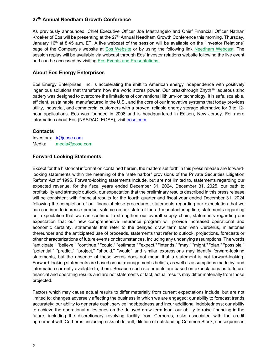 2 27th Annual Needham Growth Conference As previously announced, Chief Executive Officer Joe Mastrangelo and Chief Financial Officer Nathan Kroeker of Eos will be presenting at the 27th Annual Needham Growth Conference this morning, Thursday, January 16th at 8:45 a.m. ET. A live webcast of the session will be available on the “Investor Relations” page of the Company’s website at Eos Website or by using the following link Needham Webcast. The session replay will be available via webcast through Eos’ investor relations website following the live event and can be accessed by visiting Eos Events and Presentations. About Eos Energy Enterprises Eos Energy Enterprises, Inc. is accelerating the shift to American energy independence with positively ingenious solutions that transform how the world stores power. Our breakthrough Znyth™ aqueous zinc battery was designed to overcome the limitations of conventional lithium-ion technology. It is safe, scalable, efficient, sustainable, manufactured in the U.S., and the core of our innovative systems that today provides utility, industrial, and commercial customers with a proven, reliable energy storage alternative for 3 to 12- hour applications. Eos was founded in 2008 and is headquartered in Edison, New Jersey. For more information about Eos (NASDAQ: EOSE), visit eose.com. Contacts Investors: ir@eose.com Media: media@eose.com Forward Looking Statements Except for the historical information contained herein, the matters set forth in this press release are forward- looking statements within the meaning of the "safe harbor" provisions of the Private Securities Litigation Reform Act of 1995. Forward-looking statements include, but are not limited to, statements regarding our expected revenue, for the fiscal years ended December 31, 2024, December 31, 2025, our path to profitability and strategic outlook, our expectation that the preliminary results described in this press release will be consistent with financial results for the fourth quarter and fiscal year ended December 31, 2024 following the completion of our financial close procedures, statements regarding our expectation that we can continue to increase product volume on our state-of-the-art manufacturing line, statements regarding our expectation that we can continue to strengthen our overall supply chain, statements regarding our expectation that our new comprehensive insurance program will provide increased operational and economic certainty, statements that refer to the delayed draw term loan with Cerberus, milestones thereunder and the anticipated use of proceeds, statements that refer to outlook, projections, forecasts or other characterizations of future events or circumstances, including any underlying assumptions. The words "anticipate," "believe," "continue," "could," "estimate," "expect," "intends," "may," "might," "plan," "possible," "potential," "predict," "project," "should," "would" and similar expressions may identify forward-looking statements, but the absence of these words does not mean that a statement is not forward-looking. Forward-looking statements are based on our management’s beliefs, as well as assumptions made by, and information currently available to, them. Because such statements are based on expectations as to future financial and operating results and are not statements of fact, actual results may differ materially from those projected. Factors which may cause actual results to differ materially from current expectations include, but are not limited to: changes adversely affecting the business in which we are engaged; our ability to forecast trends accurately; our ability to generate cash, service indebtedness and incur additional indebtedness; our ability to achieve the operational milestones on the delayed draw term loan; our ability to raise financing in the future, including the discretionary revolving facility from Cerberus; risks associated with the credit agreement with Cerberus, including risks of default, dilution of outstanding Common Stock, consequences