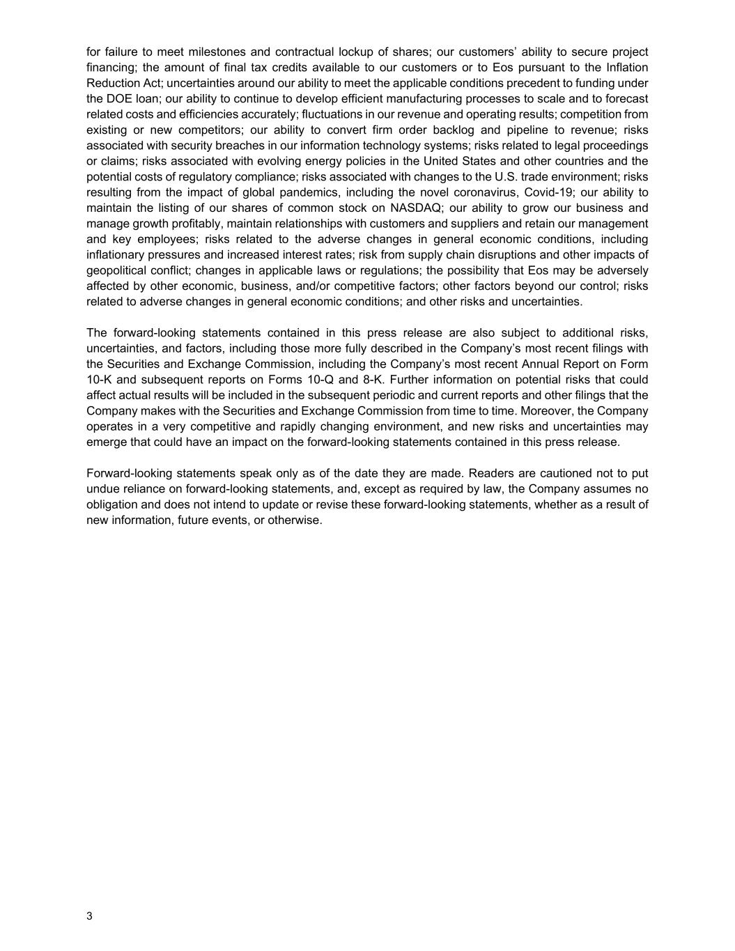 3 for failure to meet milestones and contractual lockup of shares; our customers’ ability to secure project financing; the amount of final tax credits available to our customers or to Eos pursuant to the Inflation Reduction Act; uncertainties around our ability to meet the applicable conditions precedent to funding under the DOE loan; our ability to continue to develop efficient manufacturing processes to scale and to forecast related costs and efficiencies accurately; fluctuations in our revenue and operating results; competition from existing or new competitors; our ability to convert firm order backlog and pipeline to revenue; risks associated with security breaches in our information technology systems; risks related to legal proceedings or claims; risks associated with evolving energy policies in the United States and other countries and the potential costs of regulatory compliance; risks associated with changes to the U.S. trade environment; risks resulting from the impact of global pandemics, including the novel coronavirus, Covid-19; our ability to maintain the listing of our shares of common stock on NASDAQ; our ability to grow our business and manage growth profitably, maintain relationships with customers and suppliers and retain our management and key employees; risks related to the adverse changes in general economic conditions, including inflationary pressures and increased interest rates; risk from supply chain disruptions and other impacts of geopolitical conflict; changes in applicable laws or regulations; the possibility that Eos may be adversely affected by other economic, business, and/or competitive factors; other factors beyond our control; risks related to adverse changes in general economic conditions; and other risks and uncertainties. The forward-looking statements contained in this press release are also subject to additional risks, uncertainties, and factors, including those more fully described in the Company’s most recent filings with the Securities and Exchange Commission, including the Company’s most recent Annual Report on Form 10-K and subsequent reports on Forms 10-Q and 8-K. Further information on potential risks that could affect actual results will be included in the subsequent periodic and current reports and other filings that the Company makes with the Securities and Exchange Commission from time to time. Moreover, the Company operates in a very competitive and rapidly changing environment, and new risks and uncertainties may emerge that could have an impact on the forward-looking statements contained in this press release. Forward-looking statements speak only as of the date they are made. Readers are cautioned not to put undue reliance on forward-looking statements, and, except as required by law, the Company assumes no obligation and does not intend to update or revise these forward-looking statements, whether as a result of new information, future events, or otherwise.