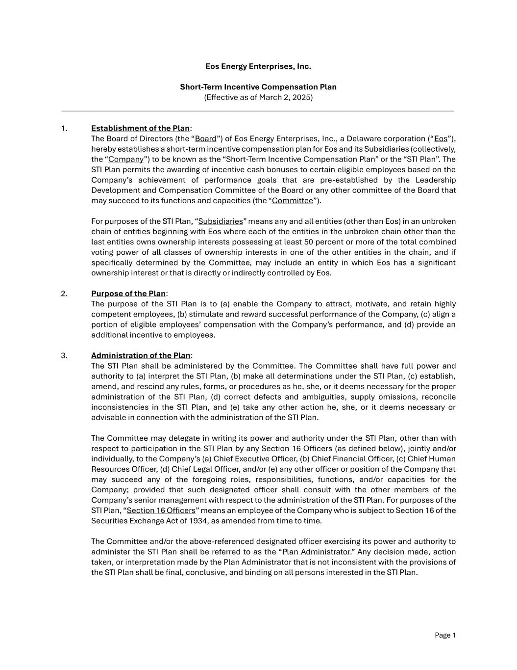 Page 1 Eos Energy Enterprises, Inc. Short-Term Incentive Compensation Plan (Effective as of March 2, 2025) _____________________________________________________________________________________________________ 1. Establishment of the Plan: The Board of Directors (the “Board”) of Eos Energy Enterprises, Inc., a Delaware corporation (“Eos”), hereby establishes a short-term incentive compensation plan for Eos and its Subsidiaries (collectively, the “Company”) to be known as the “Short-Term Incentive Compensation Plan” or the “STI Plan”. The STI Plan permits the awarding of incentive cash bonuses to certain eligible employees based on the Company’s achievement of performance goals that are pre-established by the Leadership Development and Compensation Committee of the Board or any other committee of the Board that may succeed to its functions and capacities (the “Committee”). For purposes of the STI Plan, “Subsidiaries” means any and all entities (other than Eos) in an unbroken chain of entities beginning with Eos where each of the entities in the unbroken chain other than the last entities owns ownership interests possessing at least 50 percent or more of the total combined voting power of all classes of ownership interests in one of the other entities in the chain, and if specifically determined by the Committee, may include an entity in which Eos has a significant ownership interest or that is directly or indirectly controlled by Eos. 2. Purpose of the Plan: The purpose of the STI Plan is to (a) enable the Company to attract, motivate, and retain highly competent employees, (b) stimulate and reward successful performance of the Company, (c) align a portion of eligible employees’ compensation with the Company’s performance, and (d) provide an additional incentive to employees. 3. Administration of the Plan: The STI Plan shall be administered by the Committee. The Committee shall have full power and authority to (a) interpret the STI Plan, (b) make all determinations under the STI Plan, (c) establish, amend, and rescind any rules, forms, or procedures as he, she, or it deems necessary for the proper administration of the STI Plan, (d) correct defects and ambiguities, supply omissions, reconcile inconsistencies in the STI Plan, and (e) take any other action he, she, or it deems necessary or advisable in connection with the administration of the STI Plan. The Committee may delegate in writing its power and authority under the STI Plan, other than with respect to participation in the STI Plan by any Section 16 Officers (as defined below), jointly and/or individually, to the Company’s (a) Chief Executive Officer, (b) Chief Financial Officer, (c) Chief Human Resources Officer, (d) Chief Legal Officer, and/or (e) any other officer or position of the Company that may succeed any of the foregoing roles, responsibilities, functions, and/or capacities for the Company; provided that such designated officer shall consult with the other members of the Company’s senior management with respect to the administration of the STI Plan. For purposes of the STI Plan, “Section 16 Officers” means an employee of the Company who is subject to Section 16 of the Securities Exchange Act of 1934, as amended from time to time. The Committee and/or the above-referenced designated officer exercising its power and authority to administer the STI Plan shall be referred to as the “Plan Administrator.” Any decision made, action taken, or interpretation made by the Plan Administrator that is not inconsistent with the provisions of the STI Plan shall be final, conclusive, and binding on all persons interested in the STI Plan.