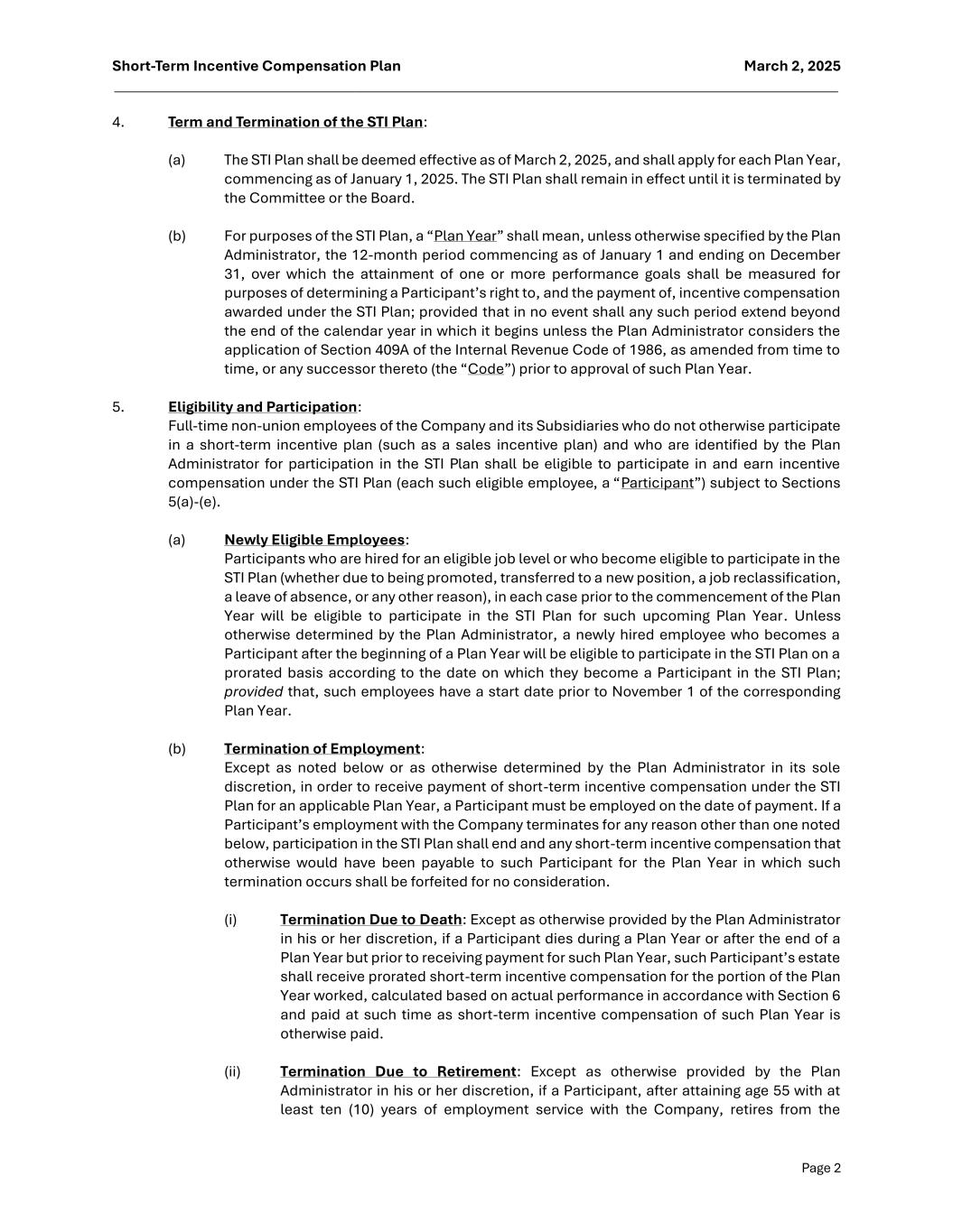 Short-Term Incentive Compensation Plan March 2, 2025 _____________________________________________________________________________________________ Page 2 4. Term and Termination of the STI Plan: (a) The STI Plan shall be deemed effective as of March 2, 2025, and shall apply for each Plan Year, commencing as of January 1, 2025. The STI Plan shall remain in effect until it is terminated by the Committee or the Board. (b) For purposes of the STI Plan, a “Plan Year” shall mean, unless otherwise specified by the Plan Administrator, the 12-month period commencing as of January 1 and ending on December 31, over which the attainment of one or more performance goals shall be measured for purposes of determining a Participant’s right to, and the payment of, incentive compensation awarded under the STI Plan; provided that in no event shall any such period extend beyond the end of the calendar year in which it begins unless the Plan Administrator considers the application of Section 409A of the Internal Revenue Code of 1986, as amended from time to time, or any successor thereto (the “Code”) prior to approval of such Plan Year. 5. Eligibility and Participation: Full-time non-union employees of the Company and its Subsidiaries who do not otherwise participate in a short-term incentive plan (such as a sales incentive plan) and who are identified by the Plan Administrator for participation in the STI Plan shall be eligible to participate in and earn incentive compensation under the STI Plan (each such eligible employee, a “Participant”) subject to Sections 5(a)-(e). (a) Newly Eligible Employees: Participants who are hired for an eligible job level or who become eligible to participate in the STI Plan (whether due to being promoted, transferred to a new position, a job reclassification, a leave of absence, or any other reason), in each case prior to the commencement of the Plan Year will be eligible to participate in the STI Plan for such upcoming Plan Year. Unless otherwise determined by the Plan Administrator, a newly hired employee who becomes a Participant after the beginning of a Plan Year will be eligible to participate in the STI Plan on a prorated basis according to the date on which they become a Participant in the STI Plan; provided that, such employees have a start date prior to November 1 of the corresponding Plan Year. (b) Termination of Employment: Except as noted below or as otherwise determined by the Plan Administrator in its sole discretion, in order to receive payment of short-term incentive compensation under the STI Plan for an applicable Plan Year, a Participant must be employed on the date of payment. If a Participant’s employment with the Company terminates for any reason other than one noted below, participation in the STI Plan shall end and any short-term incentive compensation that otherwise would have been payable to such Participant for the Plan Year in which such termination occurs shall be forfeited for no consideration. (i) Termination Due to Death: Except as otherwise provided by the Plan Administrator in his or her discretion, if a Participant dies during a Plan Year or after the end of a Plan Year but prior to receiving payment for such Plan Year, such Participant’s estate shall receive prorated short-term incentive compensation for the portion of the Plan Year worked, calculated based on actual performance in accordance with Section 6 and paid at such time as short-term incentive compensation of such Plan Year is otherwise paid. (ii) Termination Due to Retirement: Except as otherwise provided by the Plan Administrator in his or her discretion, if a Participant, after attaining age 55 with at least ten (10) years of employment service with the Company, retires from the