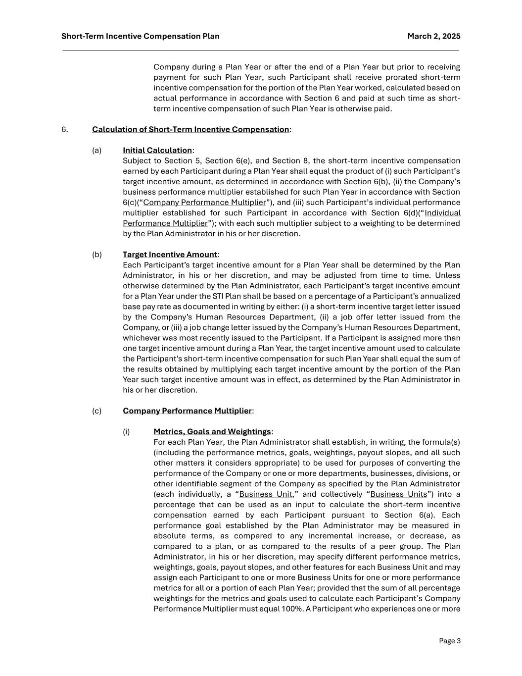 Short-Term Incentive Compensation Plan March 2, 2025 _____________________________________________________________________________________________ Page 3 Company during a Plan Year or after the end of a Plan Year but prior to receiving payment for such Plan Year, such Participant shall receive prorated short-term incentive compensation for the portion of the Plan Year worked, calculated based on actual performance in accordance with Section 6 and paid at such time as short- term incentive compensation of such Plan Year is otherwise paid. 6. Calculation of Short-Term Incentive Compensation: (a) Initial Calculation: Subject to Section 5, Section 6(e), and Section 8, the short-term incentive compensation earned by each Participant during a Plan Year shall equal the product of (i) such Participant’s target incentive amount, as determined in accordance with Section 6(b), (ii) the Company’s business performance multiplier established for such Plan Year in accordance with Section 6(c)(“Company Performance Multiplier”), and (iii) such Participant’s individual performance multiplier established for such Participant in accordance with Section 6(d)(“Individual Performance Multiplier”); with each such multiplier subject to a weighting to be determined by the Plan Administrator in his or her discretion. (b) Target Incentive Amount: Each Participant’s target incentive amount for a Plan Year shall be determined by the Plan Administrator, in his or her discretion, and may be adjusted from time to time. Unless otherwise determined by the Plan Administrator, each Participant’s target incentive amount for a Plan Year under the STI Plan shall be based on a percentage of a Participant’s annualized base pay rate as documented in writing by either: (i) a short-term incentive target letter issued by the Company’s Human Resources Department, (ii) a job offer letter issued from the Company, or (iii) a job change letter issued by the Company’s Human Resources Department, whichever was most recently issued to the Participant. If a Participant is assigned more than one target incentive amount during a Plan Year, the target incentive amount used to calculate the Participant’s short-term incentive compensation for such Plan Year shall equal the sum of the results obtained by multiplying each target incentive amount by the portion of the Plan Year such target incentive amount was in effect, as determined by the Plan Administrator in his or her discretion. (c) Company Performance Multiplier: (i) Metrics, Goals and Weightings: For each Plan Year, the Plan Administrator shall establish, in writing, the formula(s) (including the performance metrics, goals, weightings, payout slopes, and all such other matters it considers appropriate) to be used for purposes of converting the performance of the Company or one or more departments, businesses, divisions, or other identifiable segment of the Company as specified by the Plan Administrator (each individually, a “Business Unit,” and collectively “Business Units”) into a percentage that can be used as an input to calculate the short-term incentive compensation earned by each Participant pursuant to Section 6(a). Each performance goal established by the Plan Administrator may be measured in absolute terms, as compared to any incremental increase, or decrease, as compared to a plan, or as compared to the results of a peer group. The Plan Administrator, in his or her discretion, may specify different performance metrics, weightings, goals, payout slopes, and other features for each Business Unit and may assign each Participant to one or more Business Units for one or more performance metrics for all or a portion of each Plan Year; provided that the sum of all percentage weightings for the metrics and goals used to calculate each Participant’s Company Performance Multiplier must equal 100%. A Participant who experiences one or more