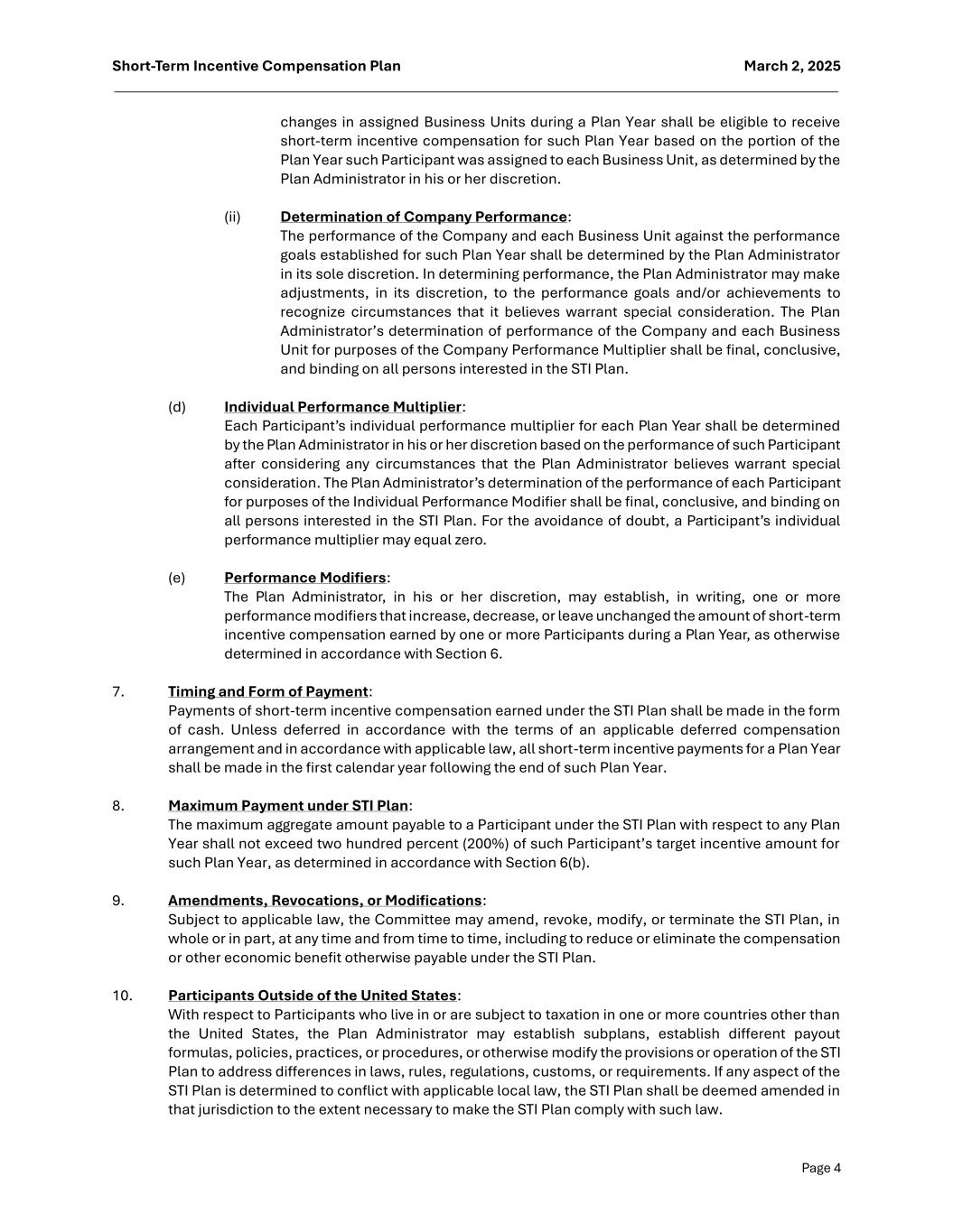 Short-Term Incentive Compensation Plan March 2, 2025 _____________________________________________________________________________________________ Page 4 changes in assigned Business Units during a Plan Year shall be eligible to receive short-term incentive compensation for such Plan Year based on the portion of the Plan Year such Participant was assigned to each Business Unit, as determined by the Plan Administrator in his or her discretion. (ii) Determination of Company Performance: The performance of the Company and each Business Unit against the performance goals established for such Plan Year shall be determined by the Plan Administrator in its sole discretion. In determining performance, the Plan Administrator may make adjustments, in its discretion, to the performance goals and/or achievements to recognize circumstances that it believes warrant special consideration. The Plan Administrator’s determination of performance of the Company and each Business Unit for purposes of the Company Performance Multiplier shall be final, conclusive, and binding on all persons interested in the STI Plan. (d) Individual Performance Multiplier: Each Participant’s individual performance multiplier for each Plan Year shall be determined by the Plan Administrator in his or her discretion based on the performance of such Participant after considering any circumstances that the Plan Administrator believes warrant special consideration. The Plan Administrator’s determination of the performance of each Participant for purposes of the Individual Performance Modifier shall be final, conclusive, and binding on all persons interested in the STI Plan. For the avoidance of doubt, a Participant’s individual performance multiplier may equal zero. (e) Performance Modifiers: The Plan Administrator, in his or her discretion, may establish, in writing, one or more performance modifiers that increase, decrease, or leave unchanged the amount of short-term incentive compensation earned by one or more Participants during a Plan Year, as otherwise determined in accordance with Section 6. 7. Timing and Form of Payment: Payments of short-term incentive compensation earned under the STI Plan shall be made in the form of cash. Unless deferred in accordance with the terms of an applicable deferred compensation arrangement and in accordance with applicable law, all short-term incentive payments for a Plan Year shall be made in the first calendar year following the end of such Plan Year. 8. Maximum Payment under STI Plan: The maximum aggregate amount payable to a Participant under the STI Plan with respect to any Plan Year shall not exceed two hundred percent (200%) of such Participant’s target incentive amount for such Plan Year, as determined in accordance with Section 6(b). 9. Amendments, Revocations, or Modifications: Subject to applicable law, the Committee may amend, revoke, modify, or terminate the STI Plan, in whole or in part, at any time and from time to time, including to reduce or eliminate the compensation or other economic benefit otherwise payable under the STI Plan. 10. Participants Outside of the United States: With respect to Participants who live in or are subject to taxation in one or more countries other than the United States, the Plan Administrator may establish subplans, establish different payout formulas, policies, practices, or procedures, or otherwise modify the provisions or operation of the STI Plan to address differences in laws, rules, regulations, customs, or requirements. If any aspect of the STI Plan is determined to conflict with applicable local law, the STI Plan shall be deemed amended in that jurisdiction to the extent necessary to make the STI Plan comply with such law.