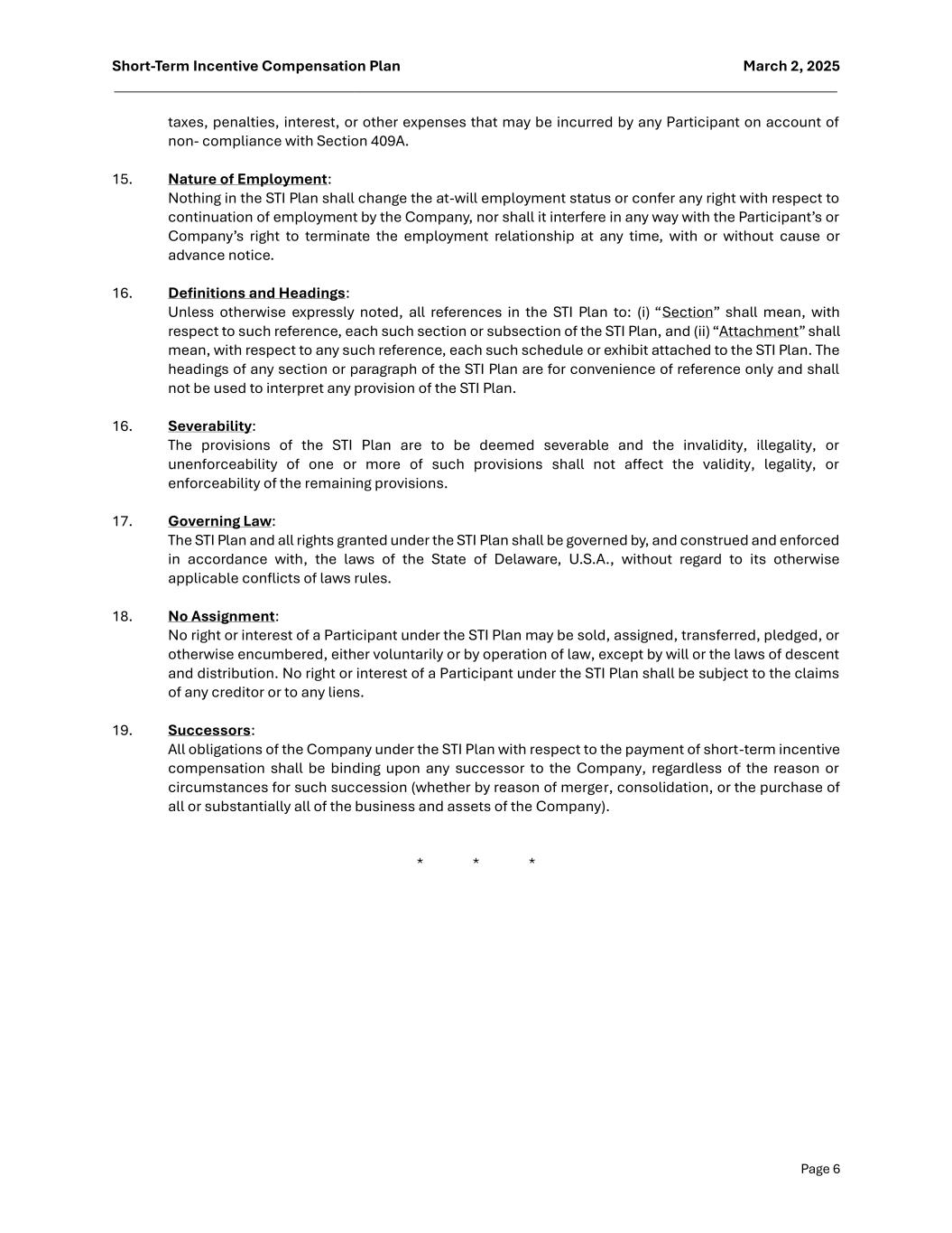 Short-Term Incentive Compensation Plan March 2, 2025 _____________________________________________________________________________________________ Page 6 taxes, penalties, interest, or other expenses that may be incurred by any Participant on account of non- compliance with Section 409A. 15. Nature of Employment: Nothing in the STI Plan shall change the at-will employment status or confer any right with respect to continuation of employment by the Company, nor shall it interfere in any way with the Participant’s or Company’s right to terminate the employment relationship at any time, with or without cause or advance notice. 16. Definitions and Headings: Unless otherwise expressly noted, all references in the STI Plan to: (i) “Section” shall mean, with respect to such reference, each such section or subsection of the STI Plan, and (ii) “Attachment” shall mean, with respect to any such reference, each such schedule or exhibit attached to the STI Plan. The headings of any section or paragraph of the STI Plan are for convenience of reference only and shall not be used to interpret any provision of the STI Plan. 16. Severability: The provisions of the STI Plan are to be deemed severable and the invalidity, illegality, or unenforceability of one or more of such provisions shall not affect the validity, legality, or enforceability of the remaining provisions. 17. Governing Law: The STI Plan and all rights granted under the STI Plan shall be governed by, and construed and enforced in accordance with, the laws of the State of Delaware, U.S.A., without regard to its otherwise applicable conflicts of laws rules. 18. No Assignment: No right or interest of a Participant under the STI Plan may be sold, assigned, transferred, pledged, or otherwise encumbered, either voluntarily or by operation of law, except by will or the laws of descent and distribution. No right or interest of a Participant under the STI Plan shall be subject to the claims of any creditor or to any liens. 19. Successors: All obligations of the Company under the STI Plan with respect to the payment of short-term incentive compensation shall be binding upon any successor to the Company, regardless of the reason or circumstances for such succession (whether by reason of merger, consolidation, or the purchase of all or substantially all of the business and assets of the Company). * * *