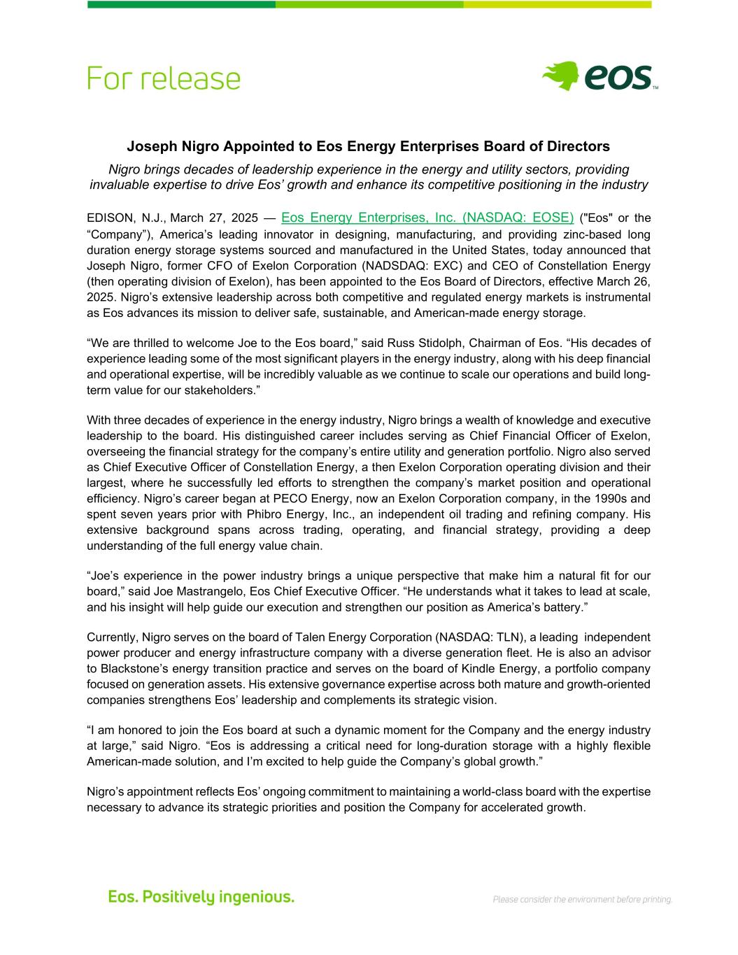 Joseph Nigro Appointed to Eos Energy Enterprises Board of Directors Nigro brings decades of leadership experience in the energy and utility sectors, providing invaluable expertise to drive Eos’ growth and enhance its competitive positioning in the industry EDISON, N.J., March 27, 2025 — Eos Energy Enterprises, Inc. (NASDAQ: EOSE) ("Eos" or the “Company”), America’s leading innovator in designing, manufacturing, and providing zinc-based long duration energy storage systems sourced and manufactured in the United States, today announced that Joseph Nigro, former CFO of Exelon Corporation (NADSDAQ: EXC) and CEO of Constellation Energy (then operating division of Exelon), has been appointed to the Eos Board of Directors, effective March 26, 2025. Nigro’s extensive leadership across both competitive and regulated energy markets is instrumental as Eos advances its mission to deliver safe, sustainable, and American-made energy storage. “We are thrilled to welcome Joe to the Eos board,” said Russ Stidolph, Chairman of Eos. “His decades of experience leading some of the most significant players in the energy industry, along with his deep financial and operational expertise, will be incredibly valuable as we continue to scale our operations and build long- term value for our stakeholders.” With three decades of experience in the energy industry, Nigro brings a wealth of knowledge and executive leadership to the board. His distinguished career includes serving as Chief Financial Officer of Exelon, overseeing the financial strategy for the company’s entire utility and generation portfolio. Nigro also served as Chief Executive Officer of Constellation Energy, a then Exelon Corporation operating division and their largest, where he successfully led efforts to strengthen the company’s market position and operational efficiency. Nigro’s career began at PECO Energy, now an Exelon Corporation company, in the 1990s and spent seven years prior with Phibro Energy, Inc., an independent oil trading and refining company. His extensive background spans across trading, operating, and financial strategy, providing a deep understanding of the full energy value chain. “Joe’s experience in the power industry brings a unique perspective that make him a natural fit for our board,” said Joe Mastrangelo, Eos Chief Executive Officer. “He understands what it takes to lead at scale, and his insight will help guide our execution and strengthen our position as America’s battery.” Currently, Nigro serves on the board of Talen Energy Corporation (NASDAQ: TLN), a leading independent power producer and energy infrastructure company with a diverse generation fleet. He is also an advisor to Blackstone’s energy transition practice and serves on the board of Kindle Energy, a portfolio company focused on generation assets. His extensive governance expertise across both mature and growth-oriented companies strengthens Eos’ leadership and complements its strategic vision. “I am honored to join the Eos board at such a dynamic moment for the Company and the energy industry at large,” said Nigro. “Eos is addressing a critical need for long-duration storage with a highly flexible American-made solution, and I’m excited to help guide the Company’s global growth.” Nigro’s appointment reflects Eos’ ongoing commitment to maintaining a world-class board with the expertise necessary to advance its strategic priorities and position the Company for accelerated growth.