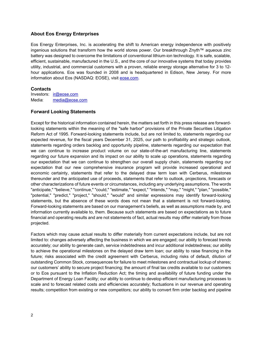 2 About Eos Energy Enterprises Eos Energy Enterprises, Inc. is accelerating the shift to American energy independence with positively ingenious solutions that transform how the world stores power. Our breakthrough Znyth™ aqueous zinc battery was designed to overcome the limitations of conventional lithium-ion technology. It is safe, scalable, efficient, sustainable, manufactured in the U.S., and the core of our innovative systems that today provides utility, industrial, and commercial customers with a proven, reliable energy storage alternative for 3 to 12- hour applications. Eos was founded in 2008 and is headquartered in Edison, New Jersey. For more information about Eos (NASDAQ: EOSE), visit eose.com. Contacts Investors: ir@eose.com Media: media@eose.com Forward Looking Statements Except for the historical information contained herein, the matters set forth in this press release are forward- looking statements within the meaning of the "safe harbor" provisions of the Private Securities Litigation Reform Act of 1995. Forward-looking statements include, but are not limited to, statements regarding our expected revenue, for the fiscal years December 31, 2025, our path to profitability and strategic outlook, statements regarding orders backlog and opportunity pipeline, statements regarding our expectation that we can continue to increase product volume on our state-of-the-art manufacturing line, statements regarding our future expansion and its impact on our ability to scale up operations, statements regarding our expectation that we can continue to strengthen our overall supply chain, statements regarding our expectation that our new comprehensive insurance program will provide increased operational and economic certainty, statements that refer to the delayed draw term loan with Cerberus, milestones thereunder and the anticipated use of proceeds, statements that refer to outlook, projections, forecasts or other characterizations of future events or circumstances, including any underlying assumptions. The words "anticipate," "believe," "continue," "could," "estimate," "expect," "intends," "may," "might," "plan," "possible," "potential," "predict," "project," "should," "would" and similar expressions may identify forward-looking statements, but the absence of these words does not mean that a statement is not forward-looking. Forward-looking statements are based on our management’s beliefs, as well as assumptions made by, and information currently available to, them. Because such statements are based on expectations as to future financial and operating results and are not statements of fact, actual results may differ materially from those projected. Factors which may cause actual results to differ materially from current expectations include, but are not limited to: changes adversely affecting the business in which we are engaged; our ability to forecast trends accurately; our ability to generate cash, service indebtedness and incur additional indebtedness; our ability to achieve the operational milestones on the delayed draw term loan; our ability to raise financing in the future; risks associated with the credit agreement with Cerberus, including risks of default, dilution of outstanding Common Stock, consequences for failure to meet milestones and contractual lockup of shares; our customers’ ability to secure project financing; the amount of final tax credits available to our customers or to Eos pursuant to the Inflation Reduction Act; the timing and availability of future funding under the Department of Energy Loan Facility; our ability to continue to develop efficient manufacturing processes to scale and to forecast related costs and efficiencies accurately; fluctuations in our revenue and operating results; competition from existing or new competitors; our ability to convert firm order backlog and pipeline