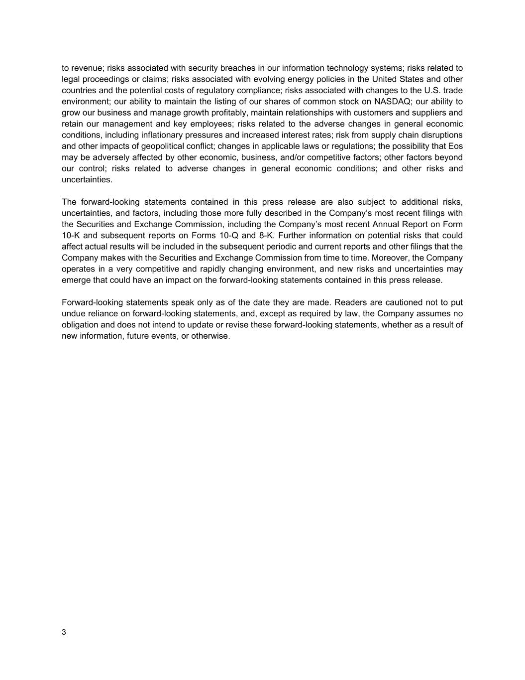 3 to revenue; risks associated with security breaches in our information technology systems; risks related to legal proceedings or claims; risks associated with evolving energy policies in the United States and other countries and the potential costs of regulatory compliance; risks associated with changes to the U.S. trade environment; our ability to maintain the listing of our shares of common stock on NASDAQ; our ability to grow our business and manage growth profitably, maintain relationships with customers and suppliers and retain our management and key employees; risks related to the adverse changes in general economic conditions, including inflationary pressures and increased interest rates; risk from supply chain disruptions and other impacts of geopolitical conflict; changes in applicable laws or regulations; the possibility that Eos may be adversely affected by other economic, business, and/or competitive factors; other factors beyond our control; risks related to adverse changes in general economic conditions; and other risks and uncertainties. The forward-looking statements contained in this press release are also subject to additional risks, uncertainties, and factors, including those more fully described in the Company’s most recent filings with the Securities and Exchange Commission, including the Company’s most recent Annual Report on Form 10-K and subsequent reports on Forms 10-Q and 8-K. Further information on potential risks that could affect actual results will be included in the subsequent periodic and current reports and other filings that the Company makes with the Securities and Exchange Commission from time to time. Moreover, the Company operates in a very competitive and rapidly changing environment, and new risks and uncertainties may emerge that could have an impact on the forward-looking statements contained in this press release. Forward-looking statements speak only as of the date they are made. Readers are cautioned not to put undue reliance on forward-looking statements, and, except as required by law, the Company assumes no obligation and does not intend to update or revise these forward-looking statements, whether as a result of new information, future events, or otherwise.