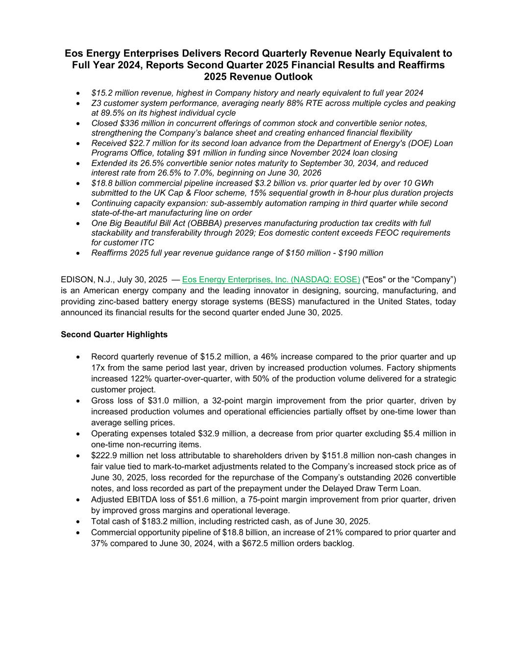 Eos Energy Enterprises Delivers Record Quarterly Revenue Nearly Equivalent to Full Year 2024, Reports Second Quarter 2025 Financial Results and Reaffirms 2025 Revenue Outlook • $15.2 million revenue, highest in Company history and nearly equivalent to full year 2024 • Z3 customer system performance, averaging nearly 88% RTE across multiple cycles and peaking at 89.5% on its highest individual cycle • Closed $336 million in concurrent offerings of common stock and convertible senior notes, strengthening the Company’s balance sheet and creating enhanced financial flexibility • Received $22.7 million for its second loan advance from the Department of Energy's (DOE) Loan Programs Office, totaling $91 million in funding since November 2024 loan closing • Extended its 26.5% convertible senior notes maturity to September 30, 2034, and reduced interest rate from 26.5% to 7.0%, beginning on June 30, 2026 • $18.8 billion commercial pipeline increased $3.2 billion vs. prior quarter led by over 10 GWh submitted to the UK Cap & Floor scheme, 15% sequential growth in 8-hour plus duration projects • Continuing capacity expansion: sub-assembly automation ramping in third quarter while second state-of-the-art manufacturing line on order • One Big Beautiful Bill Act (OBBBA) preserves manufacturing production tax credits with full stackability and transferability through 2029; Eos domestic content exceeds FEOC requirements for customer ITC • Reaffirms 2025 full year revenue guidance range of $150 million - $190 million EDISON, N.J., July 30, 2025 — Eos Energy Enterprises, Inc. (NASDAQ: EOSE) ("Eos" or the “Company”) is an American energy company and the leading innovator in designing, sourcing, manufacturing, and providing zinc-based battery energy storage systems (BESS) manufactured in the United States, today announced its financial results for the second quarter ended June 30, 2025. Second Quarter Highlights • Record quarterly revenue of $15.2 million, a 46% increase compared to the prior quarter and up 17x from the same period last year, driven by increased production volumes. Factory shipments increased 122% quarter-over-quarter, with 50% of the production volume delivered for a strategic customer project. • Gross loss of $31.0 million, a 32-point margin improvement from the prior quarter, driven by increased production volumes and operational efficiencies partially offset by one-time lower than average selling prices. • Operating expenses totaled $32.9 million, a decrease from prior quarter excluding $5.4 million in one-time non-recurring items. • $222.9 million net loss attributable to shareholders driven by $151.8 million non-cash changes in fair value tied to mark-to-market adjustments related to the Company’s increased stock price as of June 30, 2025, loss recorded for the repurchase of the Company’s outstanding 2026 convertible notes, and loss recorded as part of the prepayment under the Delayed Draw Term Loan. • Adjusted EBITDA loss of $51.6 million, a 75-point margin improvement from prior quarter, driven by improved gross margins and operational leverage. • Total cash of $183.2 million, including restricted cash, as of June 30, 2025. • Commercial opportunity pipeline of $18.8 billion, an increase of 21% compared to prior quarter and 37% compared to June 30, 2024, with a $672.5 million orders backlog.