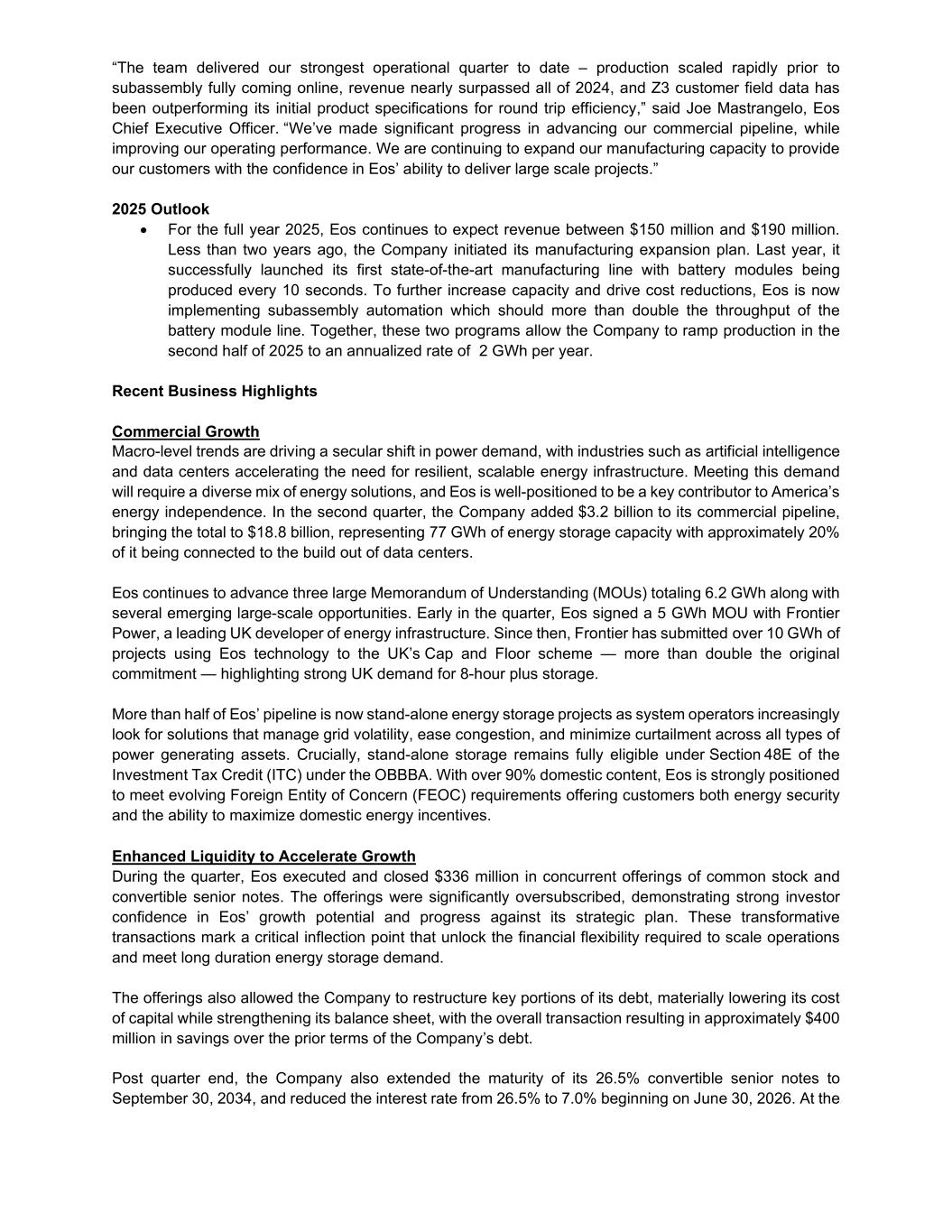 “The team delivered our strongest operational quarter to date – production scaled rapidly prior to subassembly fully coming online, revenue nearly surpassed all of 2024, and Z3 customer field data has been outperforming its initial product specifications for round trip efficiency,” said Joe Mastrangelo, Eos Chief Executive Officer. “We’ve made significant progress in advancing our commercial pipeline, while improving our operating performance. We are continuing to expand our manufacturing capacity to provide our customers with the confidence in Eos’ ability to deliver large scale projects.” 2025 Outlook • For the full year 2025, Eos continues to expect revenue between $150 million and $190 million. Less than two years ago, the Company initiated its manufacturing expansion plan. Last year, it successfully launched its first state-of-the-art manufacturing line with battery modules being produced every 10 seconds. To further increase capacity and drive cost reductions, Eos is now implementing subassembly automation which should more than double the throughput of the battery module line. Together, these two programs allow the Company to ramp production in the second half of 2025 to an annualized rate of 2 GWh per year. Recent Business Highlights Commercial Growth Macro-level trends are driving a secular shift in power demand, with industries such as artificial intelligence and data centers accelerating the need for resilient, scalable energy infrastructure. Meeting this demand will require a diverse mix of energy solutions, and Eos is well-positioned to be a key contributor to America’s energy independence. In the second quarter, the Company added $3.2 billion to its commercial pipeline, bringing the total to $18.8 billion, representing 77 GWh of energy storage capacity with approximately 20% of it being connected to the build out of data centers. Eos continues to advance three large Memorandum of Understanding (MOUs) totaling 6.2 GWh along with several emerging large-scale opportunities. Early in the quarter, Eos signed a 5 GWh MOU with Frontier Power, a leading UK developer of energy infrastructure. Since then, Frontier has submitted over 10 GWh of projects using Eos technology to the UK’s Cap and Floor scheme — more than double the original commitment — highlighting strong UK demand for 8-hour plus storage. More than half of Eos’ pipeline is now stand-alone energy storage projects as system operators increasingly look for solutions that manage grid volatility, ease congestion, and minimize curtailment across all types of power generating assets. Crucially, stand-alone storage remains fully eligible under Section 48E of the Investment Tax Credit (ITC) under the OBBBA. With over 90% domestic content, Eos is strongly positioned to meet evolving Foreign Entity of Concern (FEOC) requirements offering customers both energy security and the ability to maximize domestic energy incentives. Enhanced Liquidity to Accelerate Growth During the quarter, Eos executed and closed $336 million in concurrent offerings of common stock and convertible senior notes. The offerings were significantly oversubscribed, demonstrating strong investor confidence in Eos’ growth potential and progress against its strategic plan. These transformative transactions mark a critical inflection point that unlock the financial flexibility required to scale operations and meet long duration energy storage demand. The offerings also allowed the Company to restructure key portions of its debt, materially lowering its cost of capital while strengthening its balance sheet, with the overall transaction resulting in approximately $400 million in savings over the prior terms of the Company’s debt. Post quarter end, the Company also extended the maturity of its 26.5% convertible senior notes to September 30, 2034, and reduced the interest rate from 26.5% to 7.0% beginning on June 30, 2026. At the