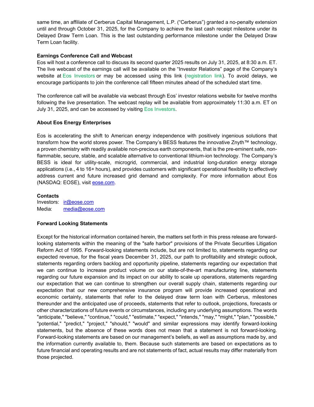 same time, an affiliate of Cerberus Capital Management, L.P. (“Cerberus”) granted a no-penalty extension until and through October 31, 2025, for the Company to achieve the last cash receipt milestone under its Delayed Draw Term Loan. This is the last outstanding performance milestone under the Delayed Draw Term Loan facility. Earnings Conference Call and Webcast Eos will host a conference call to discuss its second quarter 2025 results on July 31, 2025, at 8:30 a.m. ET. The live webcast of the earnings call will be available on the “Investor Relations” page of the Company’s website at Eos Investors or may be accessed using this link (registration link). To avoid delays, we encourage participants to join the conference call fifteen minutes ahead of the scheduled start time. The conference call will be available via webcast through Eos’ investor relations website for twelve months following the live presentation. The webcast replay will be available from approximately 11:30 a.m. ET on July 31, 2025, and can be accessed by visiting Eos Investors. About Eos Energy Enterprises Eos is accelerating the shift to American energy independence with positively ingenious solutions that transform how the world stores power. The Company’s BESS features the innovative Znyth™ technology, a proven chemistry with readily available non-precious earth components, that is the pre-eminent safe, non- flammable, secure, stable, and scalable alternative to conventional lithium-ion technology. The Company’s BESS is ideal for utility-scale, microgrid, commercial, and industrial long-duration energy storage applications (i.e., 4 to 16+ hours), and provides customers with significant operational flexibility to effectively address current and future increased grid demand and complexity. For more information about Eos (NASDAQ: EOSE), visit eose.com. Contacts Investors: ir@eose.com Media: media@eose.com Forward Looking Statements Except for the historical information contained herein, the matters set forth in this press release are forward- looking statements within the meaning of the "safe harbor" provisions of the Private Securities Litigation Reform Act of 1995. Forward-looking statements include, but are not limited to, statements regarding our expected revenue, for the fiscal years December 31, 2025, our path to profitability and strategic outlook, statements regarding orders backlog and opportunity pipeline, statements regarding our expectation that we can continue to increase product volume on our state-of-the-art manufacturing line, statements regarding our future expansion and its impact on our ability to scale up operations, statements regarding our expectation that we can continue to strengthen our overall supply chain, statements regarding our expectation that our new comprehensive insurance program will provide increased operational and economic certainty, statements that refer to the delayed draw term loan with Cerberus, milestones thereunder and the anticipated use of proceeds, statements that refer to outlook, projections, forecasts or other characterizations of future events or circumstances, including any underlying assumptions. The words "anticipate," "believe," "continue," "could," "estimate," "expect," "intends," "may," "might," "plan," "possible," "potential," "predict," "project," "should," "would" and similar expressions may identify forward-looking statements, but the absence of these words does not mean that a statement is not forward-looking. Forward-looking statements are based on our management’s beliefs, as well as assumptions made by, and the information currently available to, them. Because such statements are based on expectations as to future financial and operating results and are not statements of fact, actual results may differ materially from those projected.