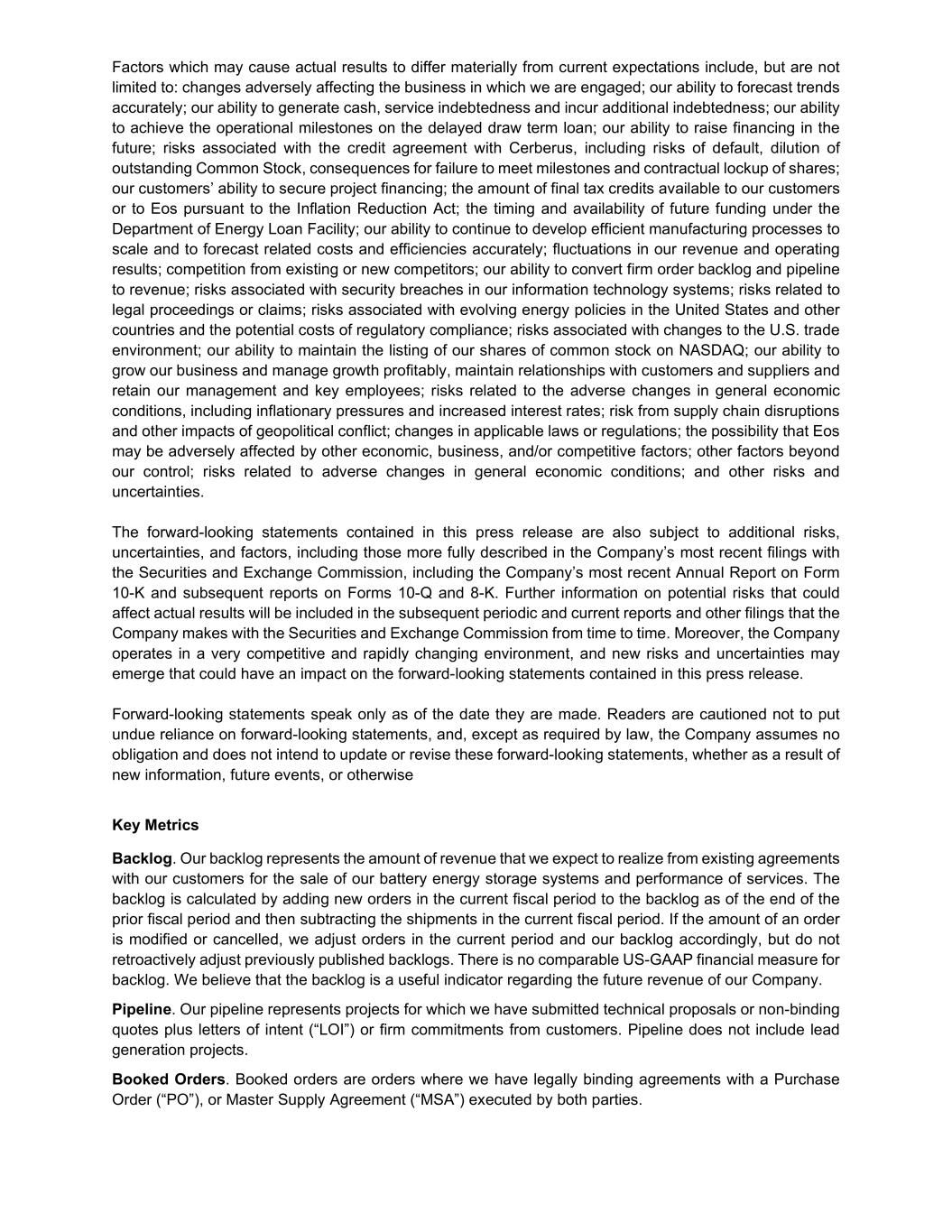 Factors which may cause actual results to differ materially from current expectations include, but are not limited to: changes adversely affecting the business in which we are engaged; our ability to forecast trends accurately; our ability to generate cash, service indebtedness and incur additional indebtedness; our ability to achieve the operational milestones on the delayed draw term loan; our ability to raise financing in the future; risks associated with the credit agreement with Cerberus, including risks of default, dilution of outstanding Common Stock, consequences for failure to meet milestones and contractual lockup of shares; our customers’ ability to secure project financing; the amount of final tax credits available to our customers or to Eos pursuant to the Inflation Reduction Act; the timing and availability of future funding under the Department of Energy Loan Facility; our ability to continue to develop efficient manufacturing processes to scale and to forecast related costs and efficiencies accurately; fluctuations in our revenue and operating results; competition from existing or new competitors; our ability to convert firm order backlog and pipeline to revenue; risks associated with security breaches in our information technology systems; risks related to legal proceedings or claims; risks associated with evolving energy policies in the United States and other countries and the potential costs of regulatory compliance; risks associated with changes to the U.S. trade environment; our ability to maintain the listing of our shares of common stock on NASDAQ; our ability to grow our business and manage growth profitably, maintain relationships with customers and suppliers and retain our management and key employees; risks related to the adverse changes in general economic conditions, including inflationary pressures and increased interest rates; risk from supply chain disruptions and other impacts of geopolitical conflict; changes in applicable laws or regulations; the possibility that Eos may be adversely affected by other economic, business, and/or competitive factors; other factors beyond our control; risks related to adverse changes in general economic conditions; and other risks and uncertainties. The forward-looking statements contained in this press release are also subject to additional risks, uncertainties, and factors, including those more fully described in the Company’s most recent filings with the Securities and Exchange Commission, including the Company’s most recent Annual Report on Form 10-K and subsequent reports on Forms 10-Q and 8-K. Further information on potential risks that could affect actual results will be included in the subsequent periodic and current reports and other filings that the Company makes with the Securities and Exchange Commission from time to time. Moreover, the Company operates in a very competitive and rapidly changing environment, and new risks and uncertainties may emerge that could have an impact on the forward-looking statements contained in this press release. Forward-looking statements speak only as of the date they are made. Readers are cautioned not to put undue reliance on forward-looking statements, and, except as required by law, the Company assumes no obligation and does not intend to update or revise these forward-looking statements, whether as a result of new information, future events, or otherwise Key Metrics Backlog. Our backlog represents the amount of revenue that we expect to realize from existing agreements with our customers for the sale of our battery energy storage systems and performance of services. The backlog is calculated by adding new orders in the current fiscal period to the backlog as of the end of the prior fiscal period and then subtracting the shipments in the current fiscal period. If the amount of an order is modified or cancelled, we adjust orders in the current period and our backlog accordingly, but do not retroactively adjust previously published backlogs. There is no comparable US-GAAP financial measure for backlog. We believe that the backlog is a useful indicator regarding the future revenue of our Company. Pipeline. Our pipeline represents projects for which we have submitted technical proposals or non-binding quotes plus letters of intent (“LOI”) or firm commitments from customers. Pipeline does not include lead generation projects. Booked Orders. Booked orders are orders where we have legally binding agreements with a Purchase Order (“PO”), or Master Supply Agreement (“MSA”) executed by both parties.