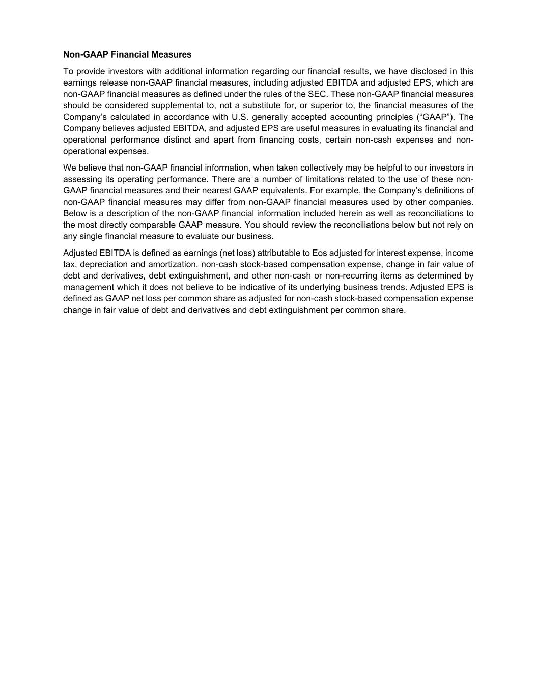 Non-GAAP Financial Measures To provide investors with additional information regarding our financial results, we have disclosed in this earnings release non-GAAP financial measures, including adjusted EBITDA and adjusted EPS, which are non-GAAP financial measures as defined under the rules of the SEC. These non-GAAP financial measures should be considered supplemental to, not a substitute for, or superior to, the financial measures of the Company’s calculated in accordance with U.S. generally accepted accounting principles (“GAAP”). The Company believes adjusted EBITDA, and adjusted EPS are useful measures in evaluating its financial and operational performance distinct and apart from financing costs, certain non-cash expenses and non- operational expenses. We believe that non-GAAP financial information, when taken collectively may be helpful to our investors in assessing its operating performance. There are a number of limitations related to the use of these non- GAAP financial measures and their nearest GAAP equivalents. For example, the Company’s definitions of non-GAAP financial measures may differ from non-GAAP financial measures used by other companies. Below is a description of the non-GAAP financial information included herein as well as reconciliations to the most directly comparable GAAP measure. You should review the reconciliations below but not rely on any single financial measure to evaluate our business. Adjusted EBITDA is defined as earnings (net loss) attributable to Eos adjusted for interest expense, income tax, depreciation and amortization, non-cash stock-based compensation expense, change in fair value of debt and derivatives, debt extinguishment, and other non-cash or non-recurring items as determined by management which it does not believe to be indicative of its underlying business trends. Adjusted EPS is defined as GAAP net loss per common share as adjusted for non-cash stock-based compensation expense change in fair value of debt and derivatives and debt extinguishment per common share.