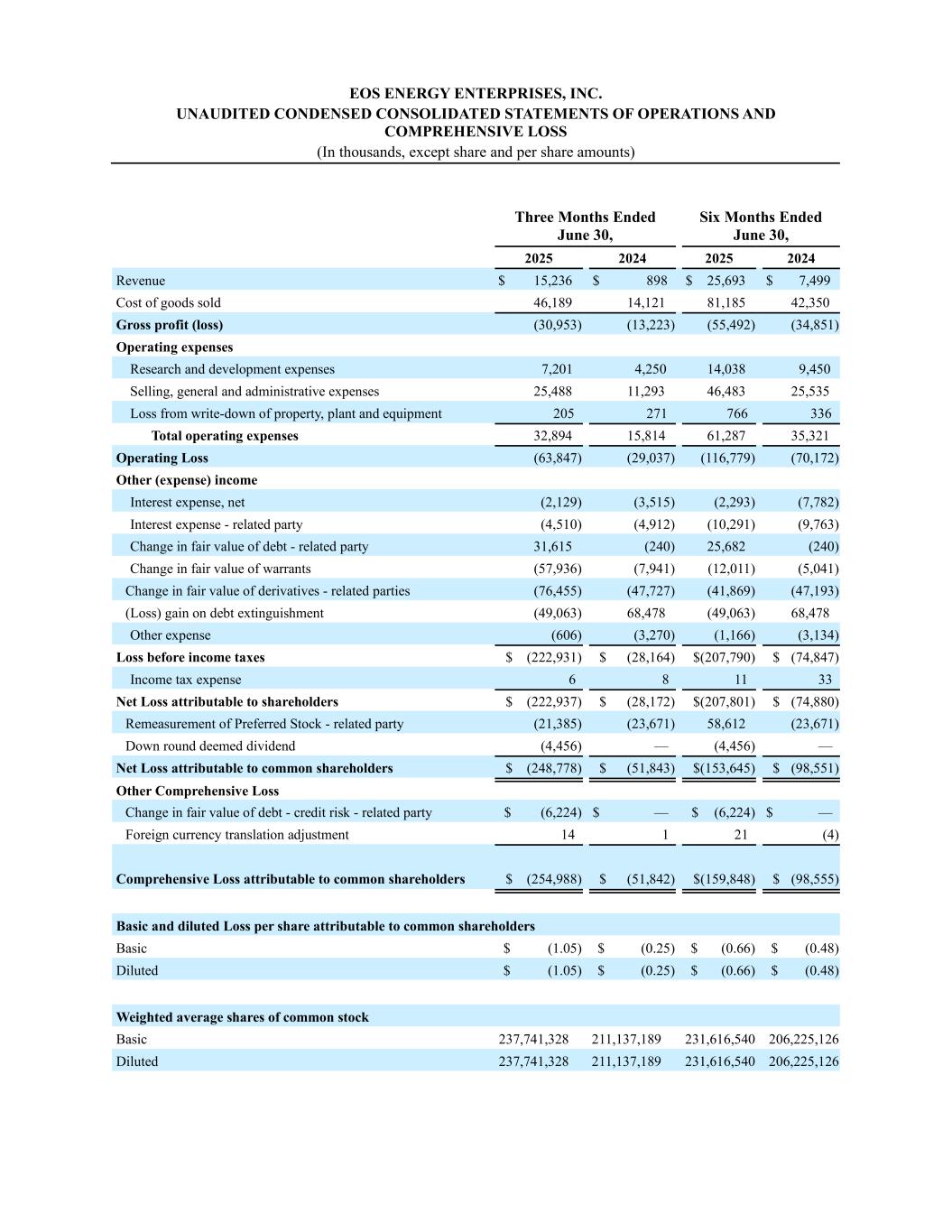 EOS ENERGY ENTERPRISES, INC. UNAUDITED CONDENSED CONSOLIDATED STATEMENTS OF OPERATIONS AND COMPREHENSIVE LOSS (In thousands, except share and per share amounts) Three Months Ended June 30, Six Months Ended June 30, 2025 2024 2025 2024 Revenue $ 15,236 $ 898 $ 25,693 $ 7,499 Cost of goods sold 46,189 14,121 81,185 42,350 Gross profit (loss) (30,953) (13,223) (55,492) (34,851) Operating expenses Research and development expenses 7,201 4,250 14,038 9,450 Selling, general and administrative expenses 25,488 11,293 46,483 25,535 Loss from write-down of property, plant and equipment 205 271 766 336 Total operating expenses 32,894 15,814 61,287 35,321 Operating Loss (63,847) (29,037) (116,779) (70,172) Other (expense) income Interest expense, net (2,129) (3,515) (2,293) (7,782) Interest expense - related party (4,510) (4,912) (10,291) (9,763) Change in fair value of debt - related party 31,615 (240) 25,682 (240) Change in fair value of warrants (57,936) (7,941) (12,011) (5,041) Change in fair value of derivatives - related parties (76,455) (47,727) (41,869) (47,193) (Loss) gain on debt extinguishment (49,063) 68,478 (49,063) 68,478 Other expense (606) (3,270) (1,166) (3,134) Loss before income taxes $ (222,931) $ (28,164) $(207,790) $ (74,847) Income tax expense 6 8 11 33 Net Loss attributable to shareholders $ (222,937) $ (28,172) $(207,801) $ (74,880) Remeasurement of Preferred Stock - related party (21,385) (23,671) 58,612 (23,671) Down round deemed dividend (4,456) — (4,456) — Net Loss attributable to common shareholders $ (248,778) $ (51,843) $(153,645) $ (98,551) Other Comprehensive Loss Change in fair value of debt - credit risk - related party $ (6,224) $ — $ (6,224) $ — Foreign currency translation adjustment 14 1 21 (4) Comprehensive Loss attributable to common shareholders $ (254,988) $ (51,842) $(159,848) $ (98,555) Basic and diluted Loss per share attributable to common shareholders Basic $ (1.05) $ (0.25) $ (0.66) $ (0.48) Diluted $ (1.05) $ (0.25) $ (0.66) $ (0.48) Weighted average shares of common stock Basic 237,741,328 211,137,189 231,616,540 206,225,126 Diluted 237,741,328 211,137,189 231,616,540 206,225,126