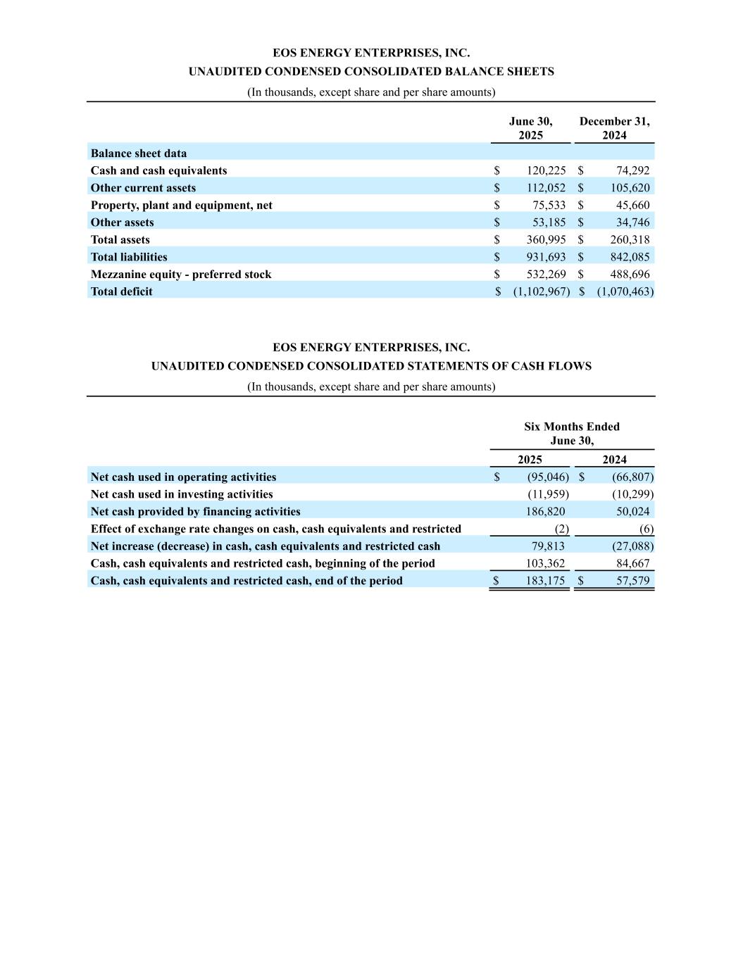 EOS ENERGY ENTERPRISES, INC. UNAUDITED CONDENSED CONSOLIDATED BALANCE SHEETS (In thousands, except share and per share amounts) June 30, 2025 December 31, 2024 Balance sheet data Cash and cash equivalents $ 120,225 $ 74,292 Other current assets $ 112,052 $ 105,620 Property, plant and equipment, net $ 75,533 $ 45,660 Other assets $ 53,185 $ 34,746 Total assets $ 360,995 $ 260,318 Total liabilities $ 931,693 $ 842,085 Mezzanine equity - preferred stock $ 532,269 $ 488,696 Total deficit $ (1,102,967) $ (1,070,463) EOS ENERGY ENTERPRISES, INC. UNAUDITED CONDENSED CONSOLIDATED STATEMENTS OF CASH FLOWS (In thousands, except share and per share amounts) Six Months Ended June 30, 2025 2024 Net cash used in operating activities $ (95,046) $ (66,807) Net cash used in investing activities (11,959) (10,299) Net cash provided by financing activities 186,820 50,024 Effect of exchange rate changes on cash, cash equivalents and restricted (2) (6) Net increase (decrease) in cash, cash equivalents and restricted cash 79,813 (27,088) Cash, cash equivalents and restricted cash, beginning of the period 103,362 84,667 Cash, cash equivalents and restricted cash, end of the period $ 183,175 $ 57,579