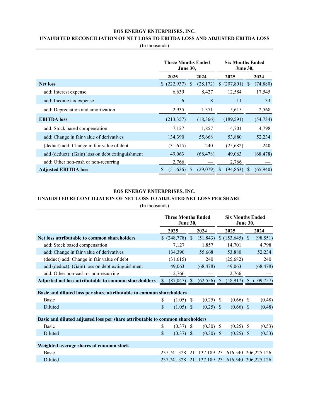 Three Months Ended June 30, Six Months Ended June 30, 2025 2024 2025 2024 Net loss $ (222,937) $ (28,172) $ (207,801) $ (74,880) add: Interest expense 6,639 8,427 12,584 17,545 add: Income tax expense 6 8 11 33 add: Depreciation and amortization 2,935 1,371 5,615 2,568 EBITDA loss (213,357) (18,366) (189,591) (54,734) add: Stock based compensation 7,127 1,857 14,701 4,798 add: Change in fair value of derivatives 134,390 55,668 53,880 52,234 (deduct) add: Change in fair value of debt (31,615) 240 (25,682) 240 add (deduct): (Gain) loss on debt extinguishment 49,063 (68,478) 49,063 (68,478) add: Other non-cash or non-recurring 2,766 — 2,766 — Adjusted EBITDA loss $ (51,626) $ (29,079) $ (94,863) $ (65,940) EOS ENERGY ENTERPRISES, INC. UNAUDITED RECONCILIATION OF NET LOSS TO ADJUSTED NET LOSS PER SHARE (In thousands) Three Months Ended June 30, Six Months Ended June 30, 2025 2024 2025 2024 Net loss attributable to common shareholders $ (248,778) $ (51,843) $ (153,645) $ (98,551) add: Stock based compensation 7,127 1,857 14,701 4,798 add: Change in fair value of derivatives 134,390 55,668 53,880 52,234 (deduct) add: Change in fair value of debt (31,615) 240 (25,682) 240 add (deduct): (Gain) loss on debt extinguishment 49,063 (68,478) 49,063 (68,478) add: Other non-cash or non-recurring 2,766 — 2,766 — Adjusted net loss attributable to common shareholders $ (87,047) $ (62,556) $ (58,917) $ (109,757) Basic and diluted loss per share attributable to common shareholders Basic $ (1.05) $ (0.25) $ (0.66) $ (0.48) Diluted $ (1.05) $ (0.25) $ (0.66) $ (0.48) Basic and diluted adjusted loss per share attributable to common shareholders Basic $ (0.37) $ (0.30) $ (0.25) $ (0.53) Diluted $ (0.37) $ (0.30) $ (0.25) $ (0.53) Weighted average shares of common stock Basic 237,741,328 211,137,189 231,616,540 206,225,126 Diluted 237,741,328 211,137,189 231,616,540 206,225,126 EOS ENERGY ENTERPRISES, INC. UNAUDITED RECONCILIATION OF NET LOSS TO EBITDA LOSS AND ADJUSTED EBITDA LOSS (In thousands)