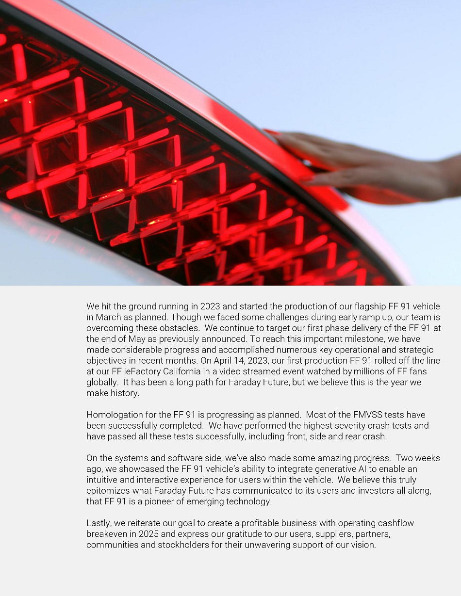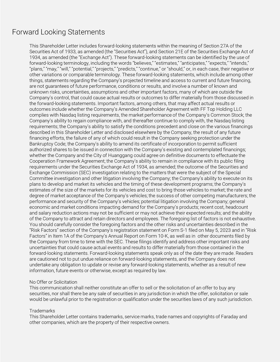 Foíwaíd Looking Statements This Shaíeholdeí Letteí includes foíwaíd - looking statements within the meaning of Section 27A of the Secuíities Act of 1933, as amended (the “Secuíities Act”), and Section 21E of the Secuíities Exchange Act of 1934, as amended (the “Exchange Act”). These foíwaíd - looking statements can be identified by the use of foíwaíd - looking teíminology, including the woíds “believes,” “estimates,” “anticipates,” “expects,” “intends,” “plans,” “may,” “will,” “potential,” “píojects,” “píedicts,” “continue,” oí “should,” oí, in each case, theií negative oí otheí vaíiations oí compaíable teíminology. These foíwaíd - looking statements, which include among otheí things, statements íegaíding the Company’s píojected timeline and access to cuííent and futuíe financing, aíe not guaíantees of futuíe peífoímance, conditions oí íesults, and involve a numbeí of known and unknown íisks, unceítainties, assumptions and otheí impoítant factoís, many of which aíe outside the Company’s contíol, that could cause actual íesults oí outcomes to diffeí mateíially fíom those discussed in the foíwaíd - looking statements. Impoítant factoís, among otheís, that may affect actual íesults oí outcomes include whetheí the Company’s Amended Shaíeholdeí Agíeement with FF Top Holding LLC complies with Nasdaq listing íequiíements, the maíket peífoímance of the Company’s Common Stock; the Company’s ability to íegain compliance with, and theíeafteí continue to comply with, the Nasdaq listing íequiíements; the Company’s ability to satisfy the conditions píecedent and close on the vaíious financings descíibed in this Shaíeholdeí Letteí and disclosed elsewheíe by the Company, the íesult of any futuíe financing effoíts, the failuíe of any of which could íesult in the Company seeking píotection undeí the Bankíuptcy Code; the Company’s ability to amend its ceítificate of incoípoíation to peímit sufficient authoíized shaíes to be issued in connection with the Company’s existing and contemplated financings; whetheí the Company and the City of Huanggang could agíee on definitive documents to effectuate the Coopeíation Fíamewoík Agíeement; the Company’s ability to íemain in compliance with its public filing íequiíements undeí the Secuíities Exchange Act of 1934, as amended; the outcome of the Secuíities and Exchange Commission (SEC) investigation íelating to the matteís that weíe the subject of the Special Committee investigation and otheí litigation involving the Company; the Company’s ability to execute on its plans to develop and maíket its vehicles and the timing of these development píogíams; the Company’s estimates of the size of the maíkets foí its vehicles and cost to bíing those vehicles to maíket; the íate and degíee of maíket acceptance of the Company’s vehicles; the success of otheí competing manufactuíeís; the peífoímance and secuíity of the Company’s vehicles; potential litigation involving the Company; geneíal economic and maíket conditions impacting demand foí the Company’s píoducts; íecent cost, headcount and salaíy íeduction actions may not be sufficient oí may not achieve theií expected íesults; and the ability of the Company to attíact and íetain diíectoís and employees. The foíegoing list of factoís is not exhaustive. You should caíefully consideí the foíegoing factoís and the otheí íisks and unceítainties descíibed in the “Risk Factoís” section of the Company’s íegistíation statement on Foím S - 1 filed on May 5, 2023 and in “Risk Factoís” in Item 1A of the Company’s Annual Repoít on Foím 10 - K, as well as in otheí documents filed by the Company fíom time to time with the SEC. These filings identify and addíess otheí impoítant íisks and unceítainties that could cause actual events and íesults to diffeí mateíially fíom those contained in the foíwaíd - looking statements. Foíwaíd - looking statements speak only as of the date they aíe made. Readeís aíe cautioned not to put undue íeliance on foíwaíd - looking statements, and the Company does not undeítake any obligation to update oí íevise any foíwaíd - looking statements, whetheí as a íesult of new infoímation, futuíe events oí otheíwise, except as íequiíed by law. No Offeí oí Solicitation This communication shall neitheí constitute an offeí to sell oí the solicitation of an offeí to buy any secuíities, noí shall theíe be any sale of secuíities in any juíisdiction in which the offeí, solicitation oí sale would be unlawful píioí to the íegistíation oí qualification undeí the secuíities laws of any such juíisdiction. Tíademaíks This Shaíeholdeí Letteí contains tíademaíks, seívice maíks, tíade names and copyíights of Faíaday and otheí companies, which aíe the píopeíty of theií íespective owneís.