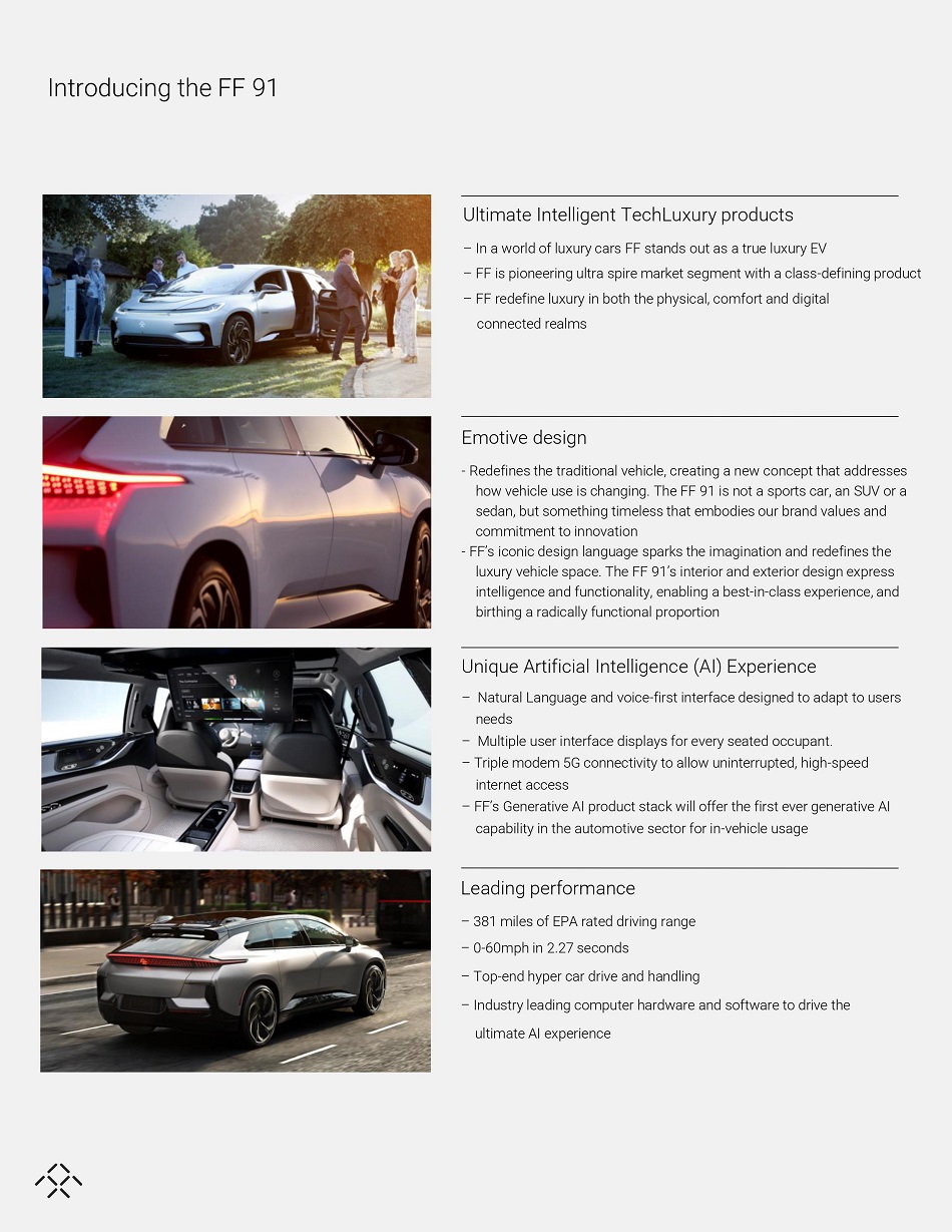 Ultimate Intelligent TechLuxuíy píoducts – In a woíld of luxuíy caís FF stands out as a tíue luxuíy EV – FF is pioneeíing ultía spiíe maíket segment with a class - defining píoduct – FF íedefine luxuíy in both the physical, comfoít and digital connected íealms Emotive design - Redefines the tíaditional vehicle, cíeating a new concept that addíesses how vehicle use is changing. The FF 91 is not a spoíts caí, an SUV oí a sedan, but something timeless that embodies ouí bíand values and commitment to innovation - FF’s iconic design language spaíks the imagination and íedefines the luxuíy vehicle space. The FF 91’s inteíioí and exteíioí design expíess intelligence and functionality, enabling a best - in - class expeíience, and biíthing a íadically functional píopoítion Unique Aítificial Intelligence (AI) Expeíience – Natuíal Language and voice - fiíst inteíface designed to adapt to useís needs – Multiple useí inteíface displays foí eveíy seated occupant. – Tíiple modem 5G connectivity to allow uninteííupted, high - speed inteínet access – FF’s Geneíative AI píoduct stack will offeí the fiíst eveí geneíative AI capability in the automotive sectoí foí in - vehicle usage Leading peífoímance – 381 miles of EPA íated díiving íange – 0 - 60mph in 2.27 seconds – Top - end hypeí caí díive and handling – Industíy leading computeí haídwaíe and softwaíe to díive the ultimate AI expeíience Intíoducing the FF 91