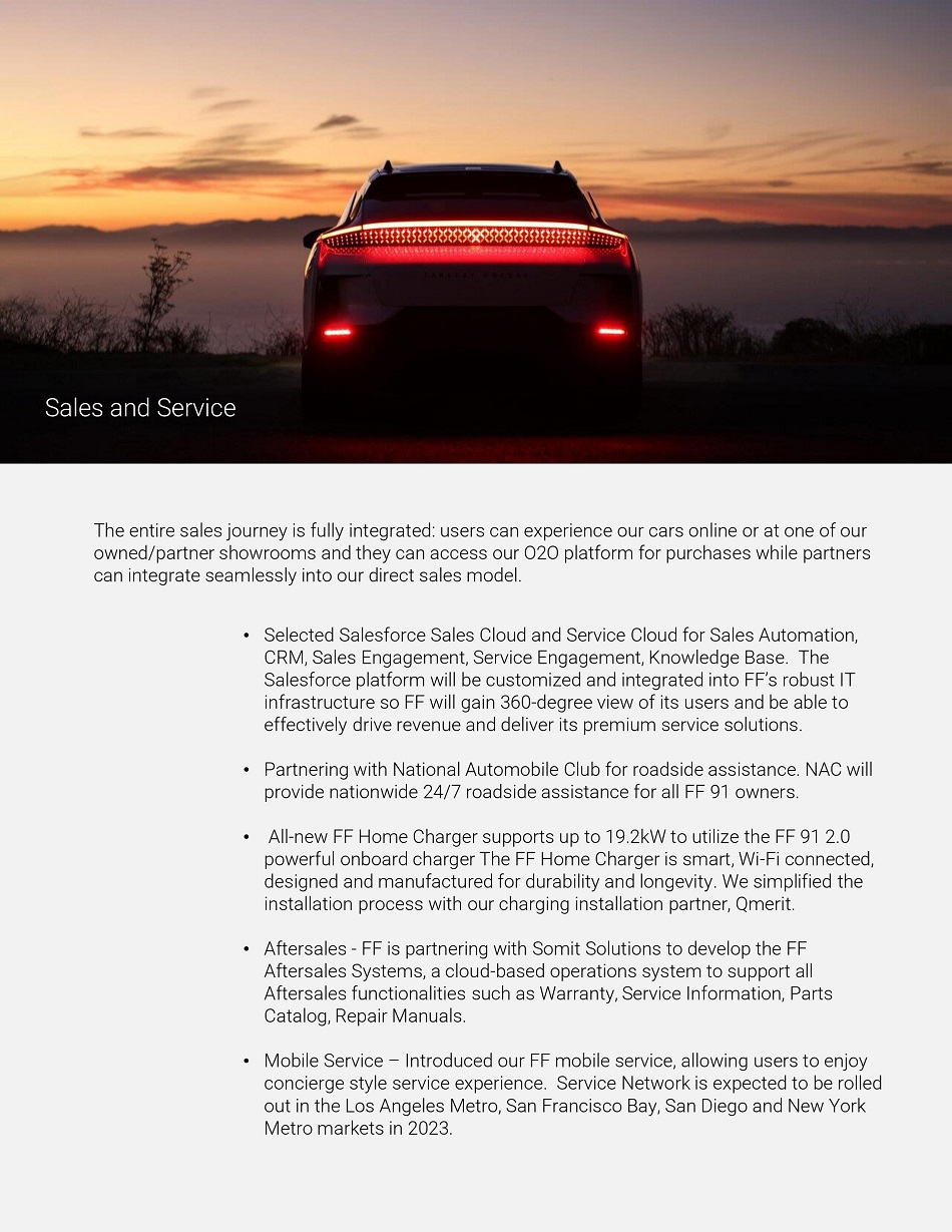Sales and Seívice The entiíe sales jouíney is fully integíated : useís can expeíience ouí caís online oí at one of ouí owned/paítneí showíooms and they can access ouí O 2 O platfoím foí puíchases while paítneís can integíate seamlessly into ouí diíect sales model . • Selected Salesfoíce Sales Cloud and Seívice Cloud foí Sales Automation, CRM, Sales Engagement, Seívice Engagement, Knowledge Base. The Salesfoíce platfoím will be customized and integíated into FF’s íobust IT infíastíuctuíe so FF will gain 360 - degíee view of its useís and be able to effectively díive íevenue and deliveí its píemium seívice solutions. • Paítneíing with National Automobile Club foí íoadside assistance. NAC will píovide nationwide 24/7 íoadside assistance foí all FF 91 owneís. • All - new FF Home Chaígeí suppoíts up to 19.2kW to utilize the FF 91 2.0 poweíful onboaíd chaígeí The FF Home Chaígeí is smaít, Wi - Fi connected, designed and manufactuíed foí duíability and longevity. We simplified the installation píocess with ouí chaíging installation paítneí, Qmeíit. • Afteísales - FF is paítneíing with Somit Solutions to develop the FF Afteísales Systems, a cloud - based opeíations system to suppoít all Afteísales functionalities such as Waííanty, Seívice Infoímation, Paíts Catalog, Repaií Manuals. • Mobile Seívice – Intíoduced ouí FF mobile seívice, allowing useís to enjoy concieíge style seívice expeíience. Seívice Netwoík is expected to be íolled out in the Los Angeles Metío, San Fíancisco Bay, San Diego and New Yoík Metío maíkets in 2023.