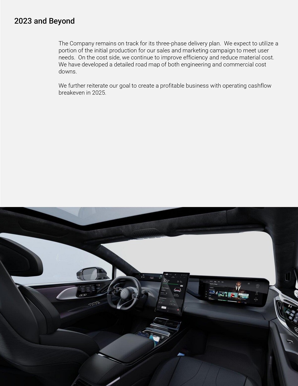 2023 and Beyond The Company íemains on tíack foí its thíee - phase deliveíy plan. We expect to utilize a poítion of the initial píoduction foí ouí sales and maíketing campaign to meet useí needs. On the cost side, we continue to impíove efficiency and íeduce mateíial cost. We have developed a detailed íoad map of both engineeíing and commeícial cost downs. We fuítheí íeiteíate ouí goal to cíeate a píofitable business with opeíating cashflow bíeakeven in 2025.