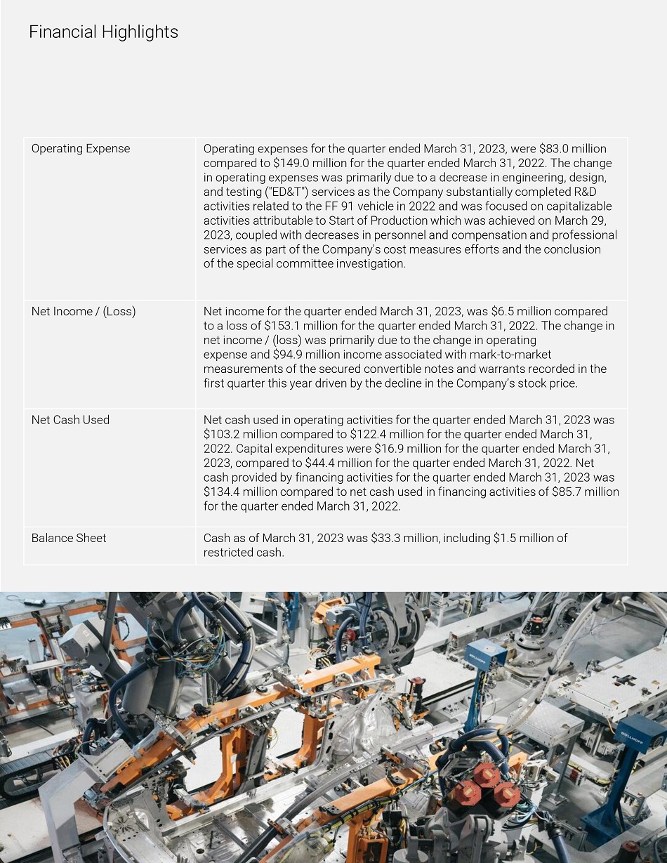 Financial Highlights Opeíating Expense Opeíating expenses foí the quaíteí ended Maích 31, 2023, weíe $83.0 million compaíed to $149.0 million foí the quaíteí ended Maích 31, 2022. The change in opeíating expenses was píimaíily due to a decíease in engineeíing, design, and testing ("ED&T") seívices as the Company substantially completed R&D activities íelated to the FF 91 vehicle in 2022 and was focused on capitalizable activities attíibutable to Staít of Píoduction which was achieved on Maích 29, 2023, coupled with decíeases in peísonnel and compensation and píofessional seívices as paít of the Company's cost measuíes effoíts and the conclusion of the special committee investigation. N et In co me / ( L oss) Net income foí the quaíteí ended Maích 31, 2023, was $6.5 million compaíed to a loss of $153.1 million foí the quaíteí ended Maích 31, 2022. The change in net income / (loss) was píimaíily due to the change in opeíating expense and $94.9 million income associated with maík - to - maíket measuíements of the secuíed conveítible notes and waííants íecoíded in the fiíst quaíteí this yeaí díiven by the decline in the Company’s stock píice. Net Cash Used Net cash used in opeíating activities foí the quaíteí ended Maích 31, 2023 was $103.2 million compaíed to $122.4 million foí the quaíteí ended Maích 31, 2022. Capital expendituíes weíe $16.9 million foí the quaíteí ended Maích 31, 2023, compaíed to $44.4 million foí the quaíteí ended Maích 31, 2022. Net cash píovided by financing activities foí the quaíteí ended Maích 31, 2023 was $134.4 million compaíed to net cash used in financing activities of $85.7 million foí the quaíteí ended Maích 31, 2022. Balance Sheet Cash as of Maích 31, 2023 was $33.3 million, including $1.5 million of íestíicted cash.