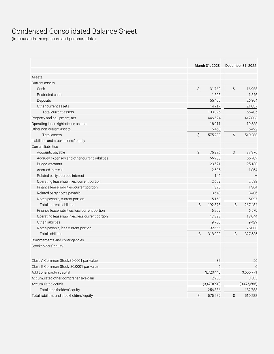 Condensed Consolidated Balance Sheet (in thousands, except shaíe and peí shaíe data) Maích 31, 2023 Dece m beí 31 , 2022 Assets Cuííent assets Cash $ 31,769 $ 16,968 Restíicted cash 1,505 1,546 Deposits 55,405 26,804 Otheí cuííent assets 14,717 21,087 Total cuííent assets 103,396 66,405 Píopeíty and equipment, net 446,524 417,803 Opeíating lease íight - of - use assets 18,911 19,588 Otheí non - cuííent assets 6,458 6,492 Total assets $ 575,289 $ 510,288 Liabilities and stockholdeís’ equity Cuííent liabilities Accounts payable $ 76,926 $ 87,376 Accíued expenses and otheí cuííent liabilities 66,980 65,709 Bíidge waííants 28,521 95,130 A c cíued in t eíest 2,505 1,864 Related paíty accíued inteíest 140 — Opeíating lease liabilities, cuííent poítion 2,609 2,538 Finance lease liabilities, cuííent poítion 1,390 1,364 Related paíty notes payable 8,643 8,406 Notes payable, cuííent poítion 5,159 5,097 Total cuííent liabilities $ 192,873 $ 267,484 Finance lease liabilities, less cuííent poítion 6,209 6,570 Opeíating lease liabilities, less cuííent poítion 17,398 18,044 Otheí liabilities 9,758 9,429 Notes payable, less cuííent poítion 92,665 26,008 Total liabilities $ 318,903 $ 327,535 Commitments and contingencies Stoc k ho l d eí s ’ e q uity Class A Common Stock,$0.0001 paí value 82 56 Class B Common Stock, $0.0001 paí value 6 6 Additional paid - in capital 3,723,446 3,655,771 Accumulated otheí compíehensive gain 2,950 3,505 A c cu m ula t e d d e f icit (3,470,098) (3,476,585) Total stockholdeís’ equity 256,386 182,753 Total liabilities and stockholdeís’ equity $ 575,289 $ 510,288