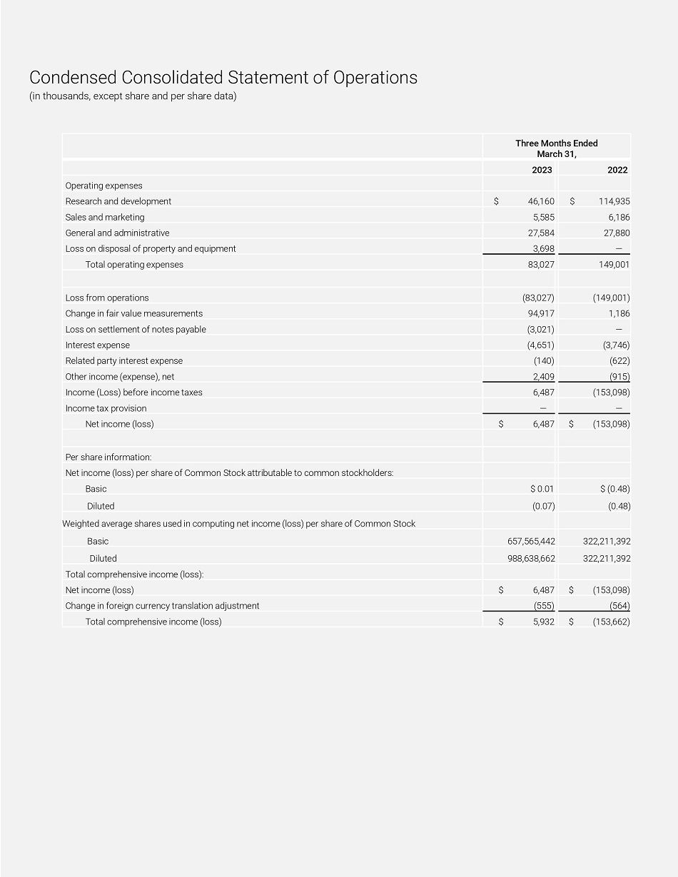 Condensed Consolidated Statement of Opeíations (in thousands, except shaíe and peí shaíe data) ľhíee Months Ended Maích 31, 2023 2022 O pe í a t ing expenses Reseaích and development $ 46,160 $ 114,935 S al es a nd ma í k e ting 5,585 6,186 Geneíal and administíative 27,584 27,880 Loss on disposal of píopeíty and equipment 3,698 — Total opeíating expenses 83,027 149,001 Loss fíom opeíations (83,027) (149,001) Change in faií value measuíements 94,917 1,186 Loss on settlement of notes payable (3,021) — Inteíest expense (4,651) (3,746) Related paíty inteíest expense (140) (622) Otheí income (expense), net 2,409 (915) Income (Loss) befoíe income taxes 6,487 (153,098) Income tax píovision — — Net income (loss) $ 6,487 $ (153,098) Peí shaíe infoímation: Net income (loss) peí shaíe of Common Stock attíibutable to common stockholdeís: Basic $ 0.01 $ (0.48) Diluted (0.07) (0.48) Weighted aveíage shaíes used in computing net income (loss) peí shaíe of Common Stock Basic 657,565,442 322,211,392 Diluted 988,638,662 322,211,392 Total compíehensive income (loss): Net income (loss) $ 6,487 $ (153,098) Change in foíeign cuííency tíanslation adjustment (555) (564) Total compíehensive income (loss) $ 5,932 $ (153,662)