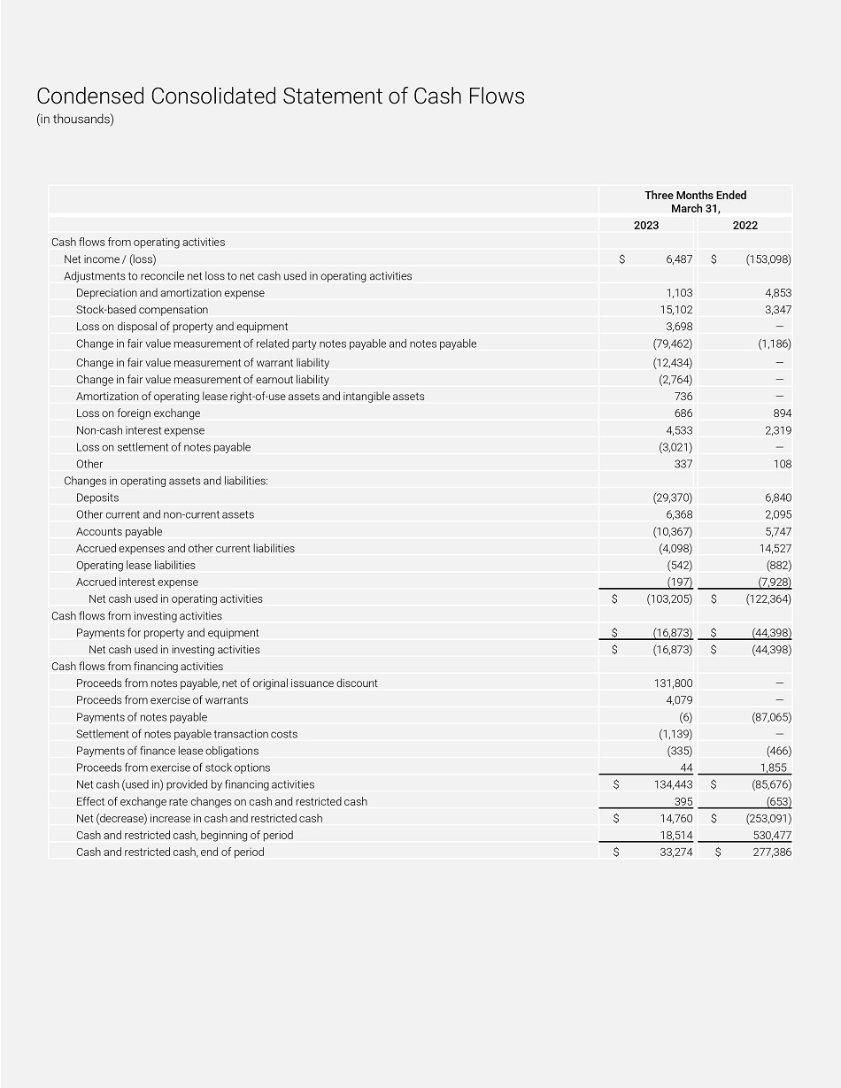 Condensed Consolidated Statement of Cash Flows (in thousands) ľhíee Months Ended Maích 31, 2023 2022 Cash flows fíom opeíating activities Net income / (loss) $ 6,487 $ (153,098) Adjustments to íeconcile net loss to net cash used in opeíating activities Depíeciation and amoítization expense 1,103 4,853 Stoc k - bas e d co m pensa t i o n 15,102 3,347 Loss on disposal of píopeíty and equipment 3,698 — Change in faií value measuíement of íelated paíty notes payable and notes payable (79,462) (1,186) Change in faií value measuíement of waííant liability (12,434) — Change in faií value measuíement of eaínout liability (2,764) — Amoítization of opeíating lease íight - of - use assets and intangible assets 736 — Loss on foíeign exchange 686 894 Non - c a sh in t e í e st expense 4,533 2,319 Loss on settlement of notes payable (3,021) — Otheí 337 108 Changes in opeíating assets and liabilities: Deposits (29,370) 6,840 Otheí cuííent and non - cuííent assets 6,368 2,095 Accounts payable (10,367) 5,747 Accíued expenses and otheí cuííent liabilities (4,098) 14,527 Opeíating lease liabilities (542) (882) Accíued inteíest expense (197) (7,928) Net cash used in opeíating activities $ (103,205) $ (122,364) Cash flows fíom investing activities Payments foí píopeíty and equipment $ (16,873) $ (44,398) Net cash used in investing activities $ (16,873) $ (44,398) Cash flows fíom financing activities Píoceeds fíom notes payable, net of oíiginal issuance discount 131,800 — Píoceeds fíom exeícise of waííants 4,079 — Paym en t s of n o tes payable (6) (87,065) Settlement of notes payable tíansaction costs (1,139) — Payments of finance lease obligations (335) (466) Píoceeds fíom exeícise of stock options 44 1,855 Net cash (used in) píovided by financing activities $ 134,443 $ (85,676) Effect of exchange íate changes on cash and íestíicted cash 395 (653) Net (decíease) incíease in cash and íestíicted cash $ 14,760 $ (253,091) Cash and íestíicted cash, beginning of peíiod 18,514 530,477 Cash and íestíicted cash, end of peíiod $ 33,274 $ 277,386