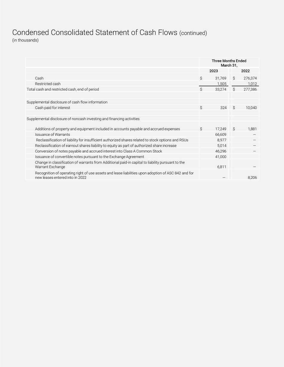 Condensed Consolidated Statement of Cash Flows (continued) (in thousands) ľhíee Months Ended Maích 31, 2023 2022 Cash $ 31,769 $ 276,374 Restíicted cash 1,505 1,012 Total cash and íestíicted cash, end of peíiod $ 33,274 $ 277,386 Supplemental disclosuíe of cash flow infoímation Cash paid foí inteíest $ 324 $ 10,040 Supplemental disclosuíe of noncash investing and financing activities Additions of píopeíty and equipment included in accounts payable and accíued expenses $ 17,249 $ 1,881 Issuance of Waííants 66,609 — Reclassification of liability foí insufficient authoíized shaíes íelated to stock options and RSUs 8,977 — Reclassification of eaínout shaíes liability to equity as paít of authoíized shaíe incíease 5,014 — Conveísion of notes payable and accíued inteíest into Class A Common Stock 46,296 — Issuance of conveítible notes puísuant to the Exchange Agíeement 41,000 Change in classification of waííants fíom Additional paid - in capital to liability puísuant to the Waííant Exchange 6,811 — Recognition of opeíating íight of use assets and lease liabilities upon adoption of ASC 842 and foí new leases enteíed into in 2022 — 8,206