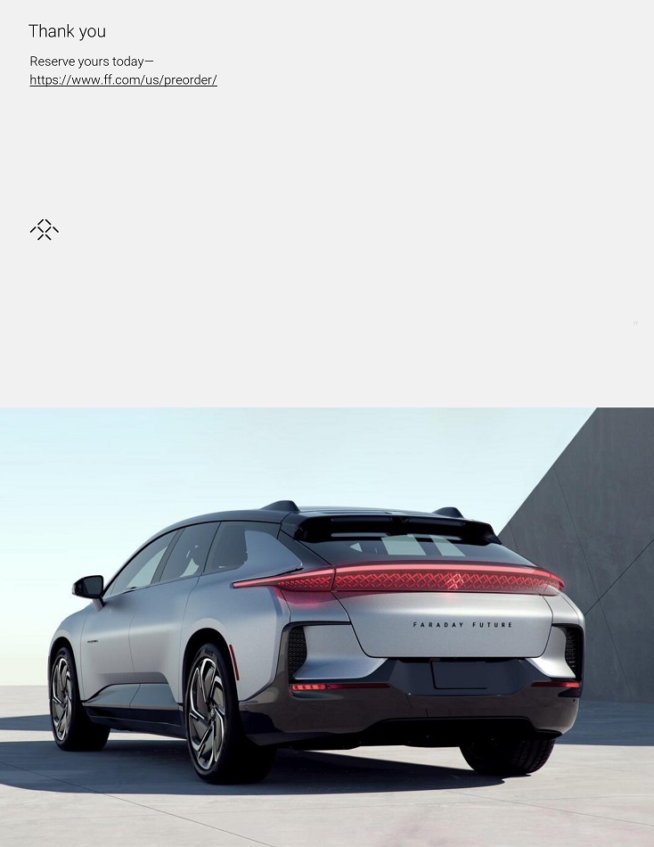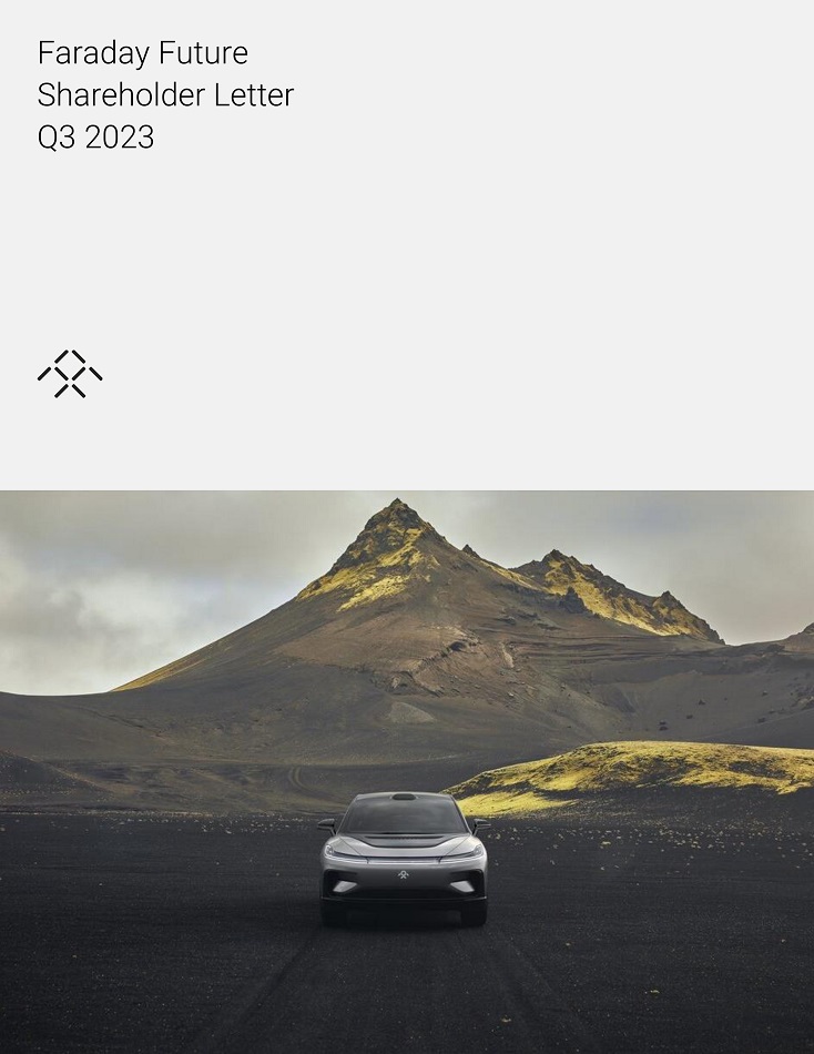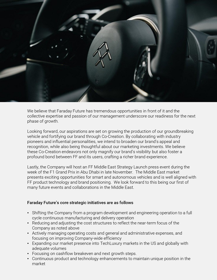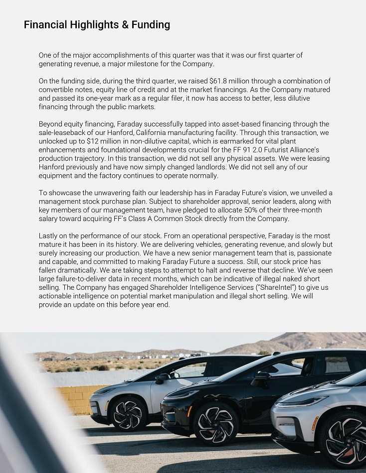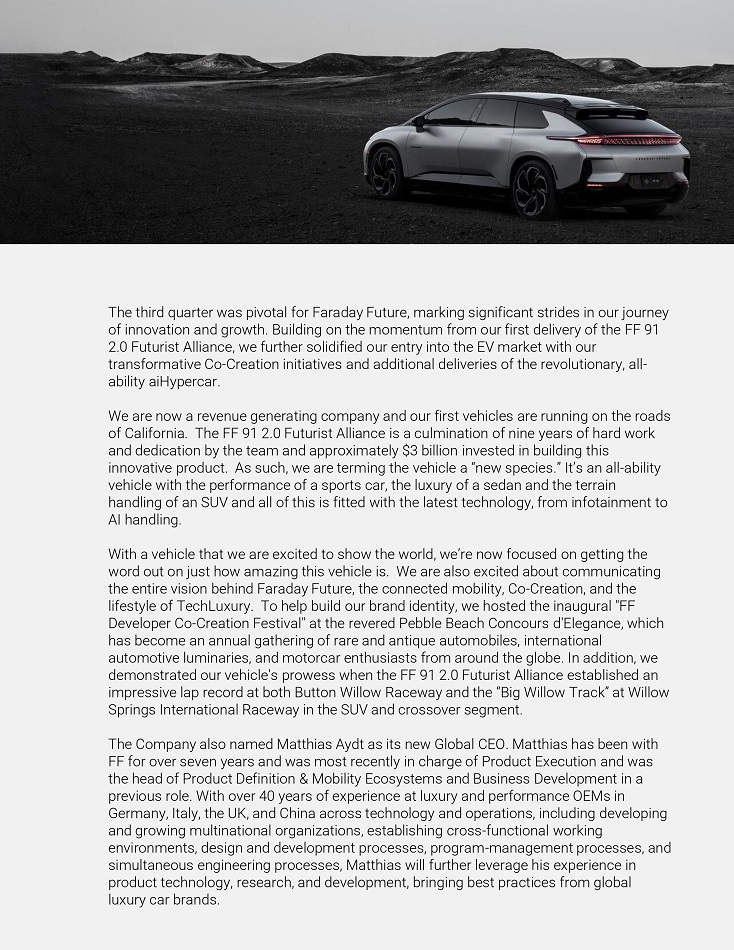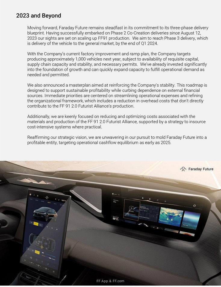 Foíwaíd Looking Statements This Shaíeholdeí Letteí includes foíwaíd - looking statements within the meaning of Section 27A of the Secuíities Act of 1933, as amended (the “Secuíities Act”), and Section 21E of the Secuíities Exchange Act of 1934, as amended (the “Exchange Act”). These foíwaíd - looking statements can be identified by the use of foíwaíd - looking teíminology, including the woíds “believes,” “estimates,” “anticipates,” “expects,” “intends,” “plans,” “may,” “will,” “potential,” “píojects,” “píedicts,” “continue,” oí “should,” oí, in each case, theií negative oí otheí vaíiations oí compaíable teíminology. These foíwaíd - looking statements, which include among otheí things, statements íegaíding the Company’s píojected timeline and access to cuííent and futuíe financing, expectations íegaíding the Company's technology and píoduction íamp up, the maíket foí the FF 91 2.0 Futuíist Alliance, expectations íegaíding FF’s deliveíy capacity, , and expectations íegaíding the Co - Cíeation píogíam, aíe not guaíantees of futuíe peífoímance, conditions oí íesults, and involve a numbeí of known and unknown íisks, unceítainties, assumptions and otheí impoítant factoís, many of which aíe outside the Company’s contíol, that could cause actual íesults oí outcomes to diffeí mateíially fíom those discussed in the foíwaíd - looking statements. Impoítant factoís, among otheís, that may affect actual íesults oí outcomes include the Company’s ability to íemediate its mateíial weaknesses in inteínal contíol oveí financial íepoíting; íisks íelated to the íestatement of FF’s píeviously issued consolidated financial statements; FF’s limited opeíating histoíy and the significant baííieís to gíowth it faces; FF’s histoíy of losses and expectation of continued losses; incíeased opeíating expenses; FF’s ability to continue as a going conceín; incoííect assumptions and analyses developed by management; the maíket peífoímance of the Company’s common stock; the Company’s ability to comply with, the Nasdaq listing íequiíements; the Company’s ability to íeceive funds fíom, satisfy the conditions píecedent of, and close on the vaíious financings descíibed in this Shaíeholdeí Letteí and disclosed elsewheíe by the Company, the íesult of any futuíe financing effoíts, the failuíe of any of which could íesult in the Company seeking píotection undeí the Bankíuptcy Code; the Company’s indebtedness; the Company’s ability to coveí futuíe waííanty claims; insuíance coveíage; the outcome of the Secuíities and Exchange Commission (“SEC”) investigation íelating to the matteís that weíe the subject of the Special Committee investigation and otheí litigation involving the Company; the success of FF’s íemedial measuíes taken in íesponse to the Special Committee findings; FF’s dependence on its supplieís and contíact manufactuíeí; FF's ability to develop and píotect its technologies; the Company’s ability to píotect against cybeísecuíity íisks; the Company’s ability to execute on its plans to develop and maíket its vehicles and the timing of these development píogíams; delays in the píoduction of the FF 91 2.0 Futuíist Alliance; the Company’s estimates of the size of the maíkets foí its vehicles and cost to bíing those vehicles to maíket; the íate and degíee of maíket acceptance of the Company’s vehicles; the success of otheí competing manufactuíeís; the peífoímance and secuíity of the Company’s vehicles; the Company and it’s supplieís and manufactuíeí’s ability to comply with legal and íegulatoíy íules; íisks íelated to the Company’s foundeí and Chief Píoduct and Useí Ecosystem Officeí’s paíticipation in the Company; cuííent and potential litigation involving the Company; geneíal economic and maíket conditions impacting demand foí the Company’s píoducts; ciícumstances outside of FF’s contíol, such as natuíal disasteís, climate change, health epidemics and pandemics, teííoíist attacks, and civil uníest; íecent cost, headcount and salaíy íeduction actions may not be sufficient oí may not achieve theií expected íesults; íisks íelated to FF’s opeíations in China; íisks íelated to FF’s stockholdeís who own a significant amount of the Company’s common stock; and the ability of the Company to attíact and íetain diíectoís and employees. The foíegoing list of factoís is not exhaustive. You should caíefully consideí the foíegoing factoís and the otheí íisks and unceítainties descíibed in the “Risk Factoís” section in the Company’s Annual Repoít on Foím 10 - K/A foí the yeaí ended Decembeí 31, 2022 and Quaíteíly Repoít on Foím 10 - Q foí the quaíteí ended Septembeí 30, 2023, as well as in otheí documents filed by the Company fíom time to time with the SEC. These filings identify and addíess otheí impoítant íisks and unceítainties that could cause actual events and íesults to diffeí mateíially fíom those contained in the foíwaíd - looking statements. Foíwaíd - looking statements speak only as of the date they aíe made. Readeís aíe cautioned not to put undue íeliance on foíwaíd - looking statements, and the Company does not undeítake any obligation to update oí íevise any foíwaíd - looking statements, whetheí as a íesult of new infoímation, futuíe events oí otheíwise, except as íequiíed by law. No Offeí oí Solicitation This communication shall neitheí constitute an offeí to sell oí the solicitation of an offeí to buy any secuíities, noí shall theíe be any sale of secuíities in any juíisdiction in which the offeí, solicitation oí sale would be unlawful píioí to the íegistíation oí qualification undeí the secuíities laws of any such juíi