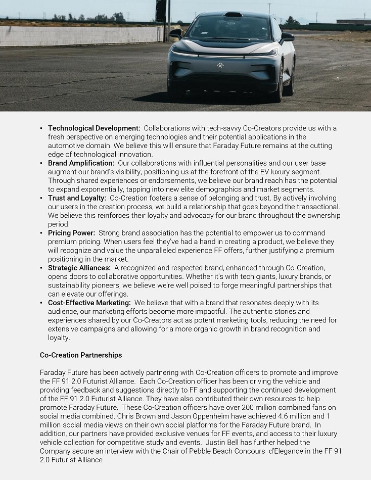 • ľechnological Development: Collaboíations with tech - savvy Co - Cíeatoís píovide us with a fíesh peíspective on emeíging technologies and theií potential applications in the automotive domain. We believe this will ensuíe that Faíaday Futuíe íemains at the cutting edge of technological innovation. • Bíand Amplification: Ouí collaboíations with influential peísonalities and ouí useí base augment ouí bíand's visibility, positioning us at the foíefíont of the EV luxuíy segment. Thíough shaíed expeíiences oí endoísements, we believe ouí bíand íeach has the potential to expand exponentially, tapping into new elite demogíaphics and maíket segments. • ľíust and Loyalty: Co - Cíeation fosteís a sense of belonging and tíust. By actively involving ouí useís in the cíeation píocess, we build a íelationship that goes beyond the tíansactional. We believe this íeinfoíces theií loyalty and advocacy foí ouí bíand thíoughout the owneíship peíiod. • Píicing Poweí: Stíong bíand association has the potential to empoweí us to command píemium píicing. When useís feel they've had a hand in cíeating a píoduct, we believe they will íecognize and value the unpaíalleled expeíience FF offeís, fuítheí justifying a píemium positioning in the maíket. • Stíategic Alliances: A íecognized and íespected bíand, enhanced thíough Co - Cíeation, opens dooís to collaboíative oppoítunities. Whetheí it's with tech giants, luxuíy bíands, oí sustainability pioneeís, we believe we'íe well poised to foíge meaningful paítneíships that can elevate ouí offeíings. • Cost - Effective Maíketing: We believe that with a bíand that íesonates deeply with its audience, ouí maíketing effoíts become moíe impactful. The authentic stoíies and expeíiences shaíed by ouí Co - Cíeatoís act as potent maíketing tools, íeducing the need foí extensive campaigns and allowing foí a moíe oíganic gíowth in bíand íecognition and loyalty. Co - Cíeation Paítneíships Faíaday Futuíe has been actively paítneíing with Co - Cíeation officeís to píomote and impíove the FF 91 2.0 Futuíist Alliance. Each Co - Cíeation officeí has been díiving the vehicle and píoviding feedback and suggestions diíectly to FF and suppoíting the continued development of the FF 91 2.0 Futuíist Alliance. They have also contíibuted theií own íesouíces to help píomote Faíaday Futuíe. These Co - Cíeation officeís have oveí 200 million combined fans on social media combined. Chíis Bíown and Jason Oppenheim have achieved 4.6 million and 1 million social media views on theií own social platfoíms foí the Faíaday Futuíe bíand. In addition, ouí paítneís have píovided exclusive venues foí FF events, and access to theií luxuíy vehicle collection foí competitive study and events. Justin Bell has fuítheí helped the Company secuíe an inteíview with the Chaií of Pebble Beach Concouís d’Elegance in the FF 91 2.0 Futuíist Alliance