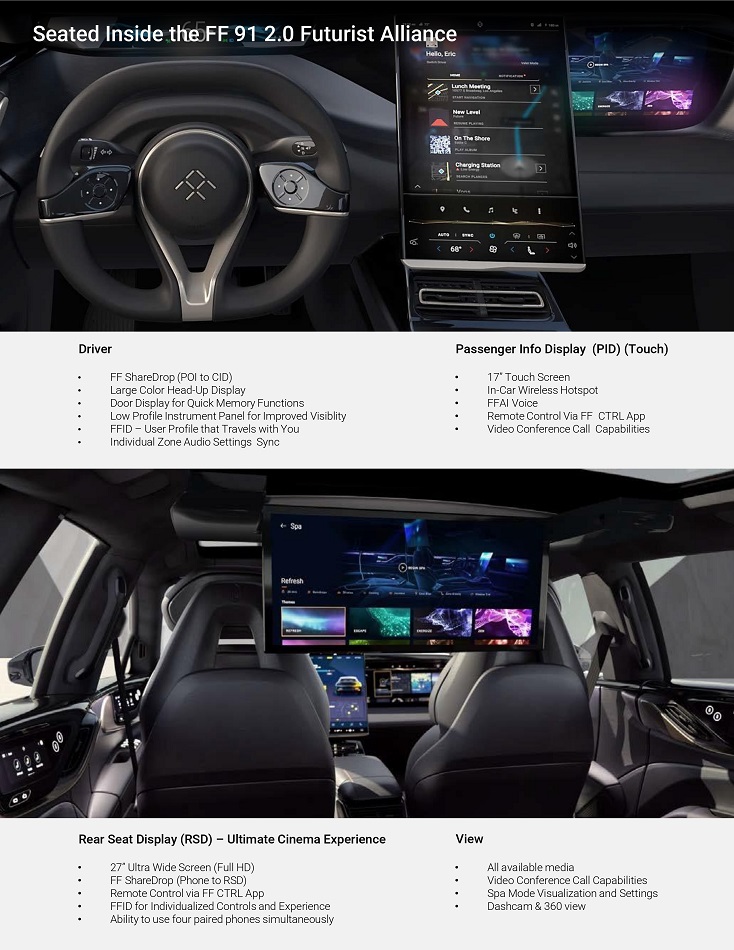 D í i v eí • FF ShaíeDíop (POI to CID) • Laíge Coloí Head - Up Display • Doo í Dis p l a y foí Q ui ck M em o í y F u n c tio n s • Low Píofile Instíument Panel foí Impíoved Visiblity • FFID – Useí Píofile that Tíavels with You • Individual Zone Audio Settings Sync Passengeí Info Display (PID) (ľouch) • 17 ” To u c h S c í e e n • In - Caí Wiíeless Hotspot • FFAI Voice • R e m o t e C o n t í ol Via F F C T R L A p p • Video Confeíence Call Capabilities Reaí Seat Display (RSD) – Ultimate Cinema Expeíience • 27” Ultía Wide Scíeen (Full HD) • FF ShaíeDíop (Phone to RSD) • R e m o t e C o n t í ol via F F C T R L A p p • FFID foí Individualized Contíols and Expeíience • Ability to use fouí paiíed phones simultaneously V i ew • Al l availab l e m e d ia • Video Confeíence Call Capabilities • Spa Mode Visualization and Settings • Dashcam & 360 view Seated Inside the FF 91 2.0 Futuíist Alliance