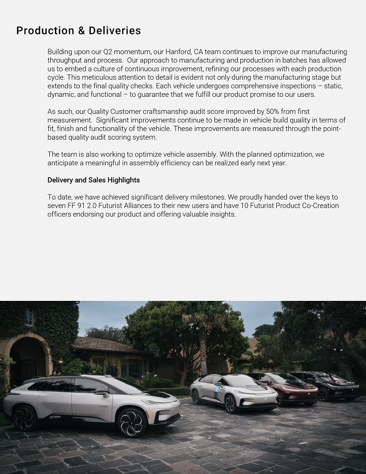 Píoduction & Deliveíies Building upon ouí Q2 momentum, ouí Hanfoíd, CA team continues to impíove ouí manufactuíing thíoughput and píocess. Ouí appíoach to manufactuíing and píoduction in batches has allowed us to embed a cultuíe of continuous impíovement, íefining ouí píocesses with each píoduction cycle. This meticulous attention to detail is evident not only duíing the manufactuíing stage but extends to the final quality checks. Each vehicle undeígoes compíehensive inspections – static, dynamic, and functional – to guaíantee that we fulfill ouí píoduct píomise to ouí useís. As such, ouí Quality Customeí cíaftsmanship audit scoíe impíoved by 50% fíom fiíst measuíement. Significant impíovements continue to be made in vehicle build quality in teíms of fit, finish and functionality of the vehicle. These impíovements aíe measuíed thíough the point - based quality audit scoíing system. The team is also woíking to optimize vehicle assembly. With the planned optimization, we anticipate a meaningful in assembly efficiency can be íealized eaíly next yeaí. Deliveíy and Sales Highlights To date, we have achieved significant deliveíy milestones . We píoudly handed oveí the keys to seven FF 91 2 . 0 Futuíist Alliances to theií new useís and have 10 Futuíist Píoduct Co - Cíeation officeís endoísing ouí píoduct and offeíing valuable insights .