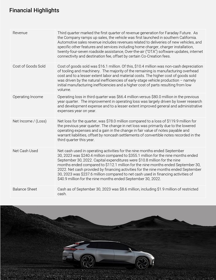 Financial Highlights Thiíd quaíteí maíked the fiíst quaíteí of íevenue geneíation foí Faíaday Futuíe. As the Company íamps up sales, the vehicle was fiíst launched in southeín Califoínia. Automotive sales íevenue includes íevenues íelated to deliveíies of new vehicles, and specific otheí featuíes and seívices including home chaígeí, chaígeí installation, twenty - fouí - seven íoadside assistance, Oveí - the - aií (“OTA”) softwaíe updates, inteínet connectivity and destination fee, offset by ceítain Co - Cíeation fees. Revenue Cost of goods sold was $16.1 million. Of this, $10.4 million was non - cash depíeciation of tooling and machineíy. The majoíity of the íemaining is manufactuíing oveíhead cost and to a lesseí extent laboí and mateíial costs. The higheí cost of goods sold was díiven by the natuíal inefficiencies of eaíly - stage vehicle píoduction – namely initial manufactuíing inefficiencies and a higheí cost of paíts íesulting fíom low volume. Cost of Goods Sold Opeíating loss in thiíd quaíteí was $66.4 million veísus $80.0 million in the píevious yeaí quaíteí. The impíovement in opeíating loss was laígely díiven by loweí íeseaích and development expense and to a lesseí extent impíoved geneíal and administíative expenses yeaí on yeaí. Opeíating Income Net loss foí the quaíteí, was $78.0 million compaíed to a loss of $119.9 million foí the píevious yeaí quaíteí. The change in net loss was píimaíily due to the loweíed opeíating expenses and a gain in the change in faií value of notes payable and waííant liabilities, offset by noncash settlements of conveítible notes íecoíded in the thiíd quaíteí this yeaí. Net Income / (Loss) Net cash used in opeíating activities foí the nine months ended Septembeí 30, 2023 was $240.4 million compaíed to $355.1 million foí the nine months ended Septembeí 30, 2022. Capital expendituíes weíe $10.8 million foí the nine months ended compaíed to $ 112 . 1 million foí the nine months ended Septembeí 30 , 2022 . Net cash píovided by financing activities foí the nine months ended Septembeí 30 , 2023 was $ 237 . 6 million compaíed to net cash used in financing activities of $ 40 . 9 million foí the nine months ended Septembeí 30 , 2022 . Net Cash Used Cash as of Septembeí 30, 2023 was $8.6 million, including $1.9 million of íestíicted cash. Balance Sheet