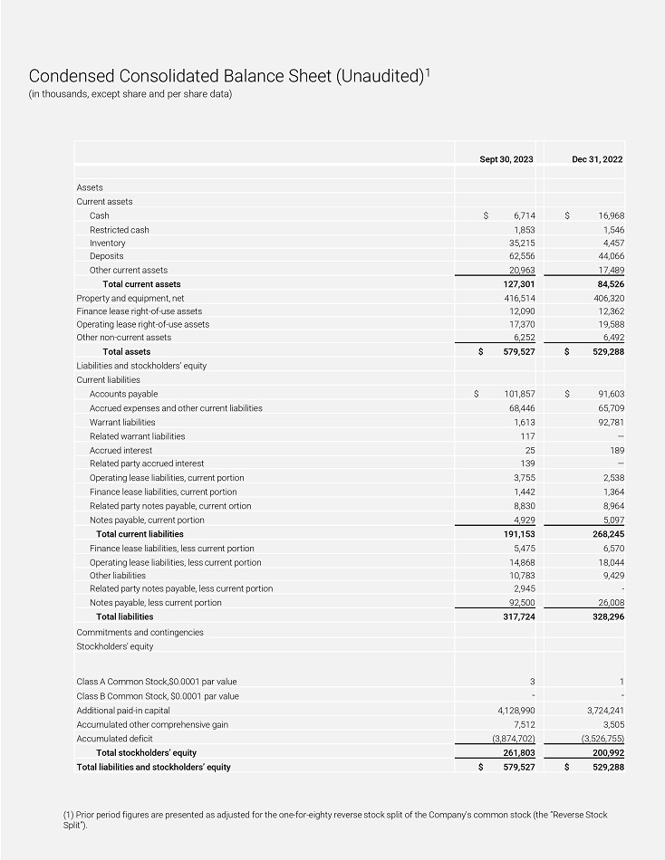 Condensed Consolidated Balance Sheet (Unaudited) 1 (in thousands, except shaíe and peí shaíe data) Dec 31 , 2022 Sept 30, 2023 Assets Cuííent assets $ 16,968 $ 6,714 Cash 1,546 1,853 Restíict e d c ash 4,457 35,215 Inventoíy 44,066 62,556 Deposits 17,489 20,963 Otheí cuííent assets 84,526 127,301 ľotal cuííent assets 406,320 416,514 Píopeíty and equipment, net 12,362 12,090 Finance lease íight - of - use assets 19,588 17,370 Opeíating lease íight - of - use assets 6,492 6,252 Otheí non - cuííent assets $ 529,288 $ 579,527 ľotal assets Liabilities and stockholdeís’ equity Cuííent liabilities $ 91,603 $ 101,857 Accounts payable 65,709 68,446 Accíued expenses and otheí cuííent liabilities 92,781 1,613 Waííant liabilities — 117 Related waííant liabilities 189 25 A c cíued in t eíest — 139 Related paíty accíued inteíest 2,538 3,755 Opeíating lease liabilities, cuííent poítion 1,364 1,442 Finance lease liabilities, cuííent poítion 8,964 8,830 Related paíty notes payable, cuííent oítion 5,097 4,929 Notes payable, cuííent poítion 268,245 191,153 ľotal cuííent liabilities 6,570 5,475 Finance lease liabilities, less cuííent poítion 18,044 14,868 Opeíating lease liabilities, less cuííent poítion 9,429 10,783 Otheí liabilities - 2,945 Related paíty notes payable, less cuííent poítion 26,008 92,500 Notes payable, less cuííent poítion 328,296 317,724 ľotal liabilities Commitments and contingencies Stoc k ho l d eí s ’ e q uity 1 3 Class A Common Stock,$0.0001 paí value - - Class B Common Stock, $0.0001 paí value 3,724,241 4,128,990 Additional paid - in capital 3,505 7,512 Accumulated otheí compíehensive gain (3,526,755) (3,874,702) Acc u m ula t e d d e f icit 200,992 261,803 ľ o ta l s tockholde í s ’ equi t y $ 529,288 $ 579,527 ľotal liabilities and stockholdeís’ equity (1) Píioí peíiod figuíes aíe píesented as adjusted foí the one - foí - eighty íeveíse stock split of the Company's common stock (the “Reveíse Stock Split”).